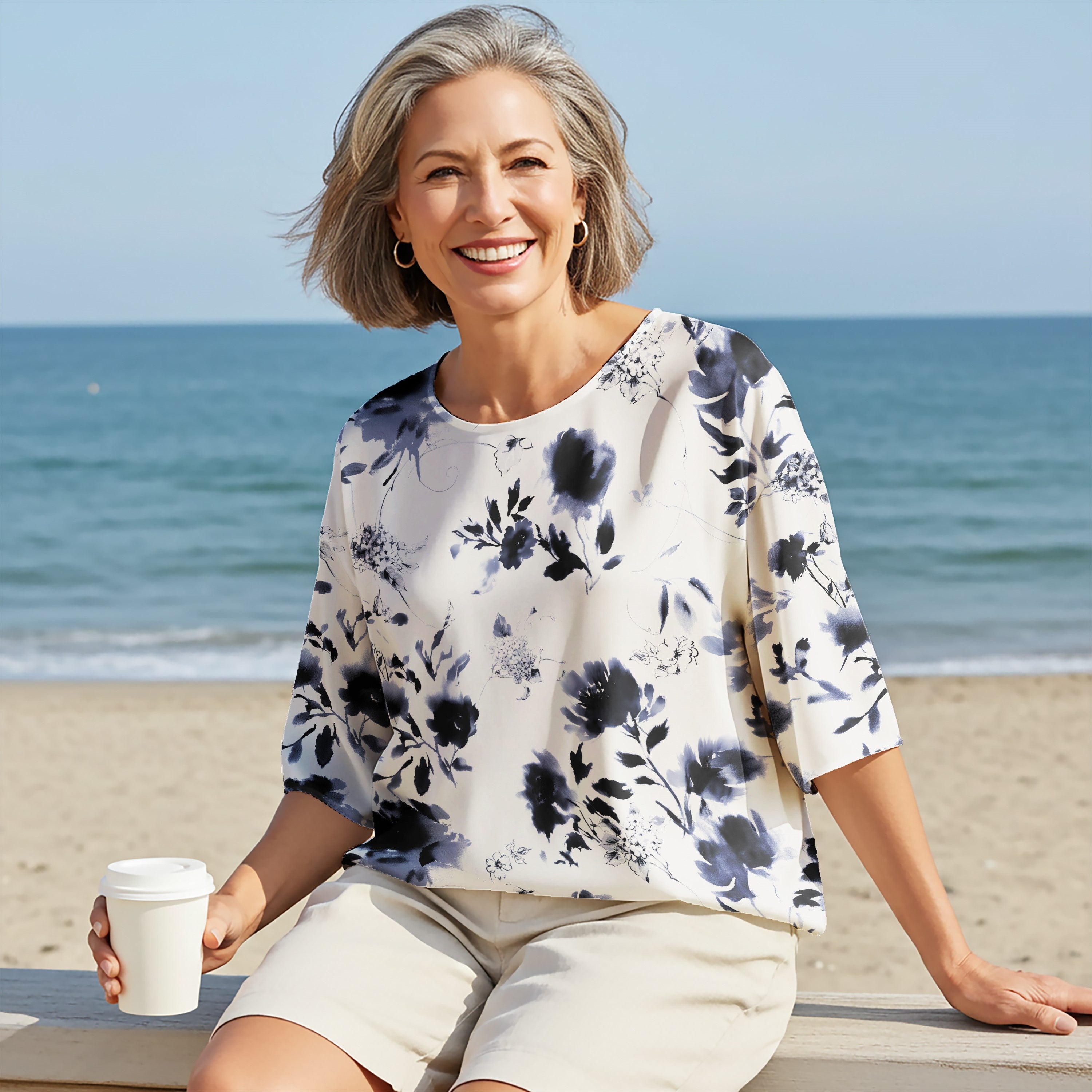 Womens White Casual Blouse Elbow Sleeves Round Neck Button-Back 100% Lyocell White Aloha Eastern Ink Charm