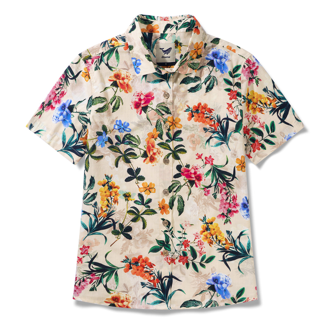 Radiance Florale Chemise à Manches Courtes Boutonnée 100% Coton pour Femmes Beige Aloha Hawaïenne