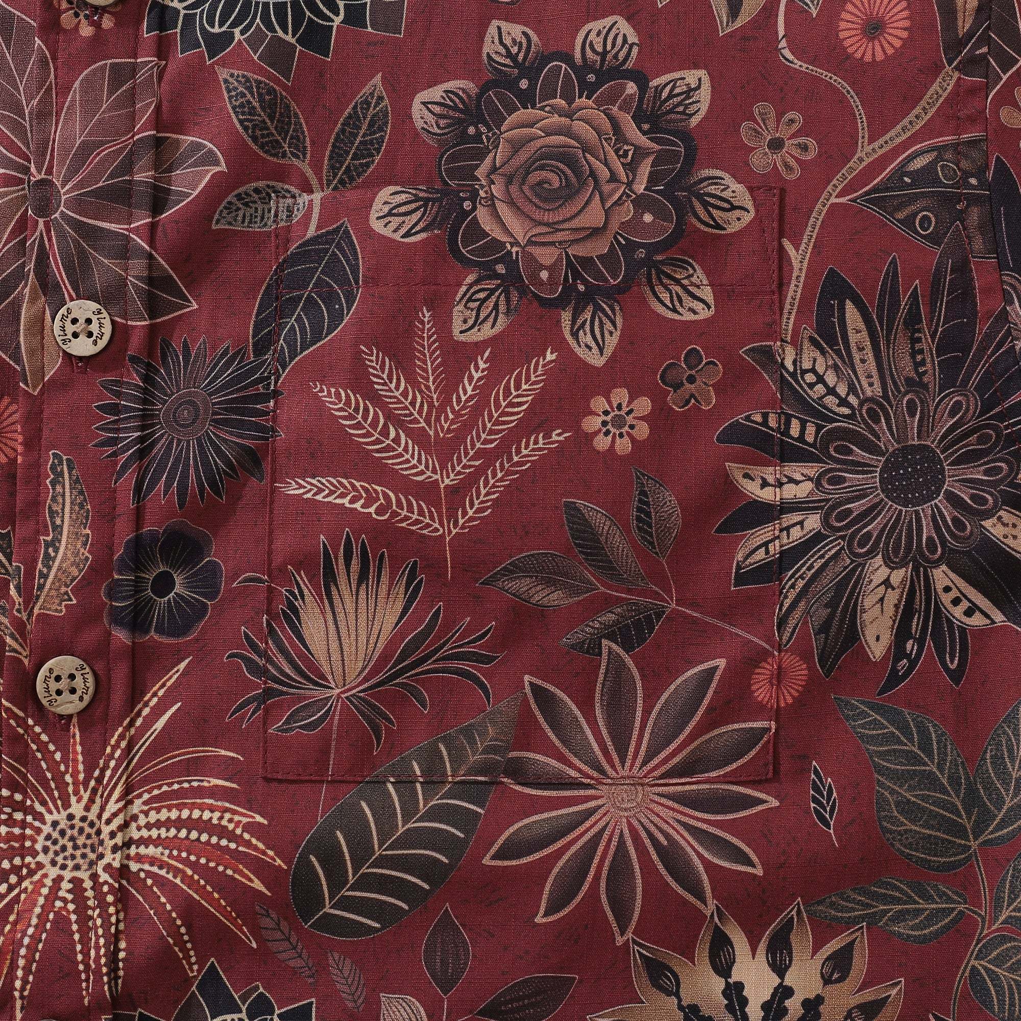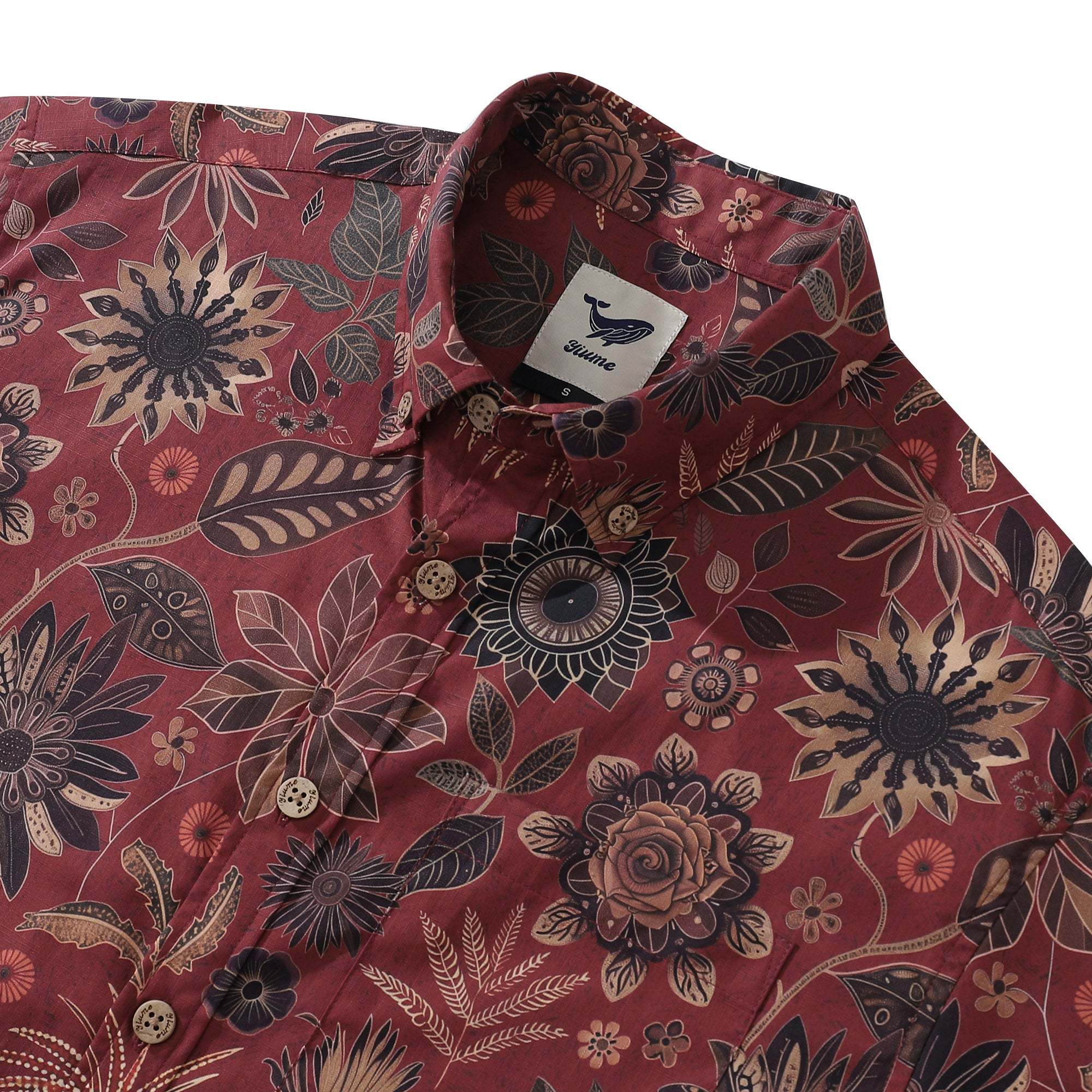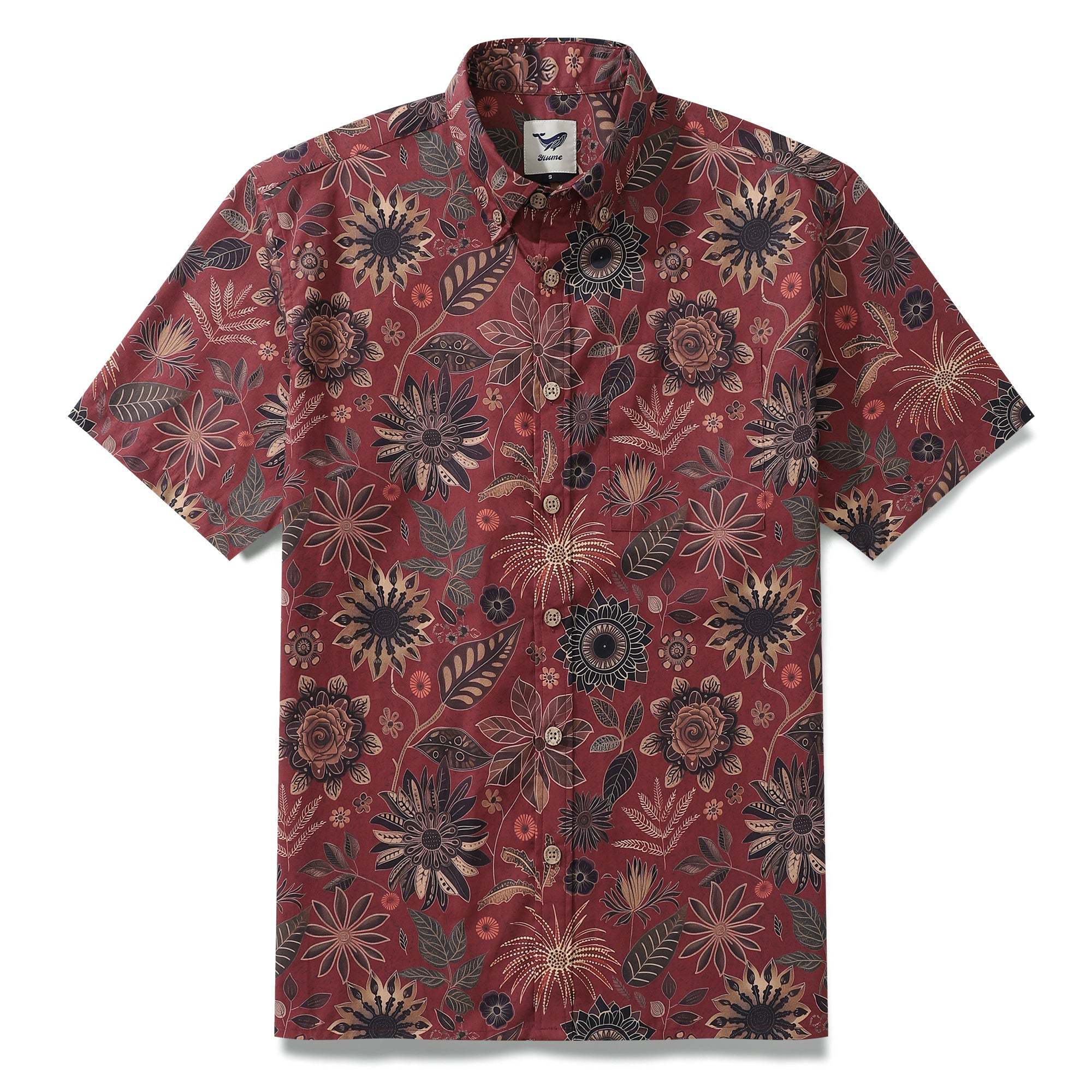 Sur un fond rouge vin profond, des fleurs s'épanouissent à des profondeurs variées, telle une galaxie d'étoiles dans un jardin. Que ce soit pour un après-midi de détente ou un banquet en soirée, cette chemise imprimée, à la fois classique et moderne, est parfaite. Ensemble, découvrons les secrets de ce jardin.