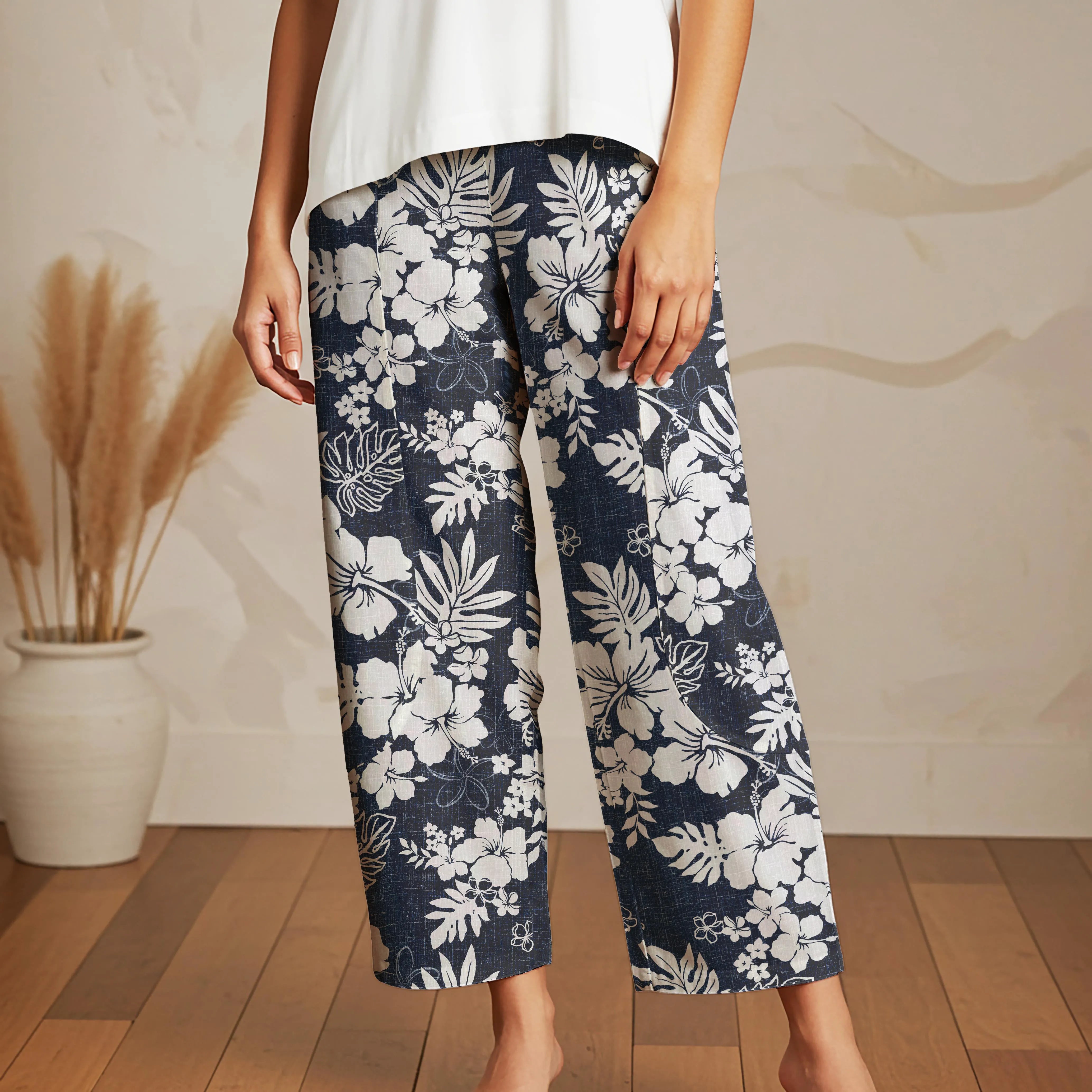 Women Casual Ankle Pants Lounge Elastic Waist with Pockets 93% Lyocell, 7% Linen Blue Aloha Summer Whispers - Hawaiian-inspired Artistic Shirt