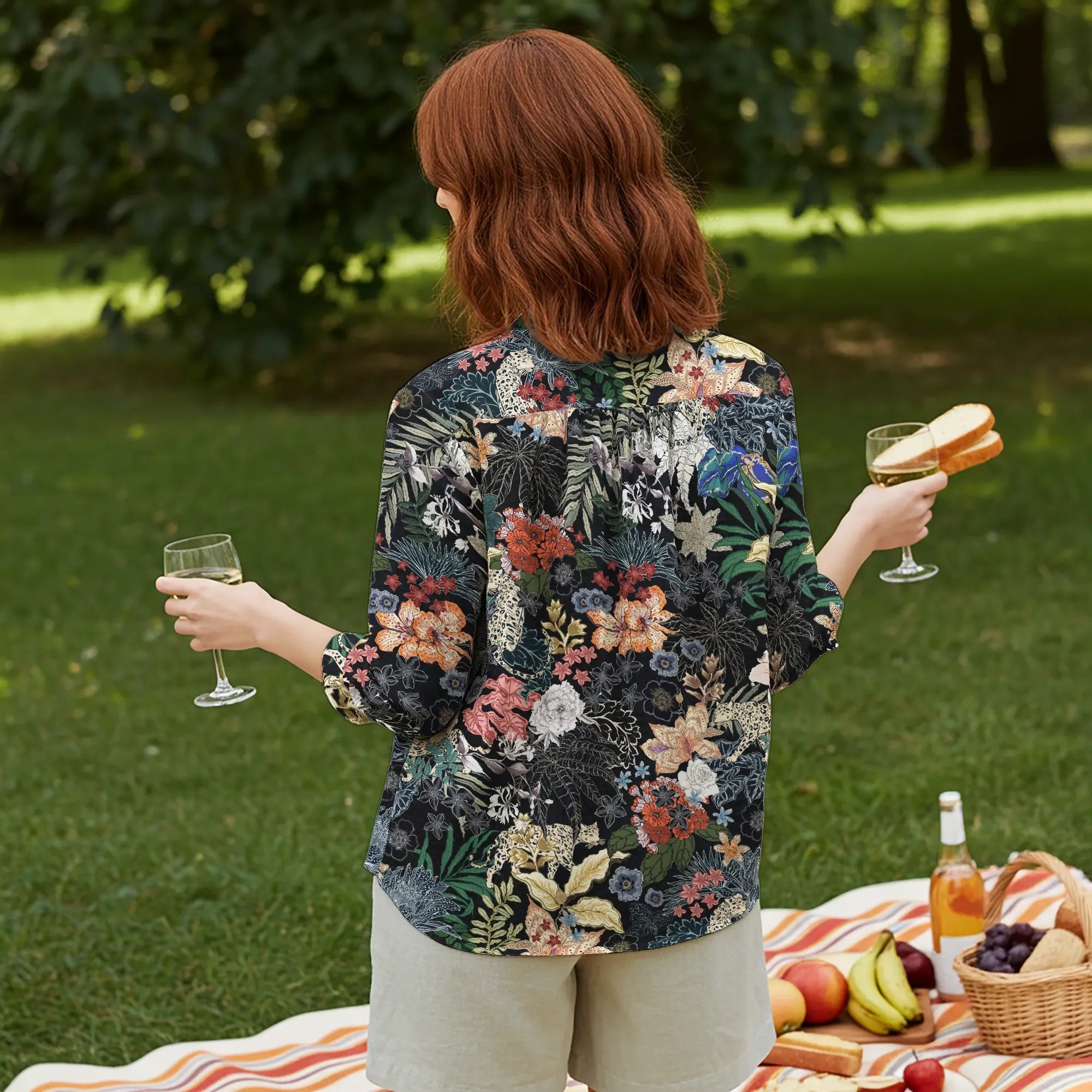 Women Casual Blouse 3/4 Sleeve V-neck Shirt Collar 95% Lyocell, 5% Linen Black Aloha The Night Jungle Exploring