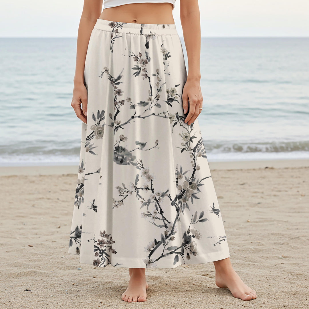 Women Casual Maxi Skirt Long Elastic Waist with Pockets 100% Cotton Gray Aloha Tranquil Ink Floral Art