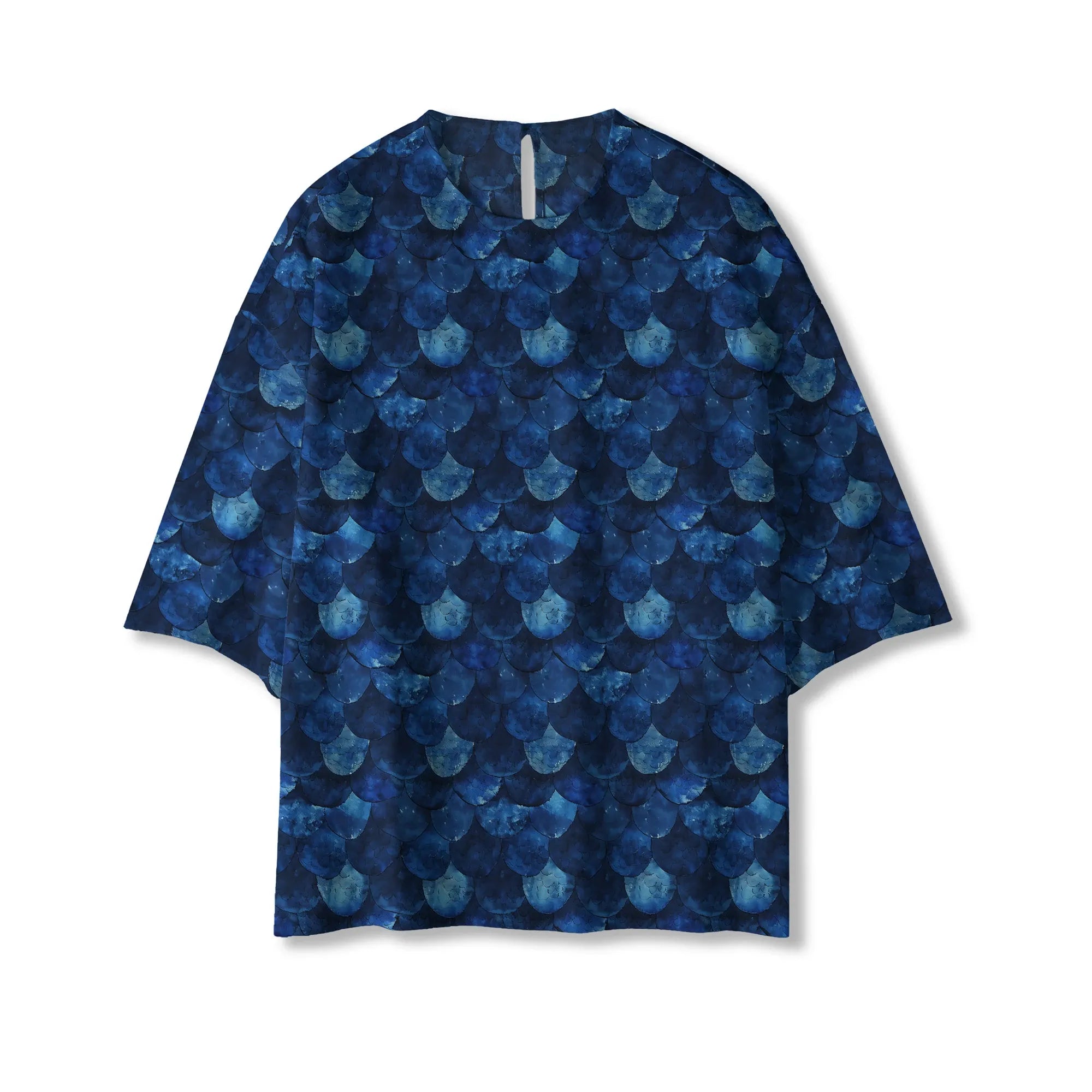 Women's Casual Blouse Elbow Sleeve Crew Neck Button-Back 95% Lyocell, 5% Linen Blue Aloha Deep Sea Dragon Scales
