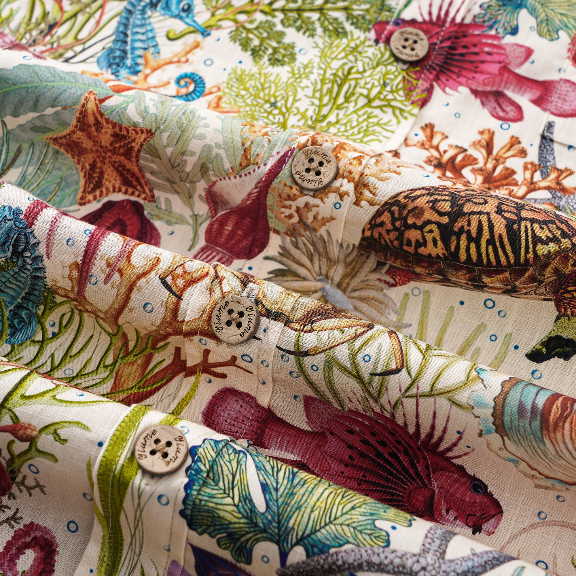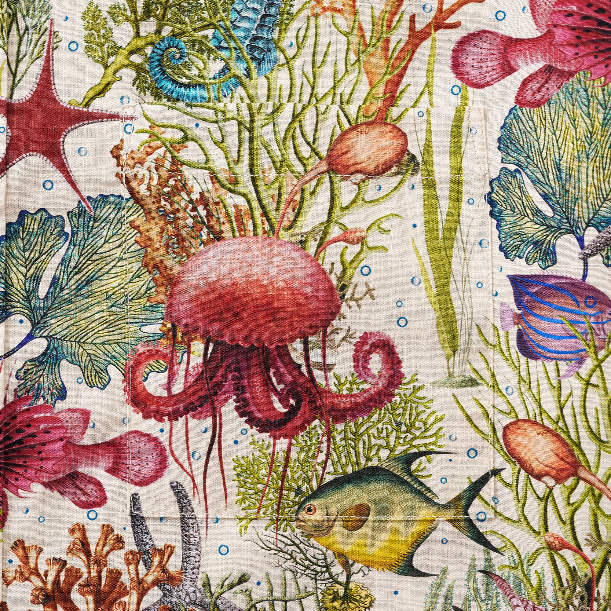 Plongez dans les profondeurs de l'océan avec ce modèle d'inspiration vintage. Sur fond beige, il met en valeur des coraux éclatants, des verts marins et une faune marine ludique comme des méduses, des poulpes et des étoiles de mer. Rehaussé de bulles bleues, ce t-shirt allie charme rétro et merveilles sous-marines, offrant un hommage intemporel à la beauté de la mer. Parfait pour ceux qui apprécient un style artistique inspiré de la nature.