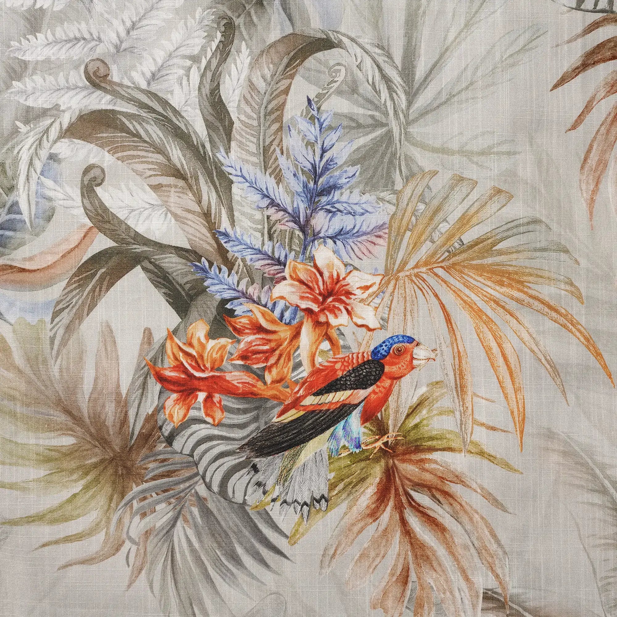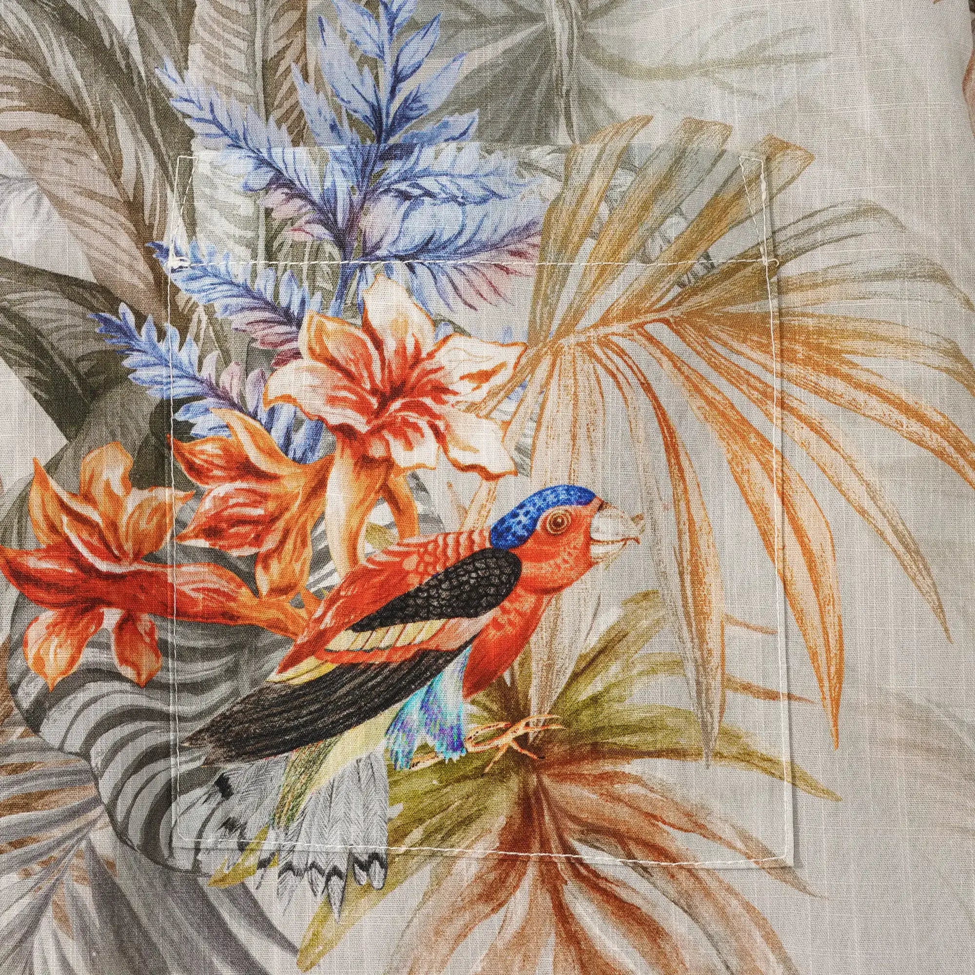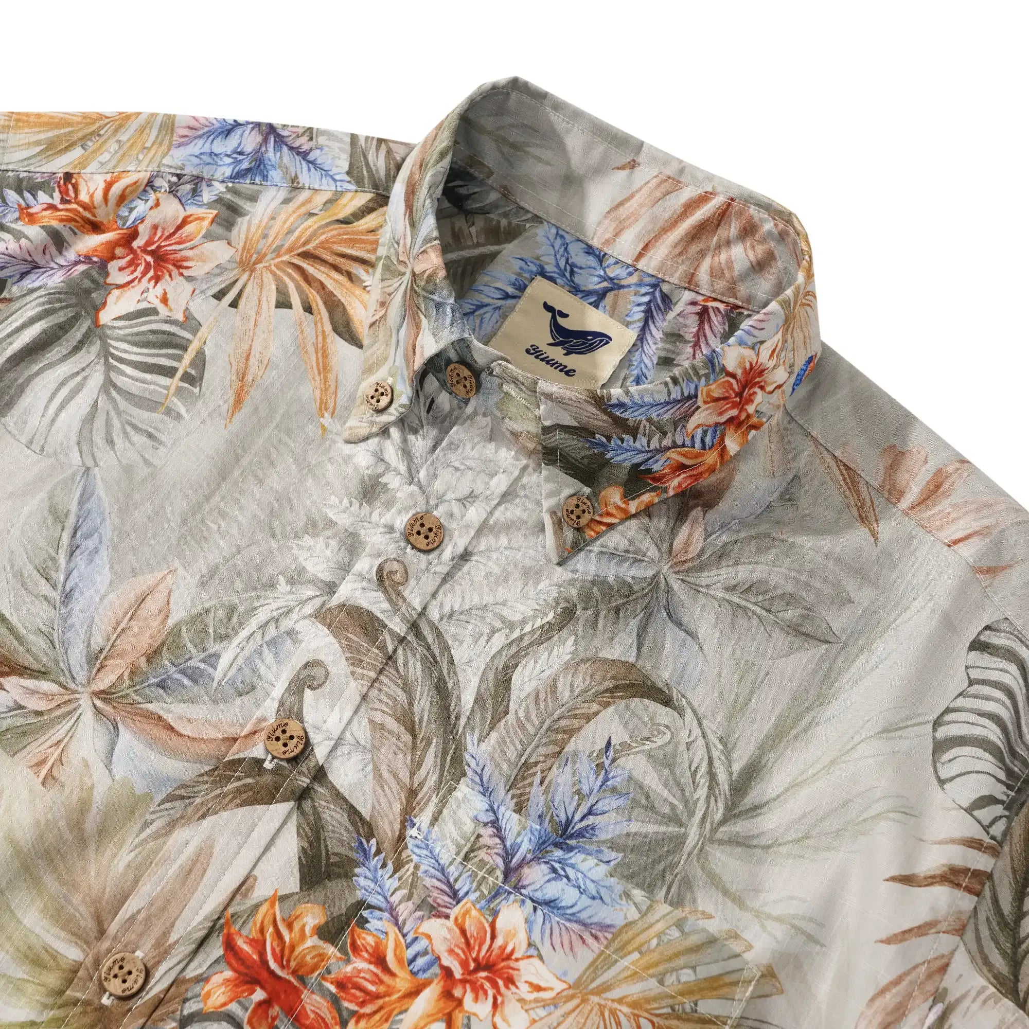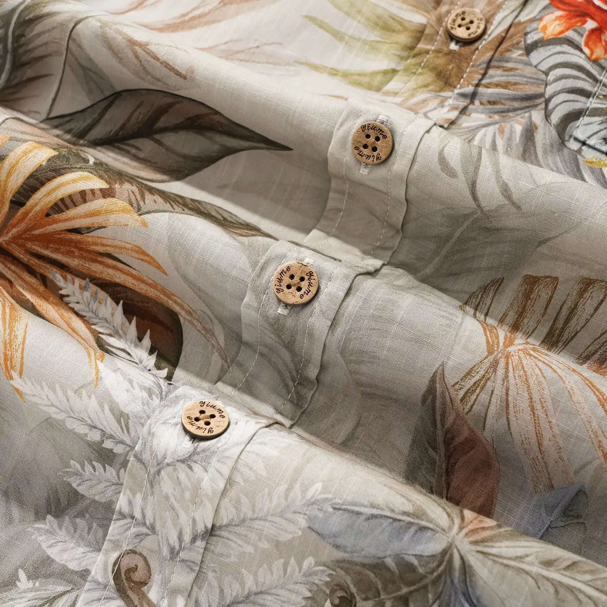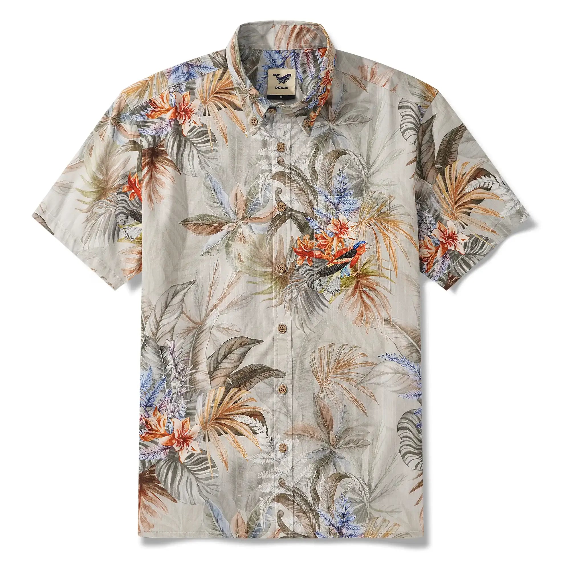 Experience the tranquility of a misty morning in this Hawaiian-inspired shirt. Tropical leaves in varying hues of green, vibrant flowers in orange and pink, and colorful birds ready to take flight create a lush paradise. This shirt captures the essence of a vibrant jungle with its rich textures and lively imagery.