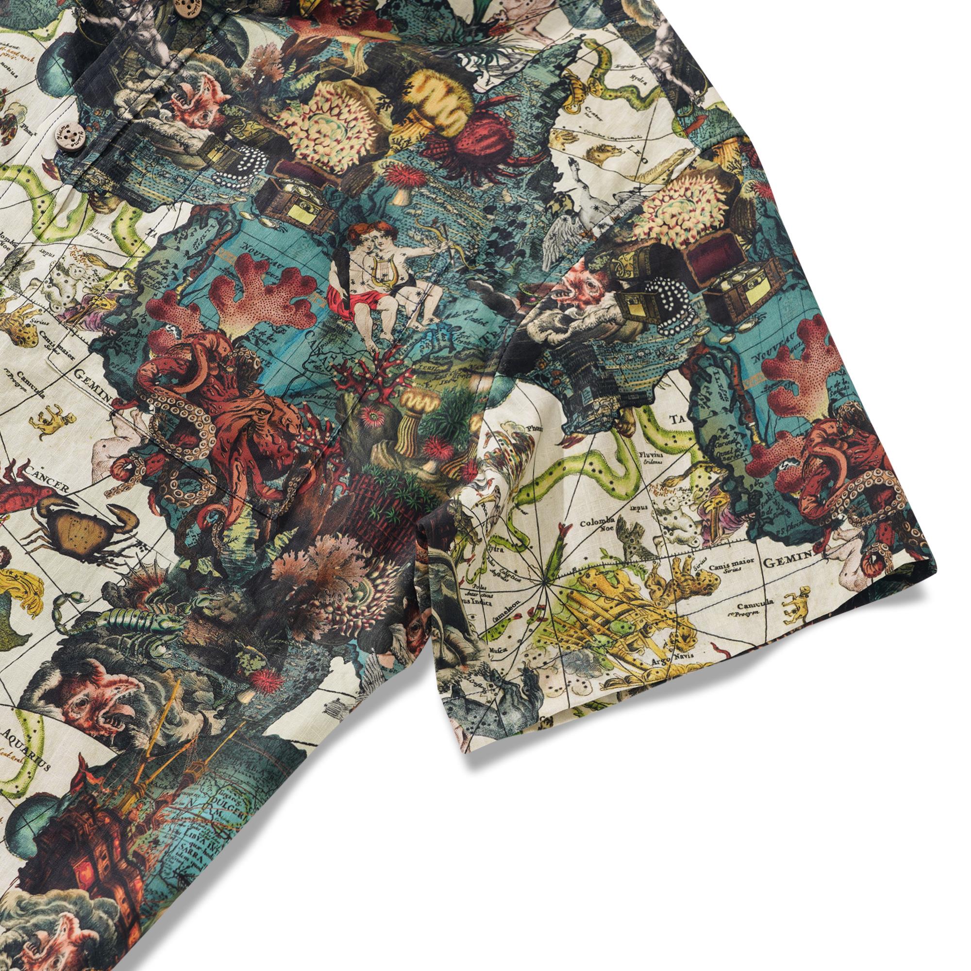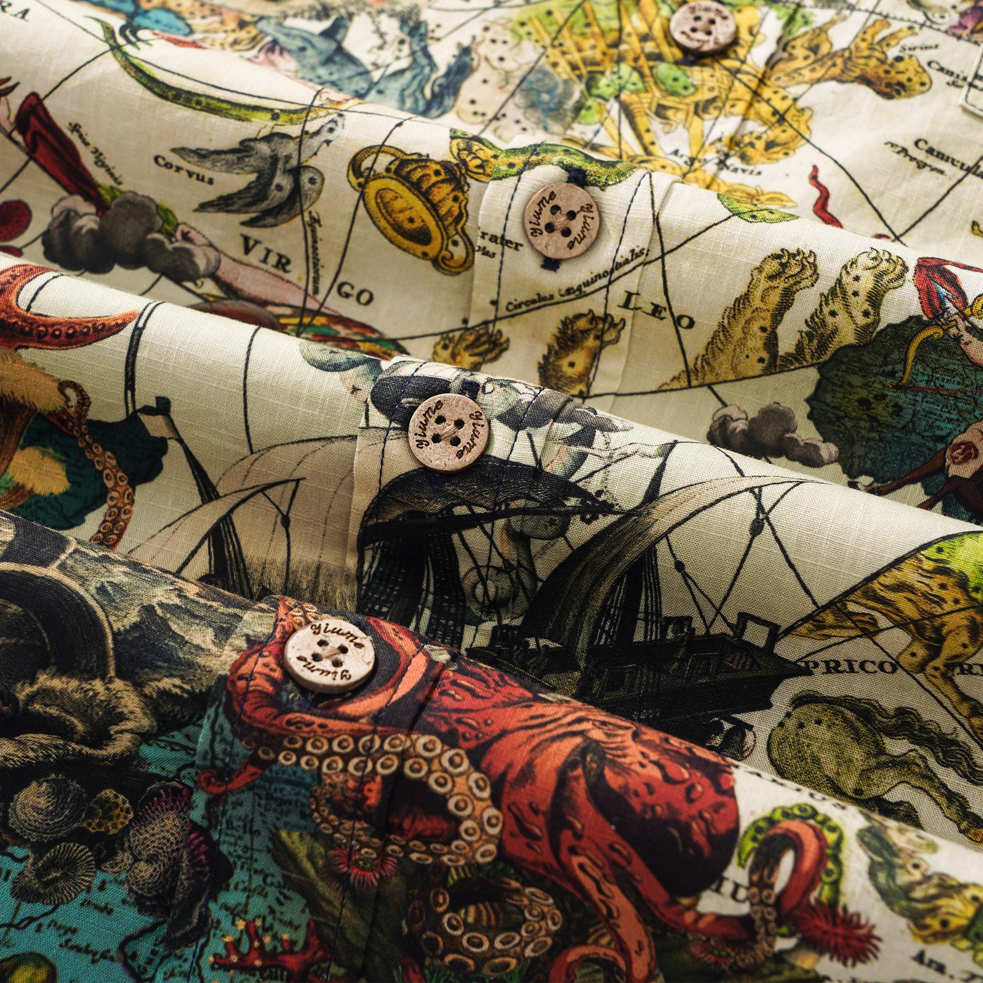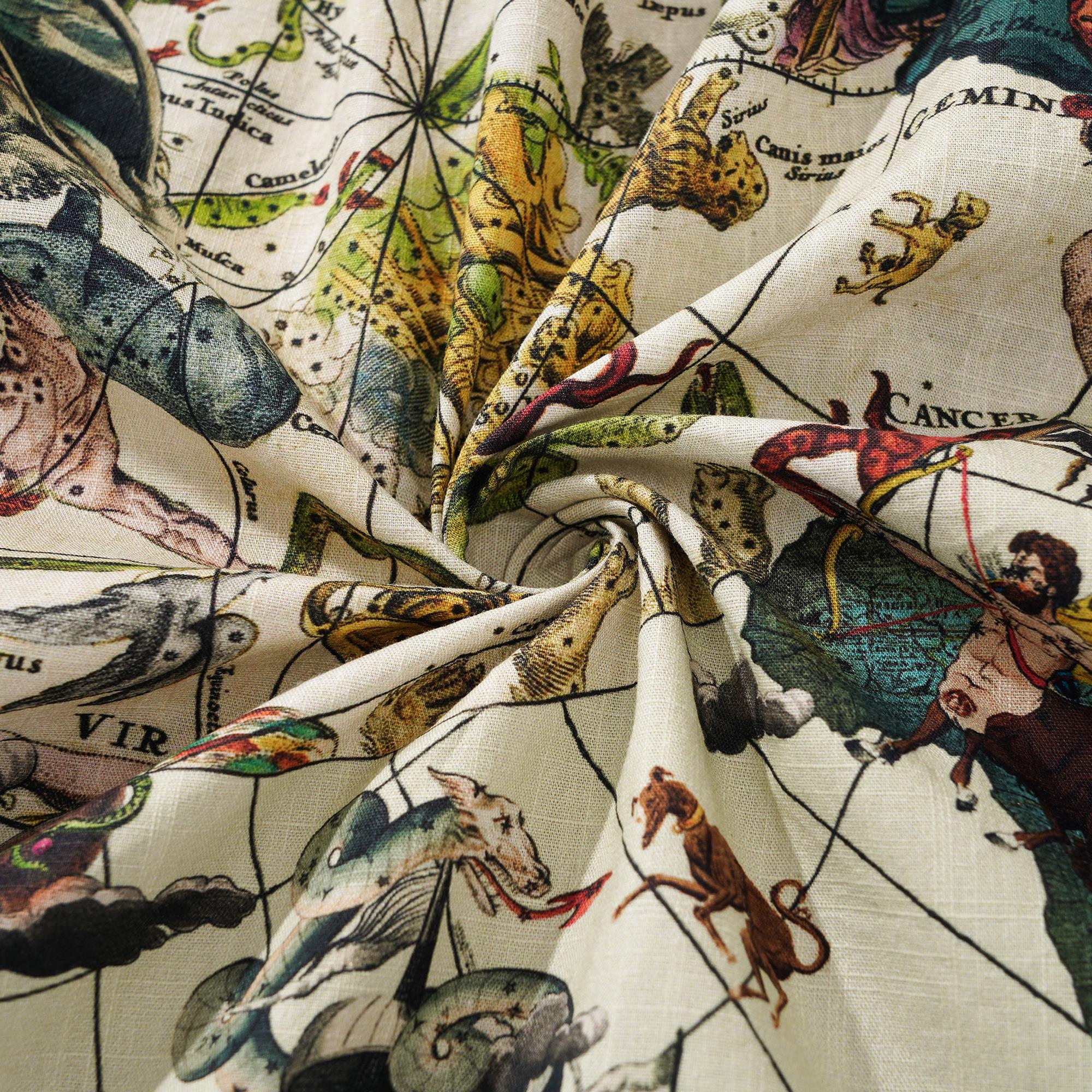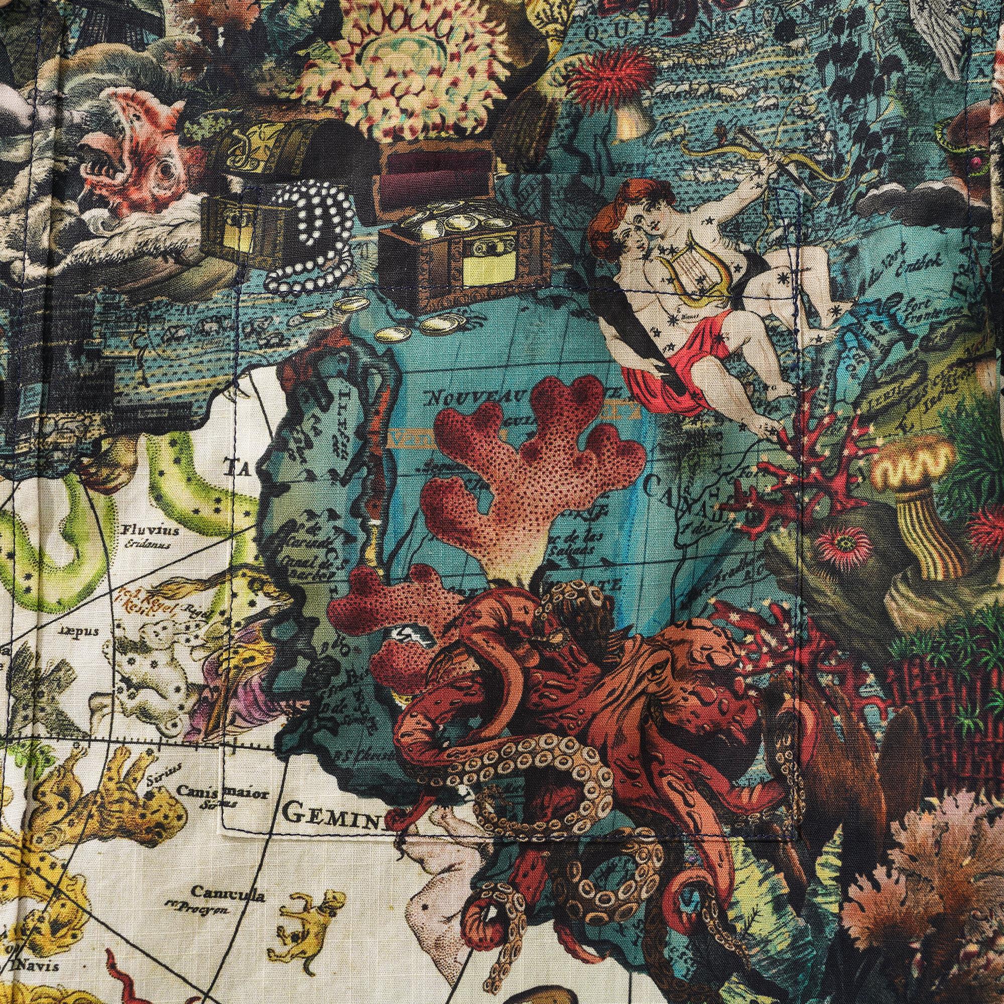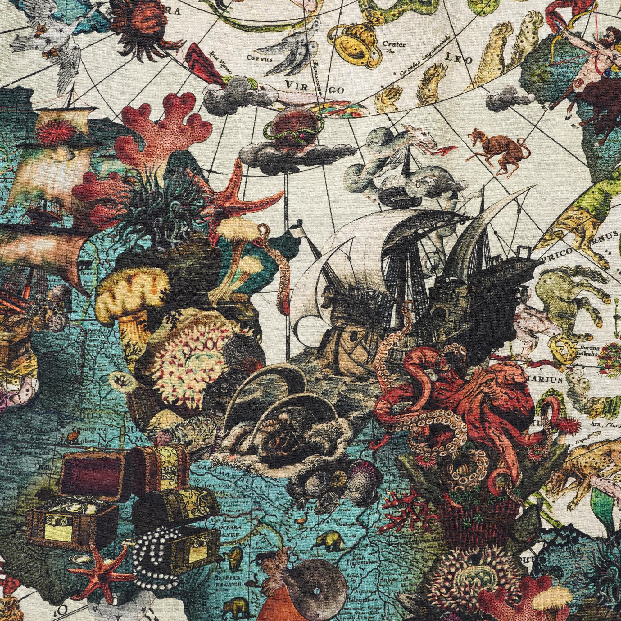 Ce motif présente une riche palette de couleurs de rouges profonds, de bleus et de blancs, rehaussés de touches de jaune, s'inspirant d'un mélange de divers systèmes mythologiques. Des éléments tels qu'un navire coulé rappelant les pirates des Caraïbes, une boussole, des bijoux et des créatures marines exotiques des profondeurs s'harmonisent harmonieusement. S'inspirant du serpent qui encercle le monde de la mythologie nordique et des nymphes marines de la mythologie grecque vivant sur des îles isolées, ce motif capture une fusion d'inspiration mythologique. Les motifs complexes des arts décoratifs classiques, ainsi que la représentation fantastique de scènes et de créatures surréalistes de l'art fantastique, ont inspiré l'artiste à l'origine de ce motif Island Star. Le résultat est un mélange harmonieux de beauté, d'imagination et de récits captivants.