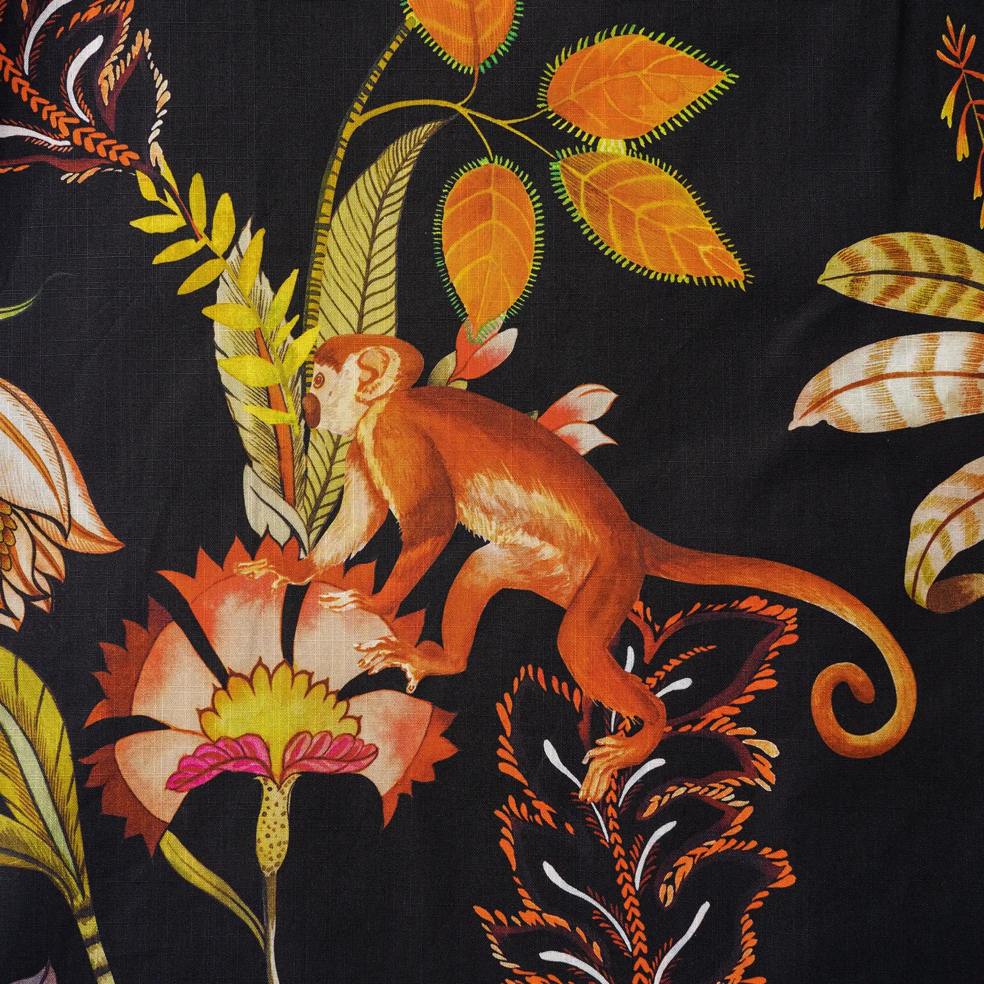 Step into the vibrant tropical jungle on a backdrop of deep black night with our vivid shirt. Lush flowers bloom boldly in fiery hues and soft pastels, intertwining with lush greens and golden leaves. Playful monkeys frolic amidst, injecting a lively charm. This design captures the essence of a tranquil jungle night, allowing you to feel the breezy air and joyful spirit hidden within the foliage. Embrace the unique wild and romantic vibes with every wear.
