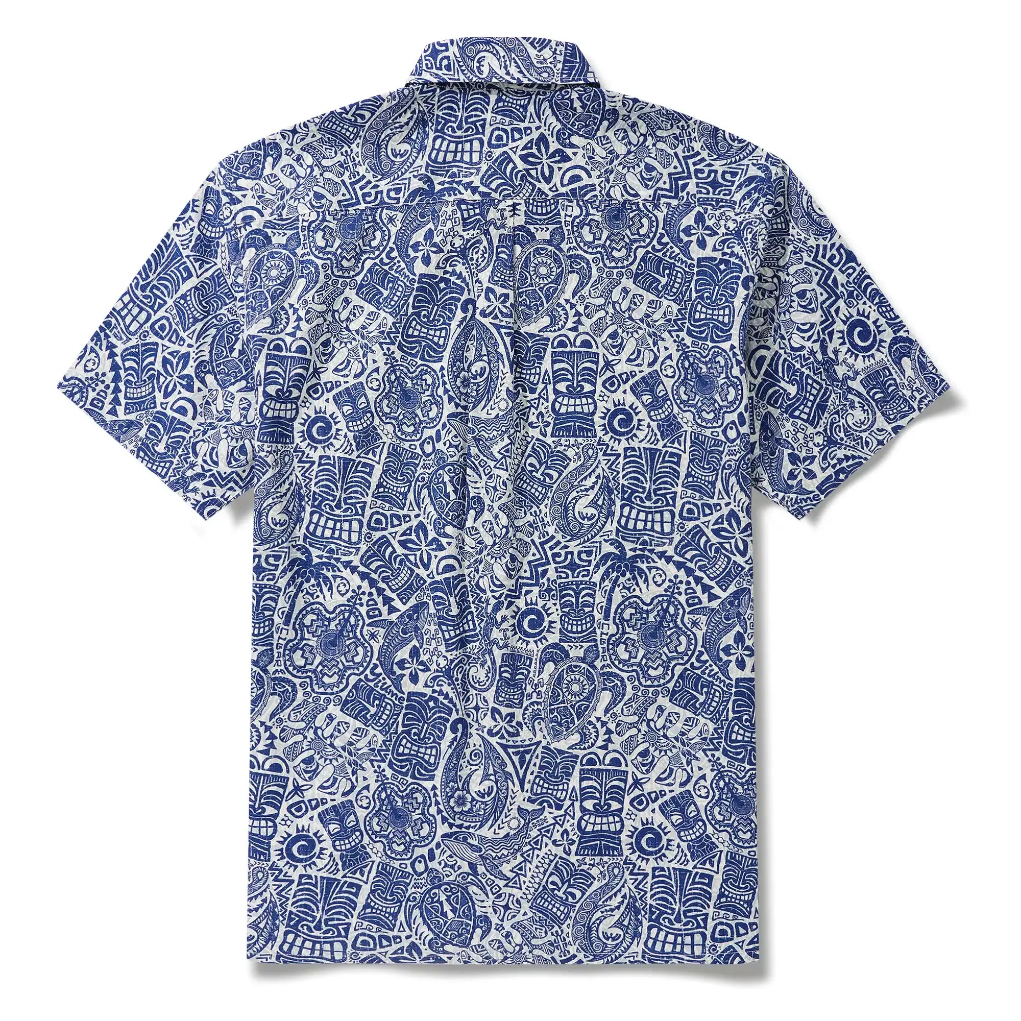 Inspired by classic TIKI tribal culture, our vintage blue and white shirt features playful TIKI totems, protective sea turtles, lively lizards, and adventurous fish hooks. Redefining traditional symbols, it embodies the "Vintage TIKI Gentlemen" look. Embrace tropical retro vibes and break free from the ordinary with this stylish choice.