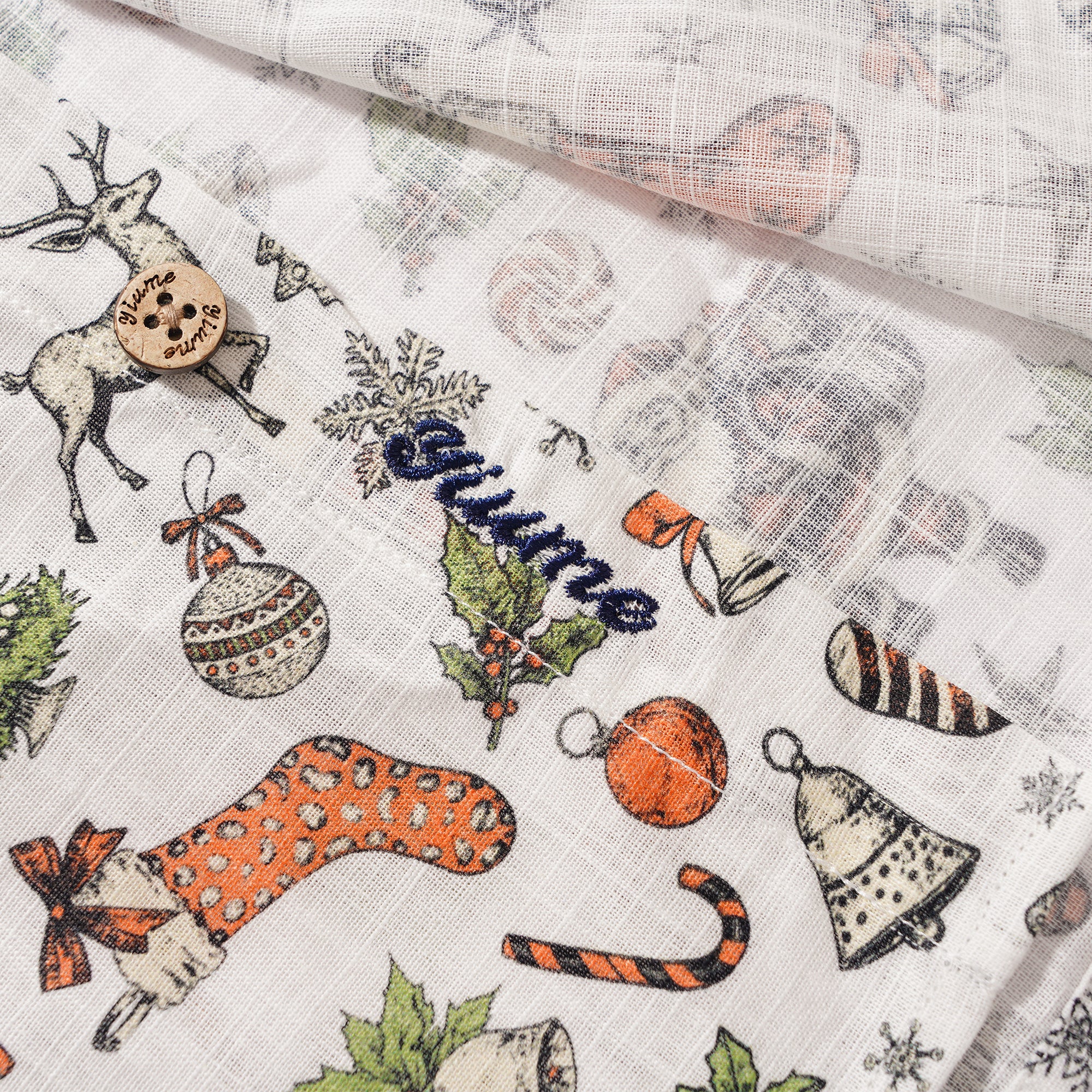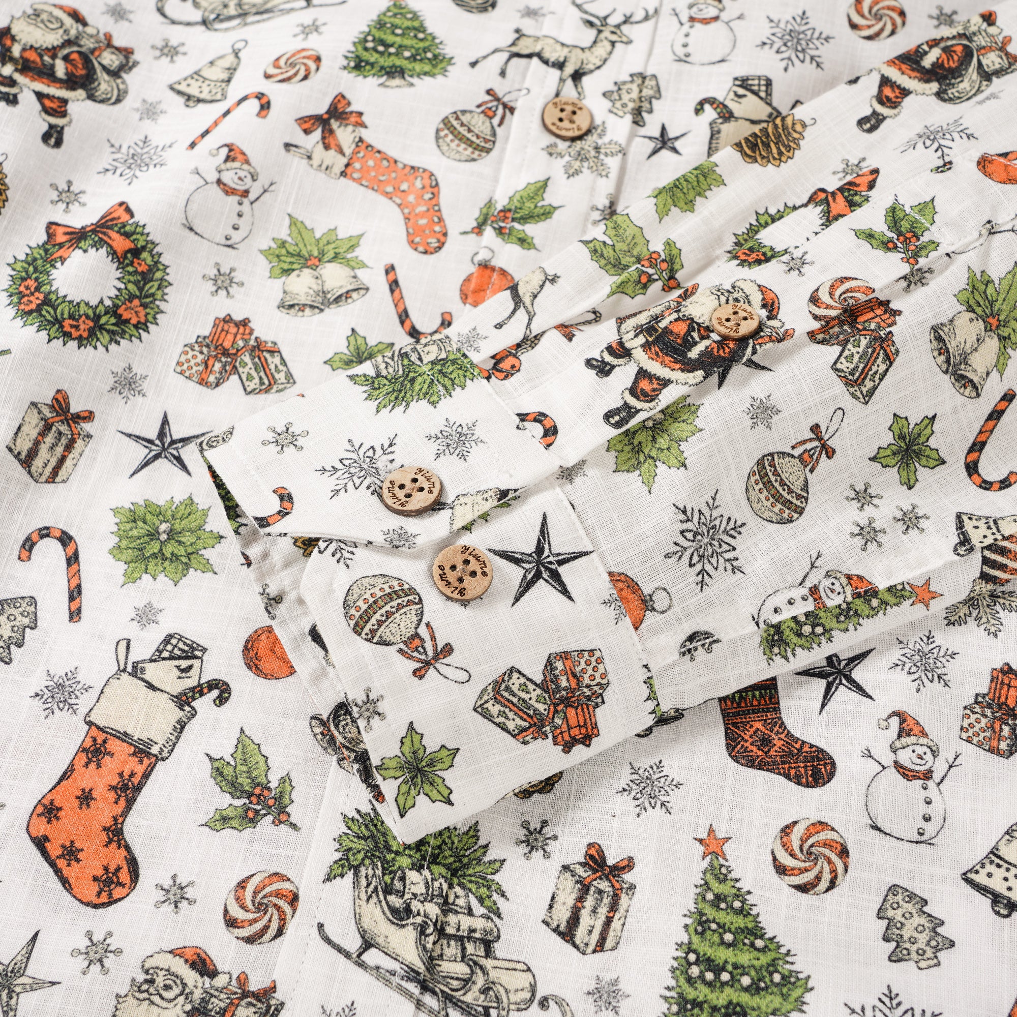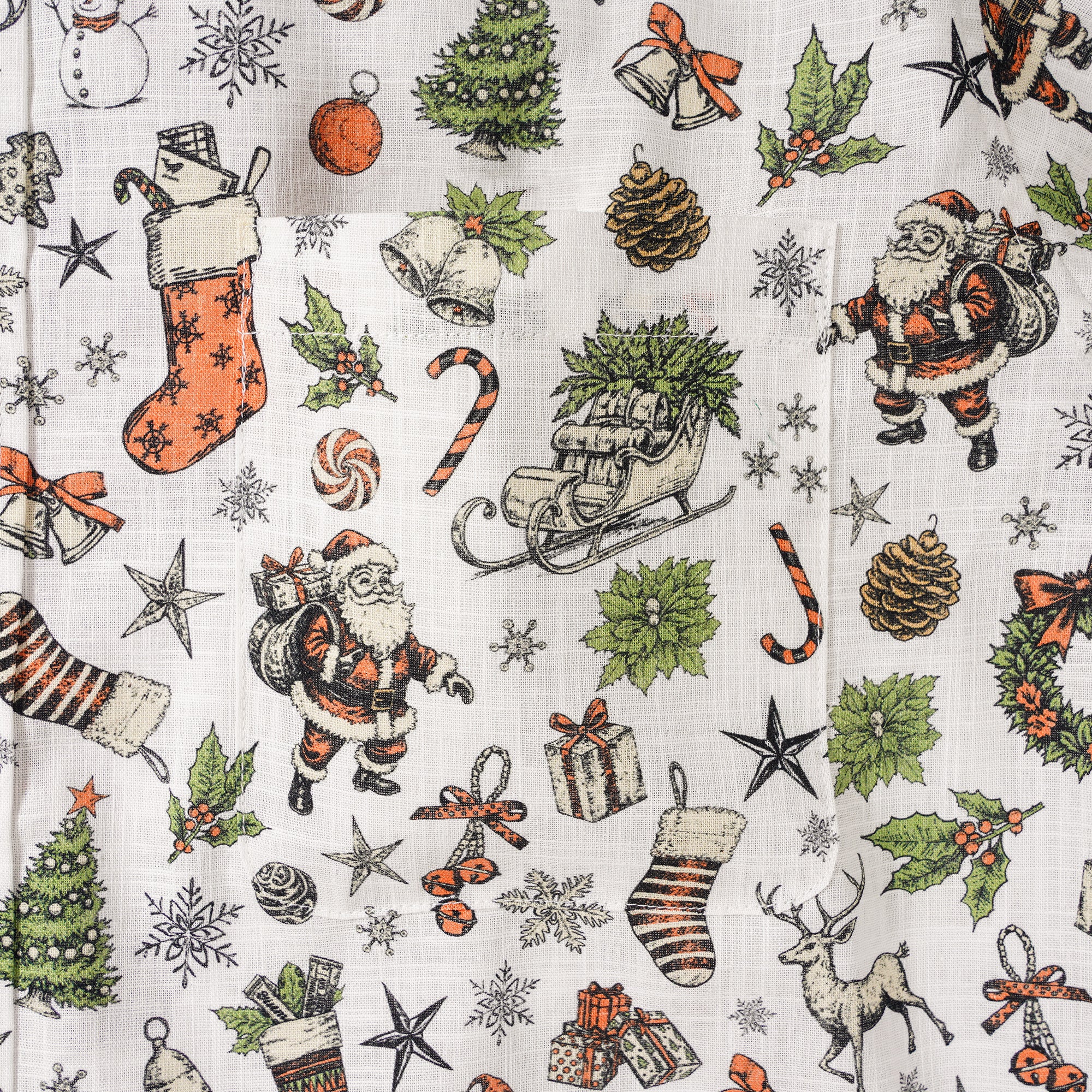 Capture the essence of Christmas with our Hawaiian-inspired shirt. Santa's smile and the anticipation of stockings are woven into the fabric, with a white base complemented by red and green, resembling starlight on a snowy night. This isn't just for the holidays; it's a subtle nod to Christmas that you can wear every day. Perfect for festive gatherings and cozy moments alone. Embrace the relaxed romance of Christmas anytime, anywhere.