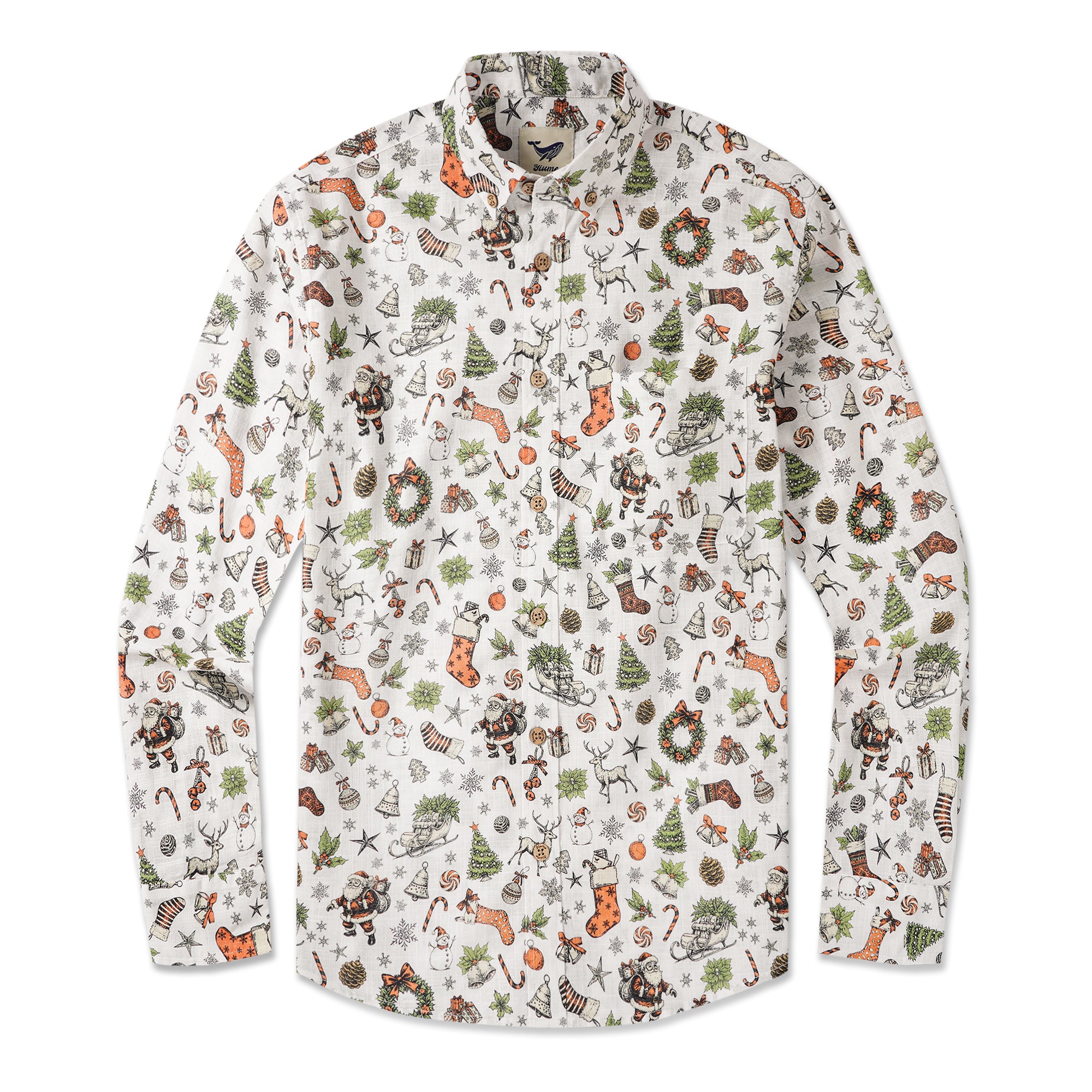Men's Hawaiian Shirt Long Sleeve Button-down 100% Cotton White Aloha Everyday Sparkle Of Santa