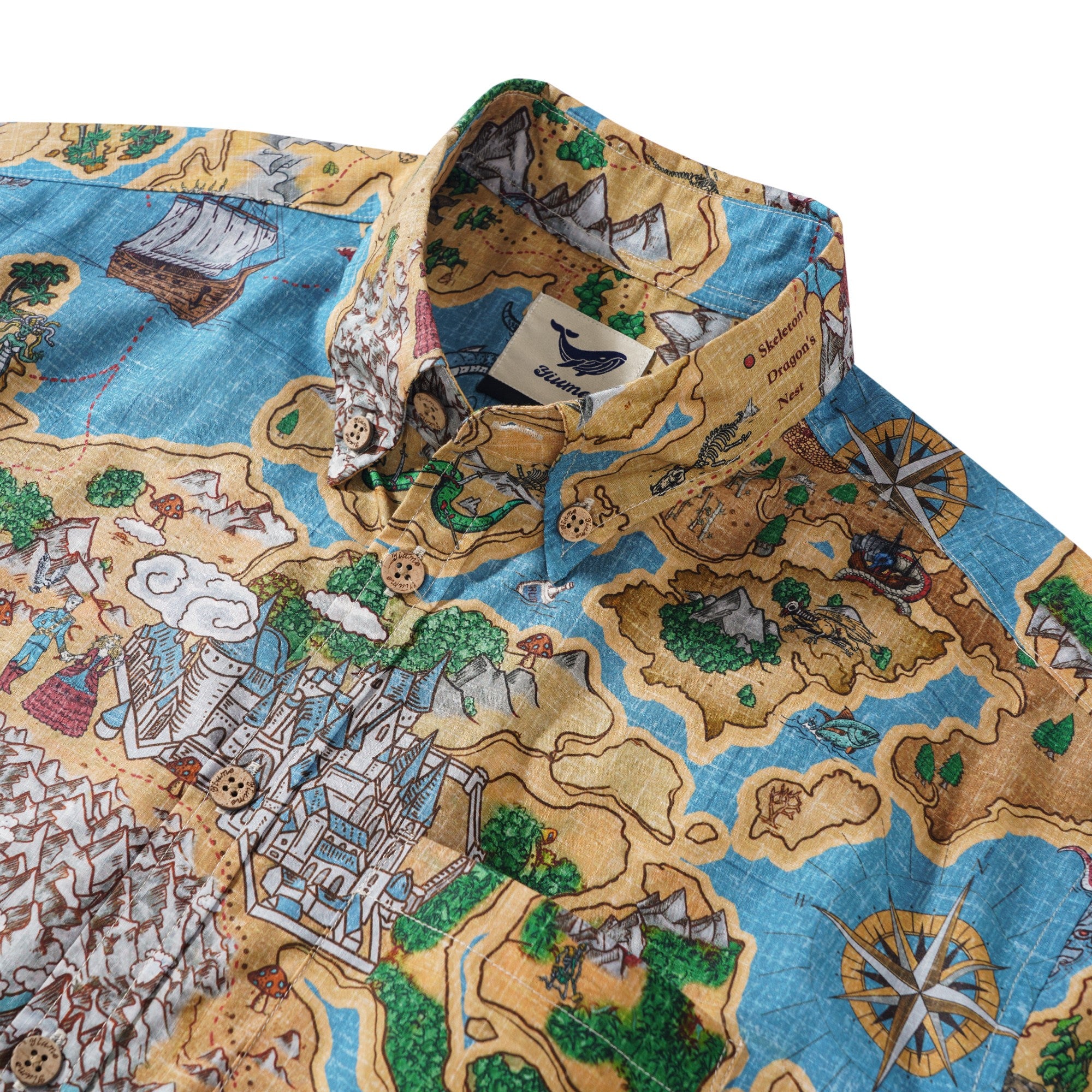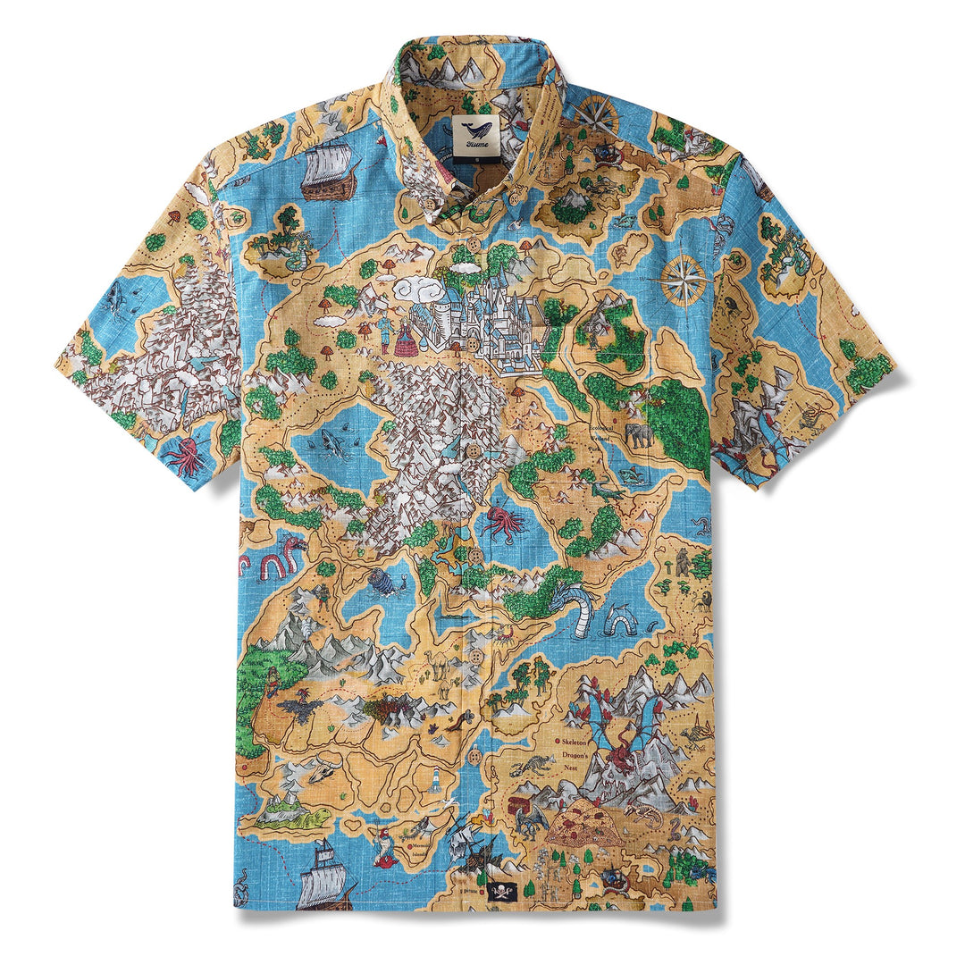 Men's Hawaiian Shirt Short Sleeve Button-down 100% Cotton Blue Aloha Enchanted World Adventure Map