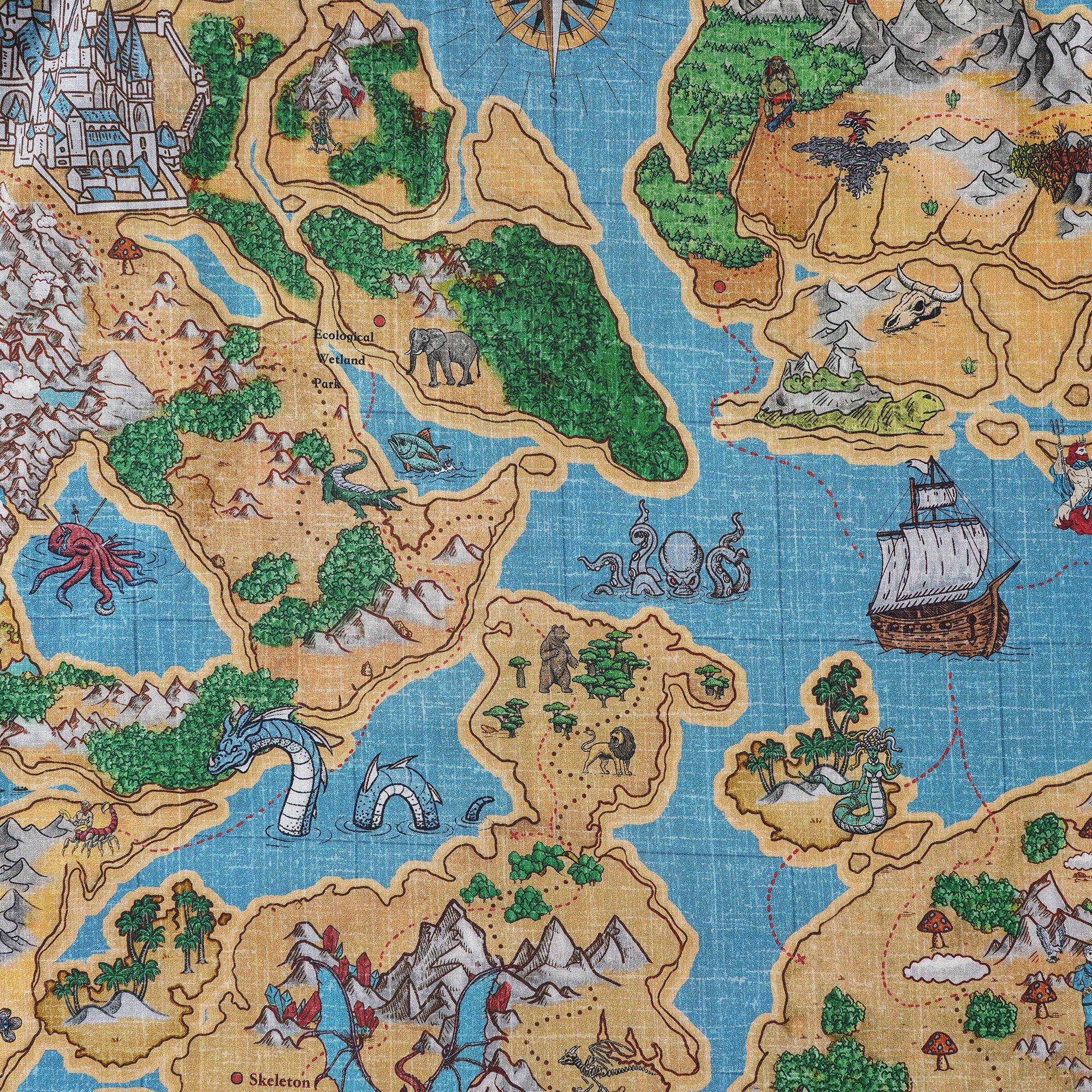 This artwork is a mythical treasure map filled with wonder—from skull-shaped lands and red dragons in misty peaks to oceans lit by sun, dotted with Viking ships and sea beasts. Castles peek from lush valleys, strange creatures roam vast deserts. Every inch invites discovery, echoing America’s love for epic tales. More than a map, it’s a gateway to endless adventure and a spark for the imagination.