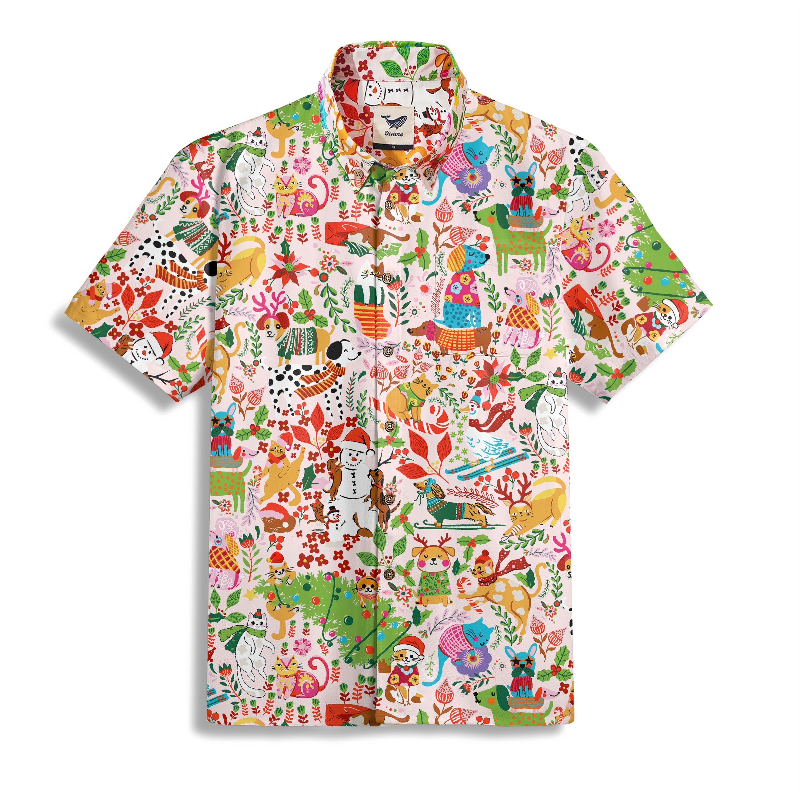 Men's Hawaiian Shirt Short Sleeve Button-down 100% Cotton Green Aloha Enchanted Pets’ Christmas