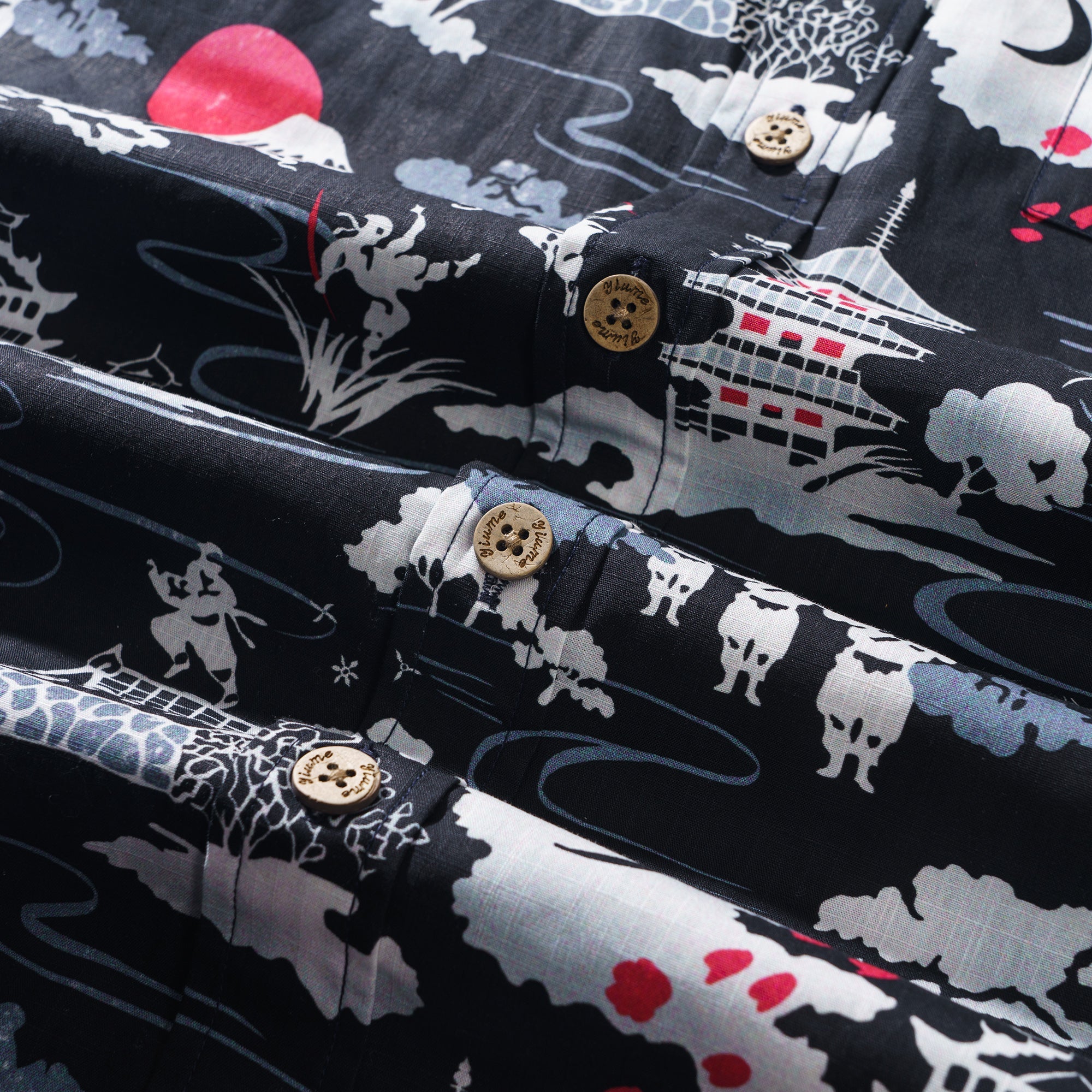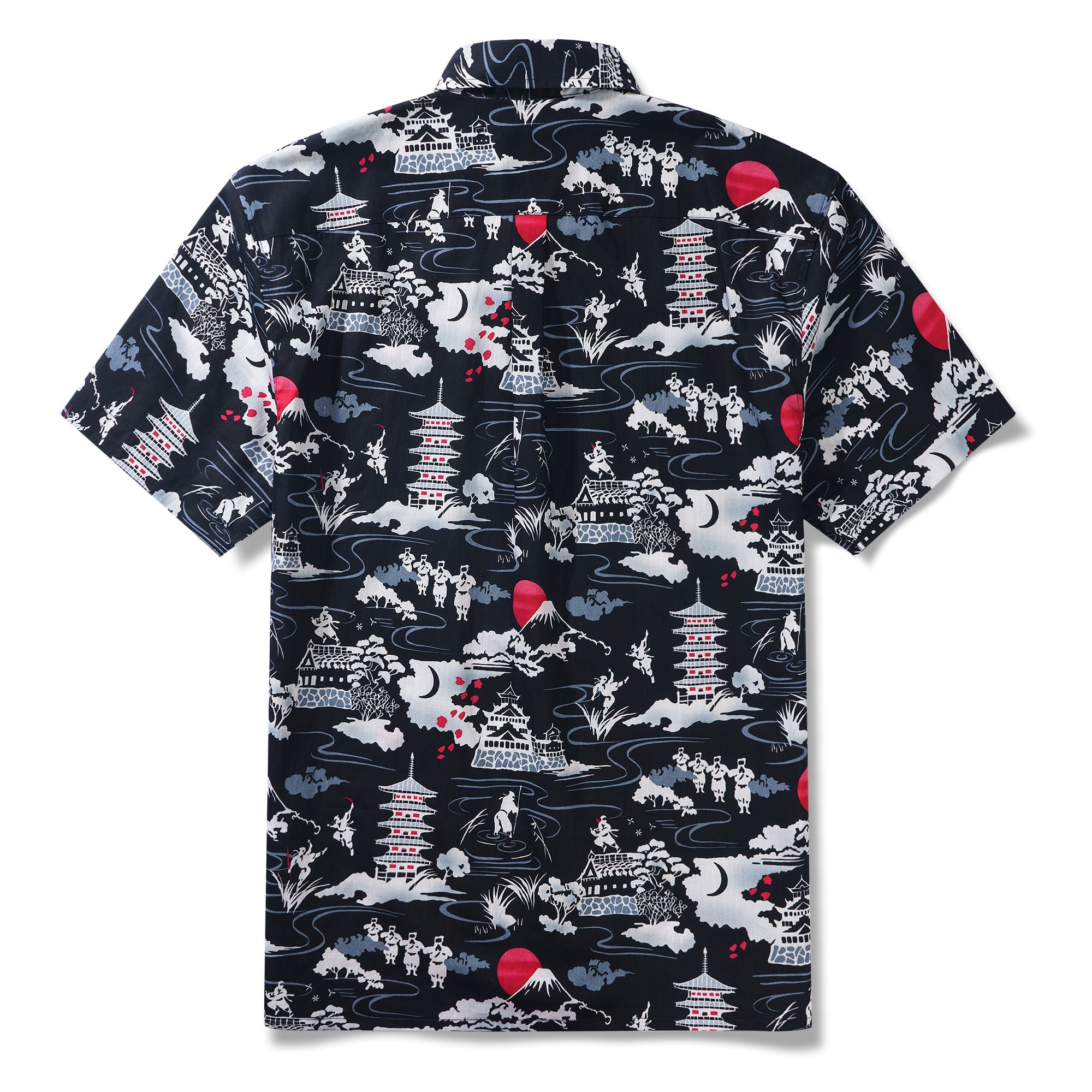 Ce design de chemise hawaïenne est une fusion de silhouettes uniques et d'effets de mélange doux, capturant l'essence des esthétiques japonaises. Le fond noir évoque un ciel nocturne profond, portant des éléments narratifs riches. Au centre de l'œuvre se trouvent des ninjas japonais, montrant leurs compétences acrobatiques, des batailles intenses et des capacités mystiques, dépeignant de manière vivante les légendes du monde ninja. Des pagodes anciennes, le Mont Fuji et le soleil créent un arrière-plan fascinant, racontant la culture japonaise ancienne et énigmatique. Les pétales de cerisier rouge tombants ajoutent une touche de mélancolie et de romance à cette scène exaltante, comme s'ils révélaient l'amour caché et les vendettas du royaume ninja.