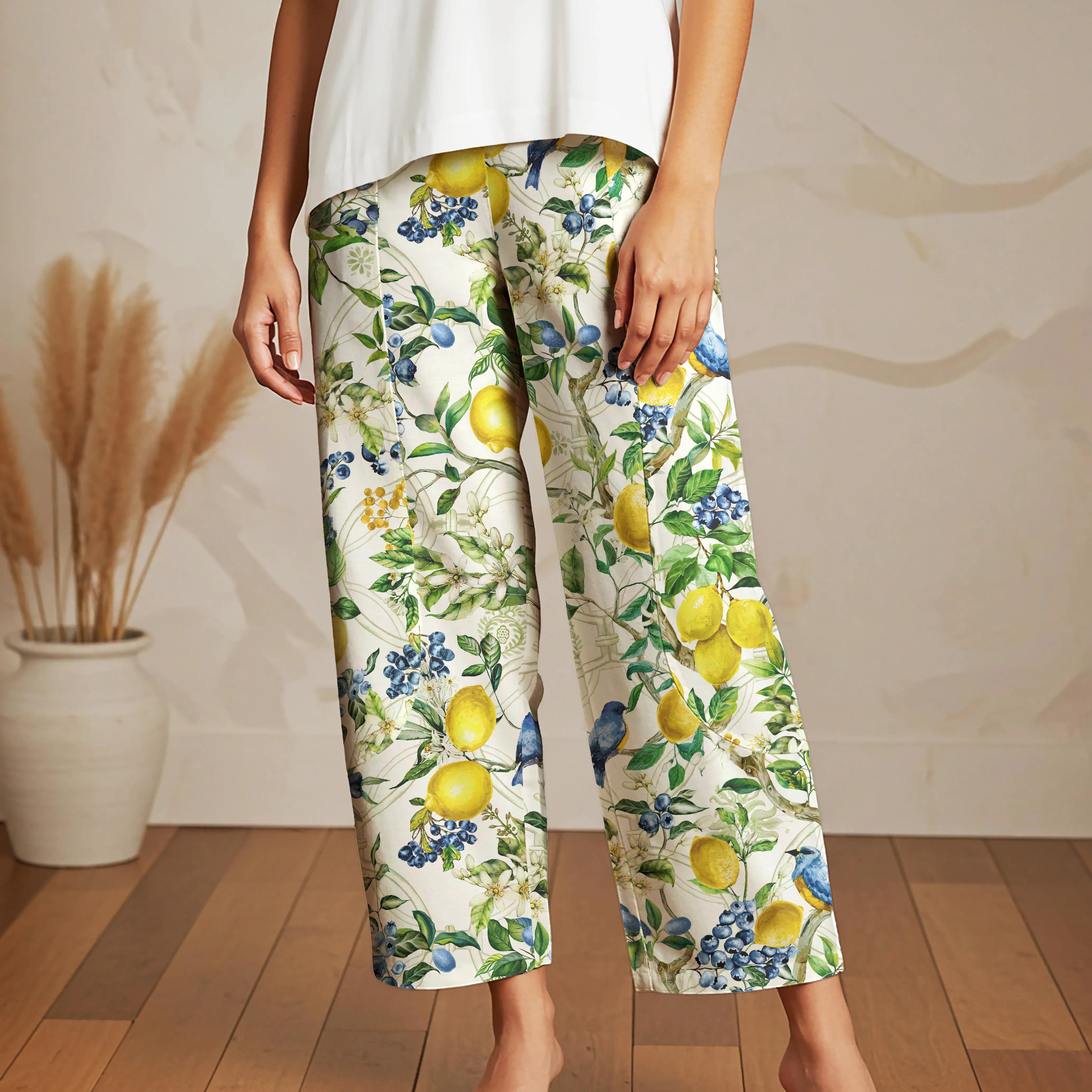 Women Casual Ankle Pants Lounge Elastic Waist with Pockets 93% Lyocell, 7% Linen White Aloha Sicilian Lemon Tree Fantasy