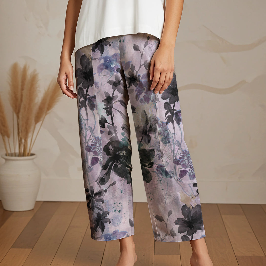 Women Casual Ankle Pants Lounge Elastic Waist with Pockets 93% Lyocell, 7% Linen Purple Aloha Ink Purple Floral Haven