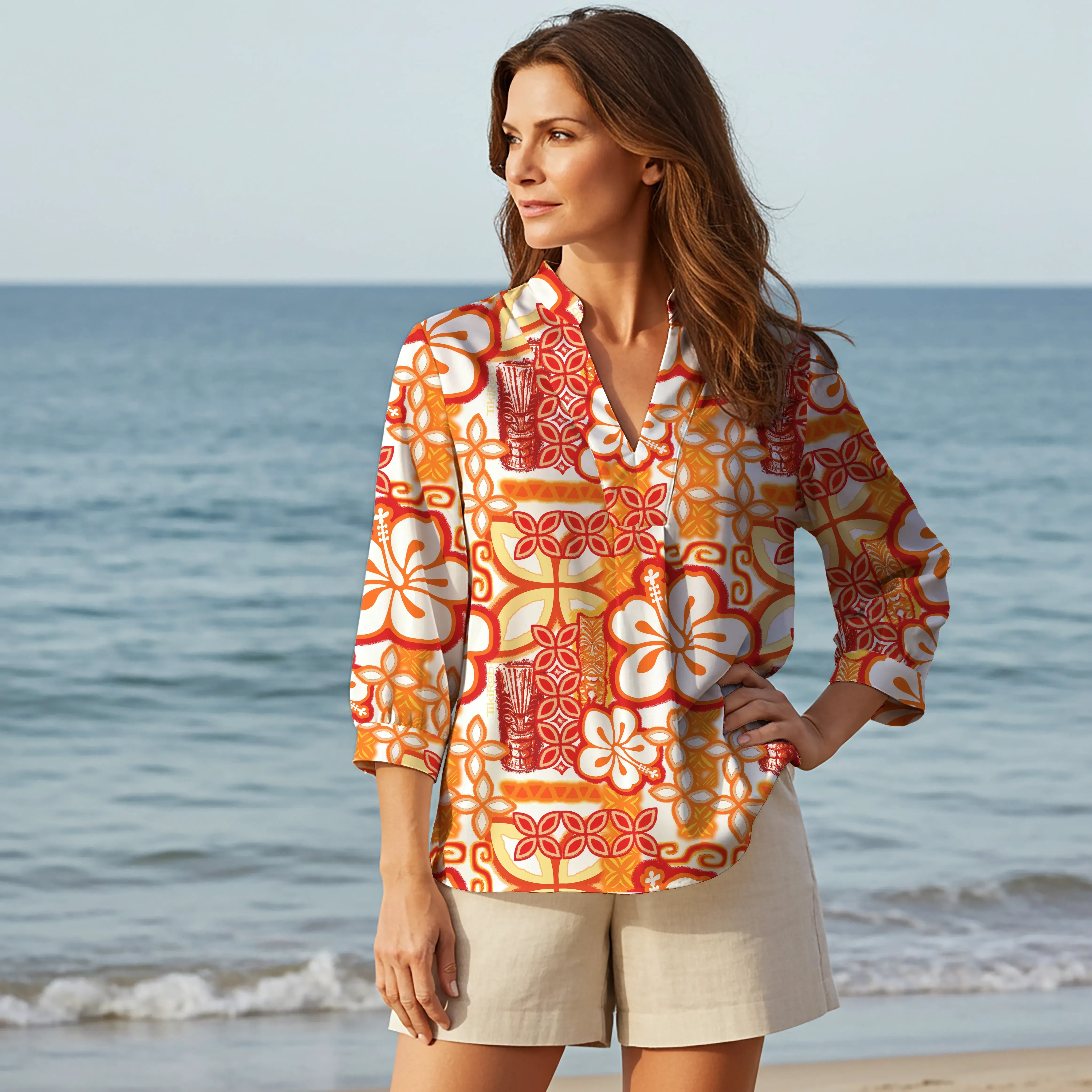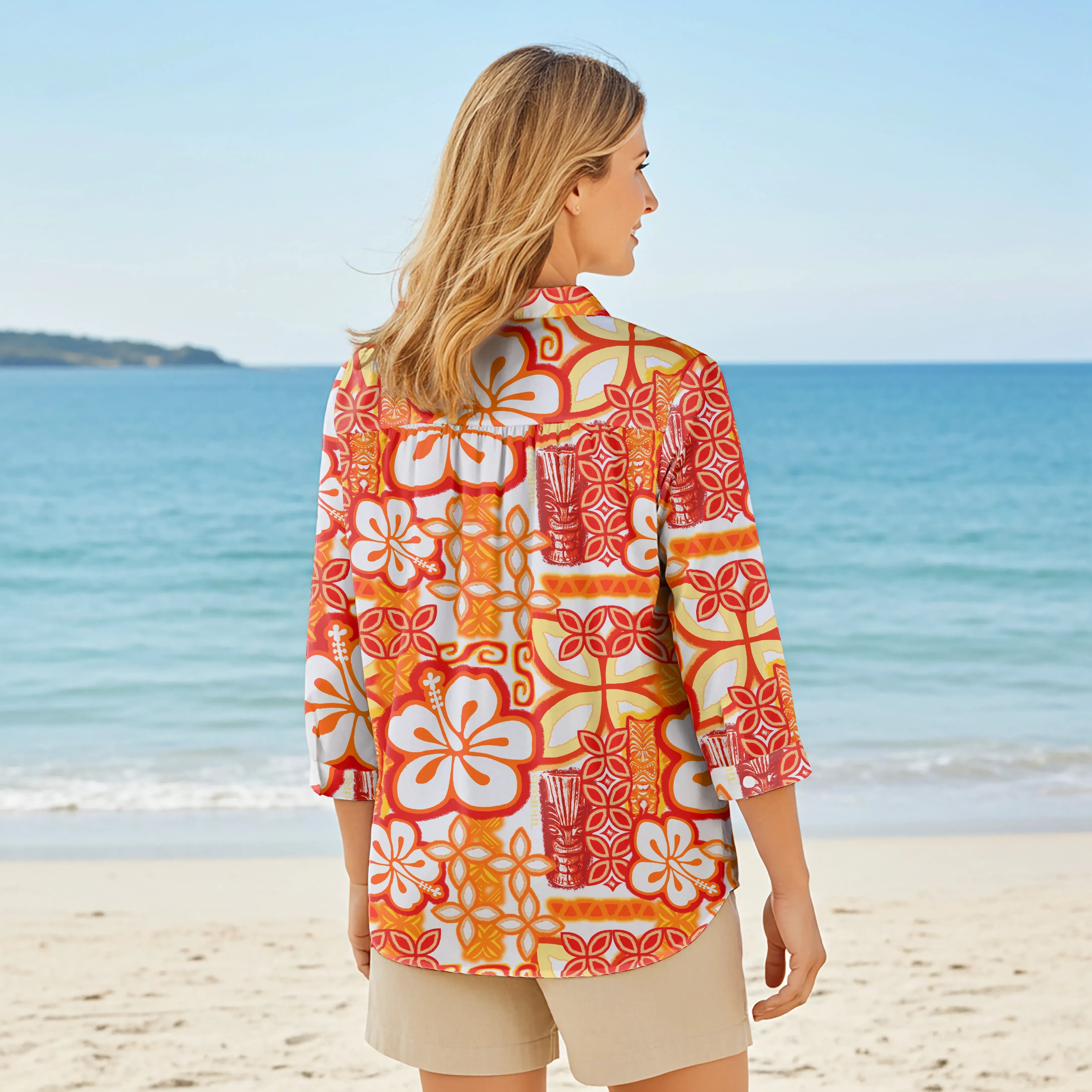 Women Casual Blouse 3/4 Sleeve V-neck Shirt Collar 100% Lyocell Orange Aloha Nature Collector