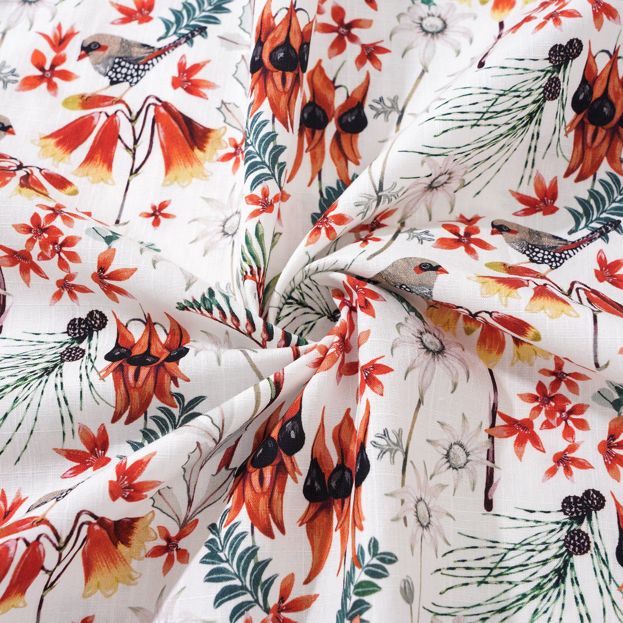 Cette élégante chemise arbore un motif peint à la main représentant des pinsons à queue de feu aux couleurs vives, aux côtés de fleurs australiennes indigènes : fleurs de flanelle, patte de kangourou, pois du désert de Sturt et clochettes de Noël. Un mélange unique de charme insulaire et de charme australien.