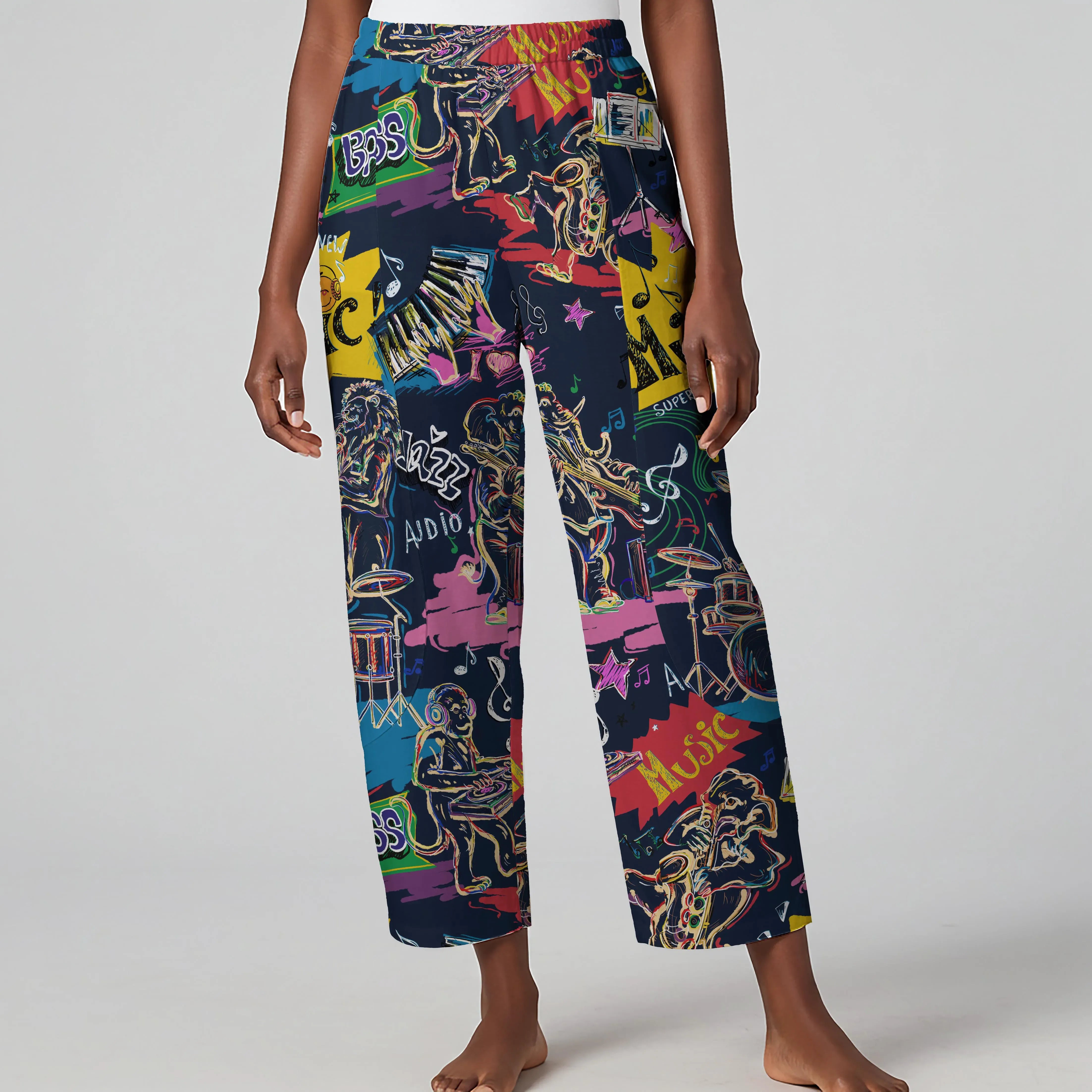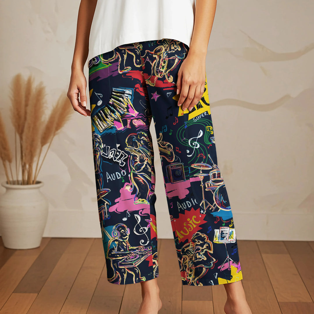 Women Casual Ankle Pants Lounge Elastic Waist with Pockets 93% Lyocell, 7% Linen Blue Aloha Creature Concerto
