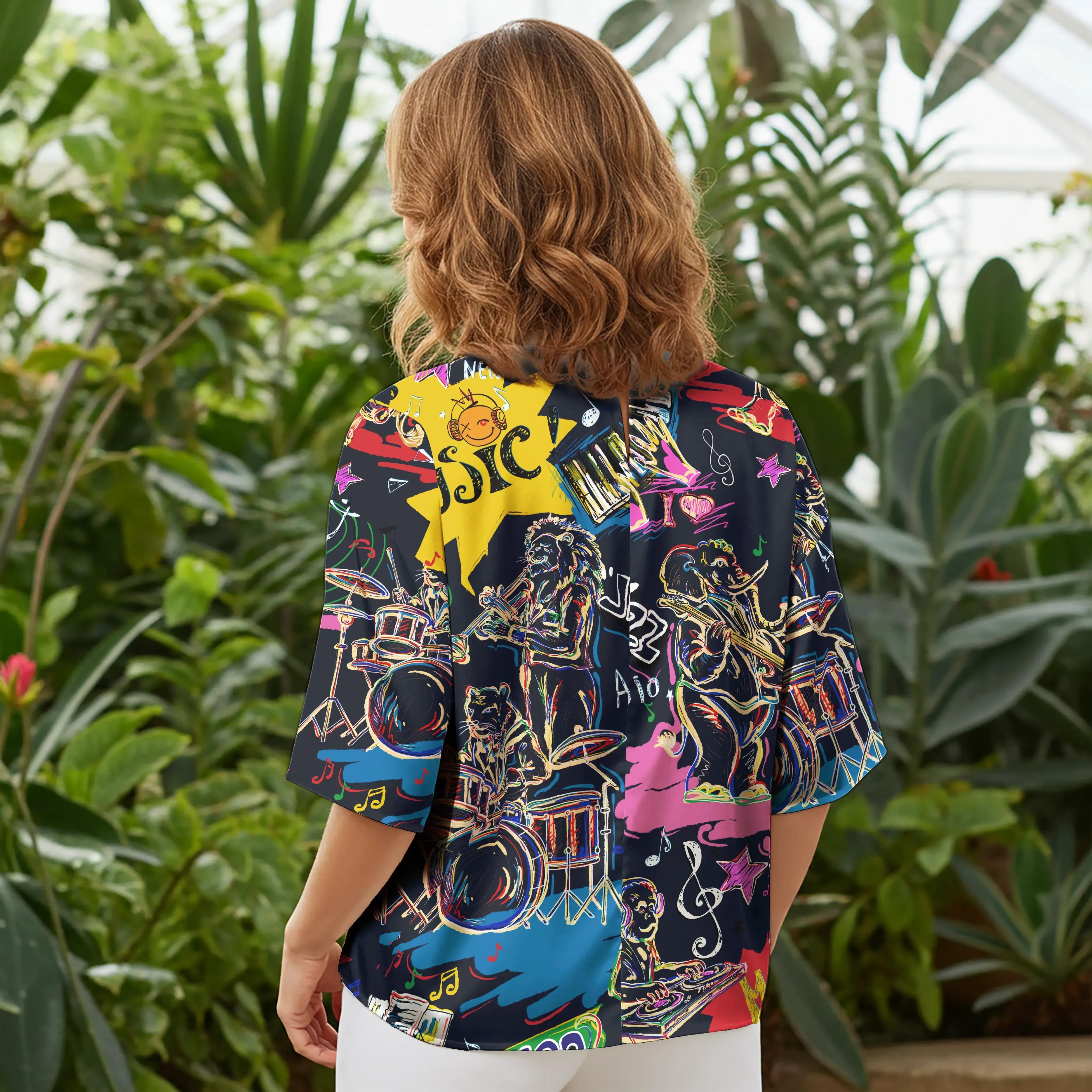 Embrace the vibrant energy of jazz and pop culture with our "Creature Concerto" shirt. Featuring bold graffiti-style lines, elephants on bass, lions on trumpet, and tigers on drums, this modern twist on classic cartoons is a nod to retro-futuristic beats. Neon hues of pink and blue pop against a black backdrop, with piano and saxophone details intertwined with stars and sheet music. "SUPER MUSIC" in retro comic font adds a nostalgic yet fresh touch, embodying a free-spirited, high-energy vibe.