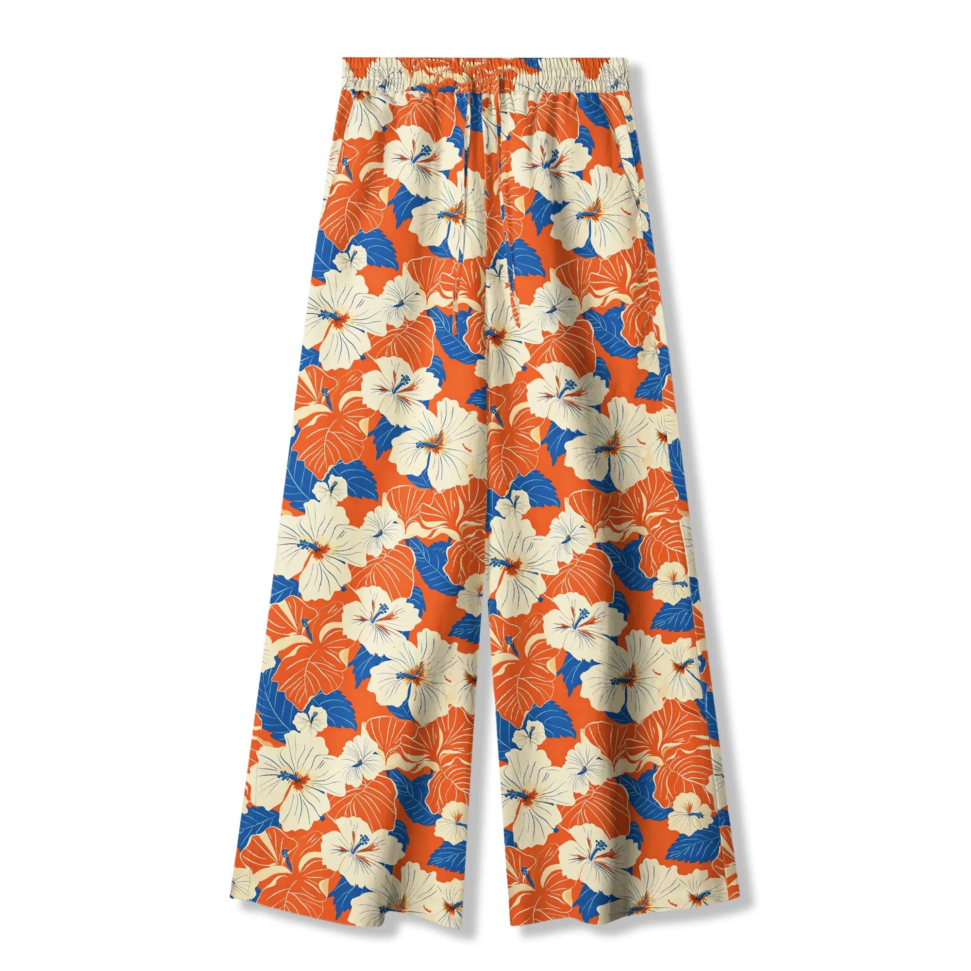 Women's Casual Floral Wide Leg Pants Lounge Elastic Waist Drawstring with Pockets 93% Lyocell, 7% Linen Orange Aloha Orange Blue Hibiscus Whispers
