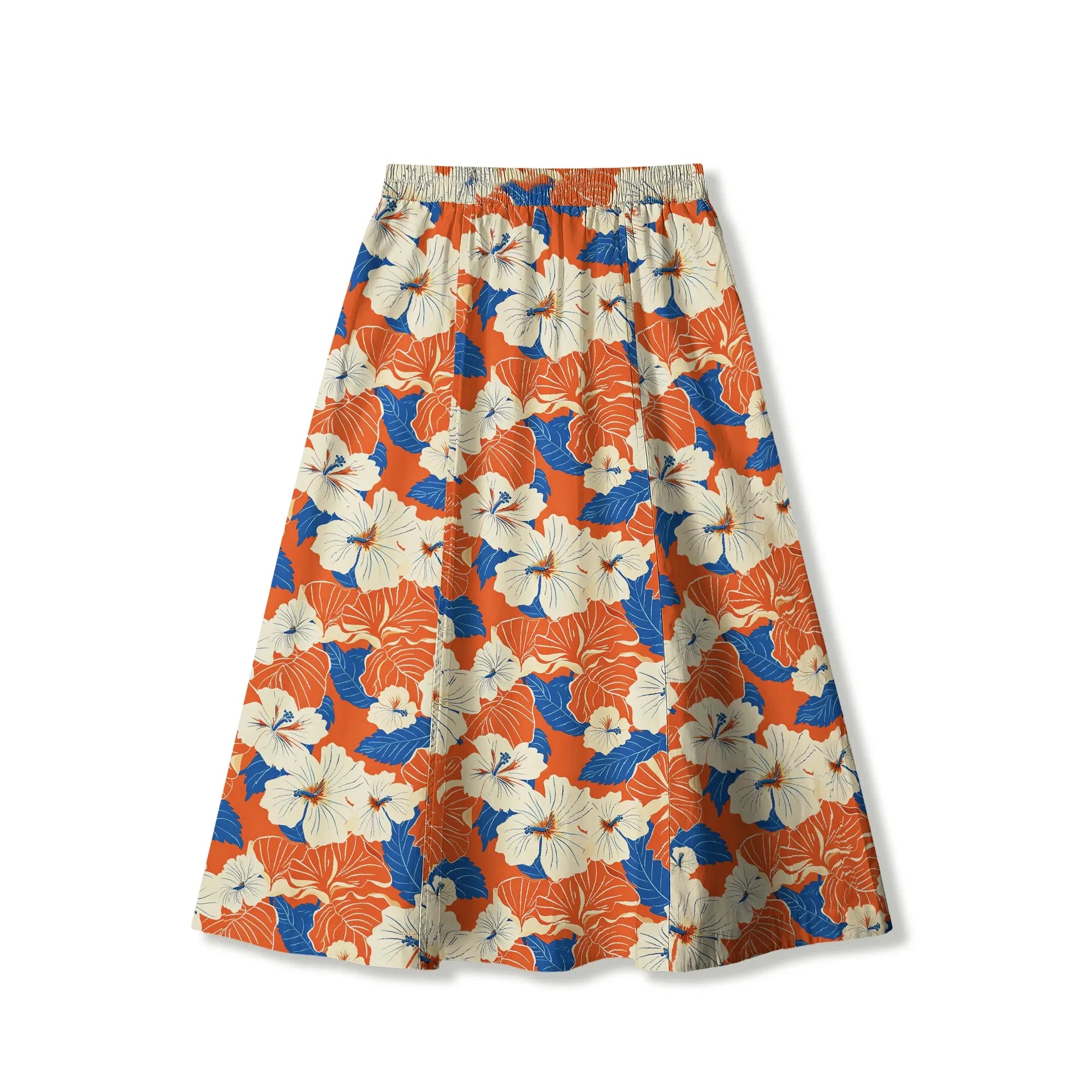 Women's Casual Skirt Elastic Waist with Pockets 100% Cotton Orange Aloha Orange Blue Hibiscus Whispers