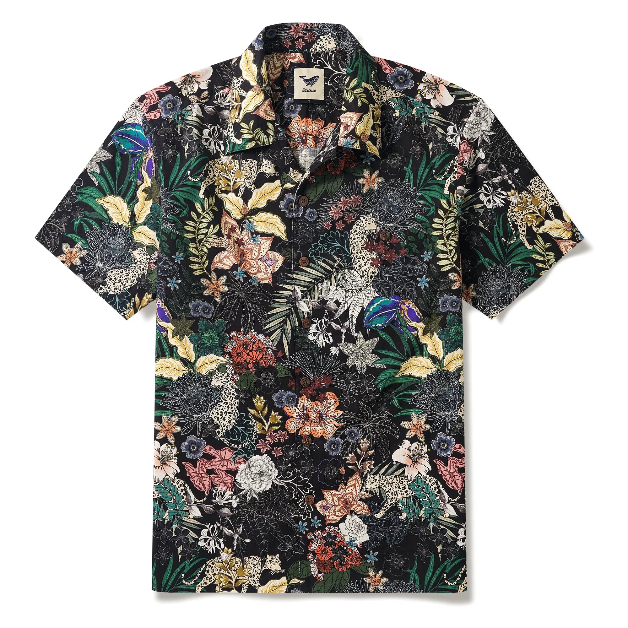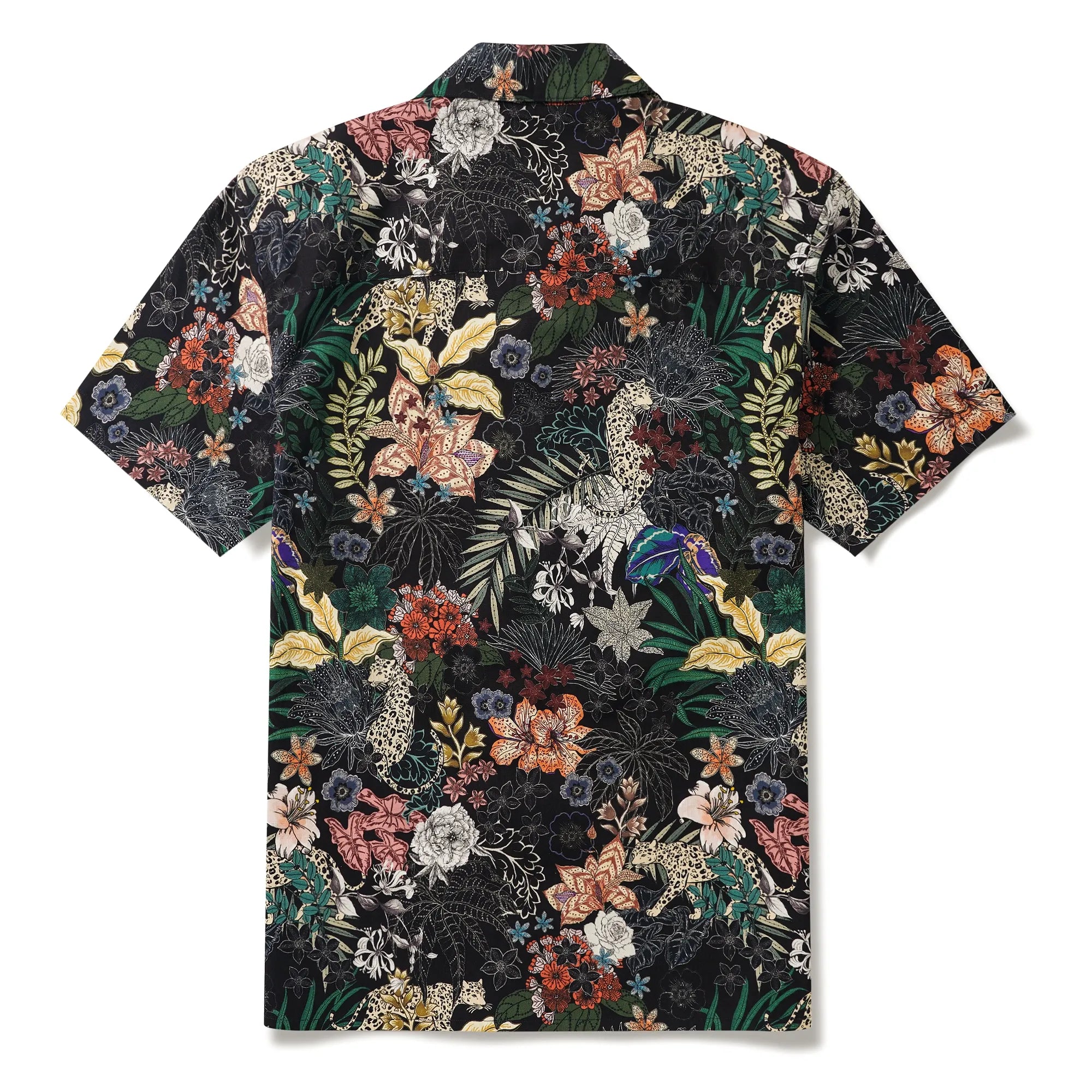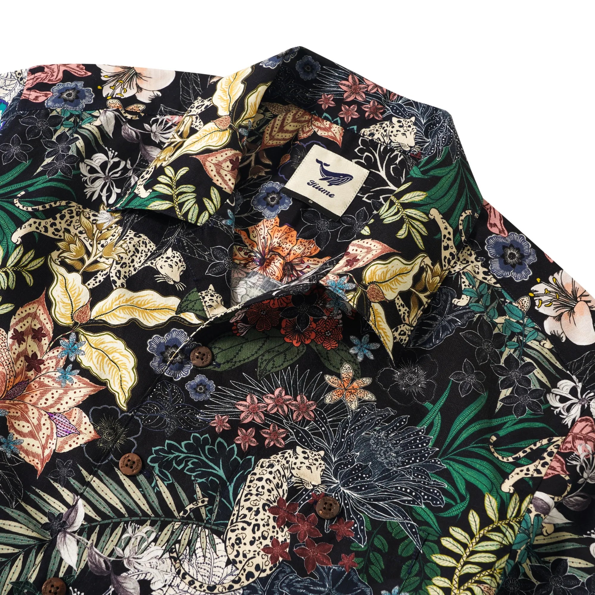 Leopards Men's Hawaiian Shirt Short Sleeve Camp Collar 100% Cotton Black Aloha The Night Jungle Exploring