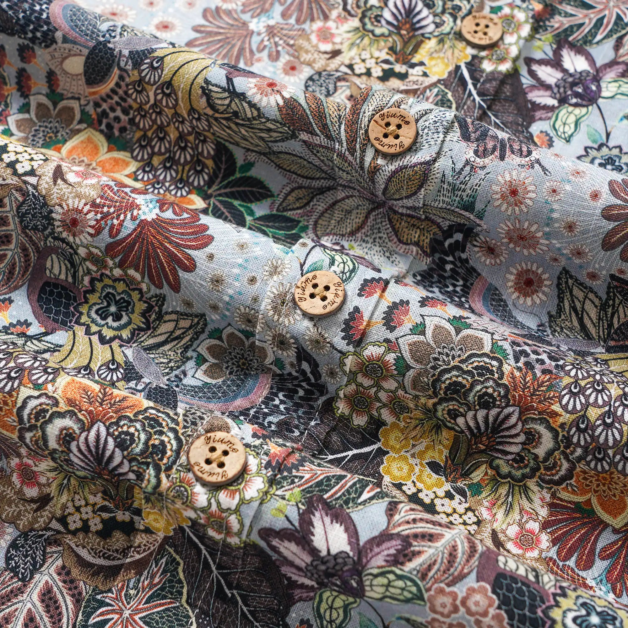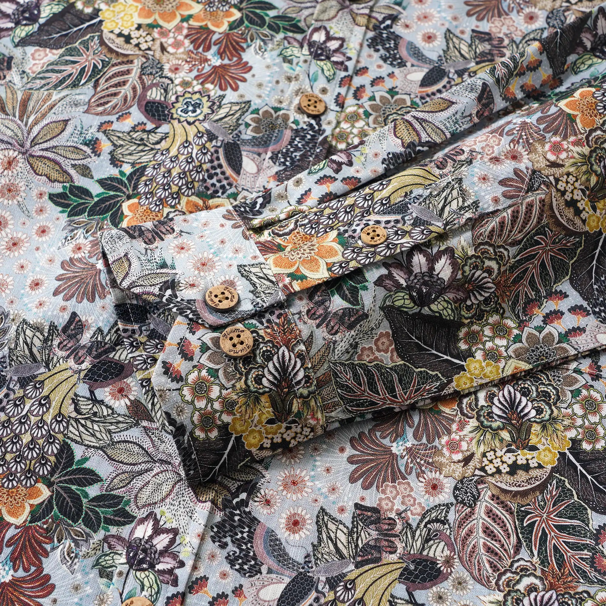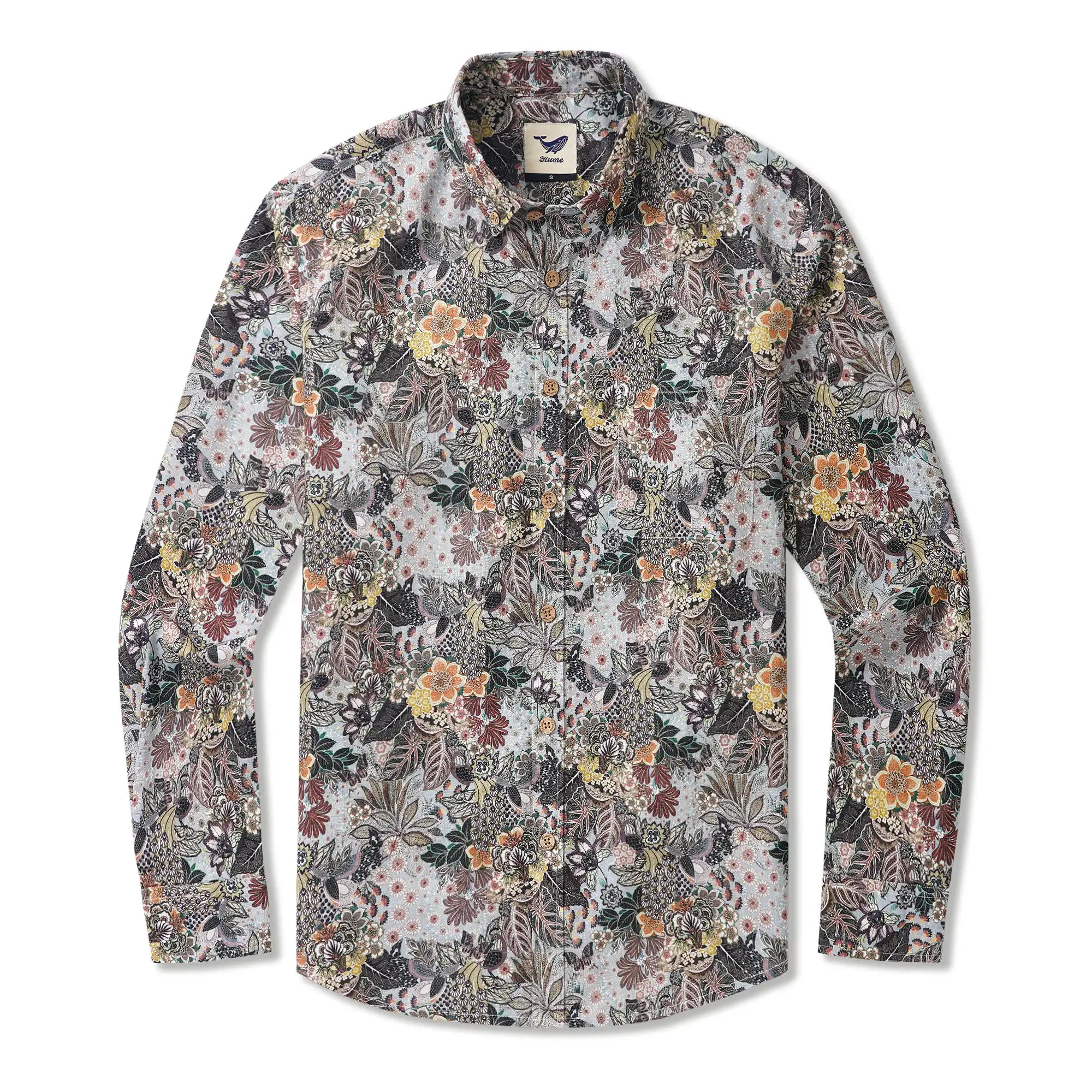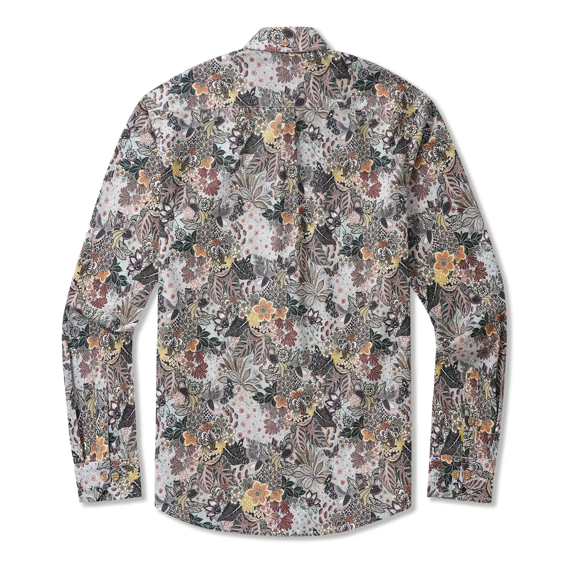 Inspired by vintage botanical gardens, this shirt features peacocks, butterflies, and plant motifs on a grey base. Designed for gentlemen, it serves as a subtle yet luxurious statement in business settings and an exclusive artistic emblem in social gatherings. Every detail embodies a philosophy of understated luxury. Wear it to embody an artistic jungle paradise, showcasing a relentless pursuit of texture and artistry in every appearance.