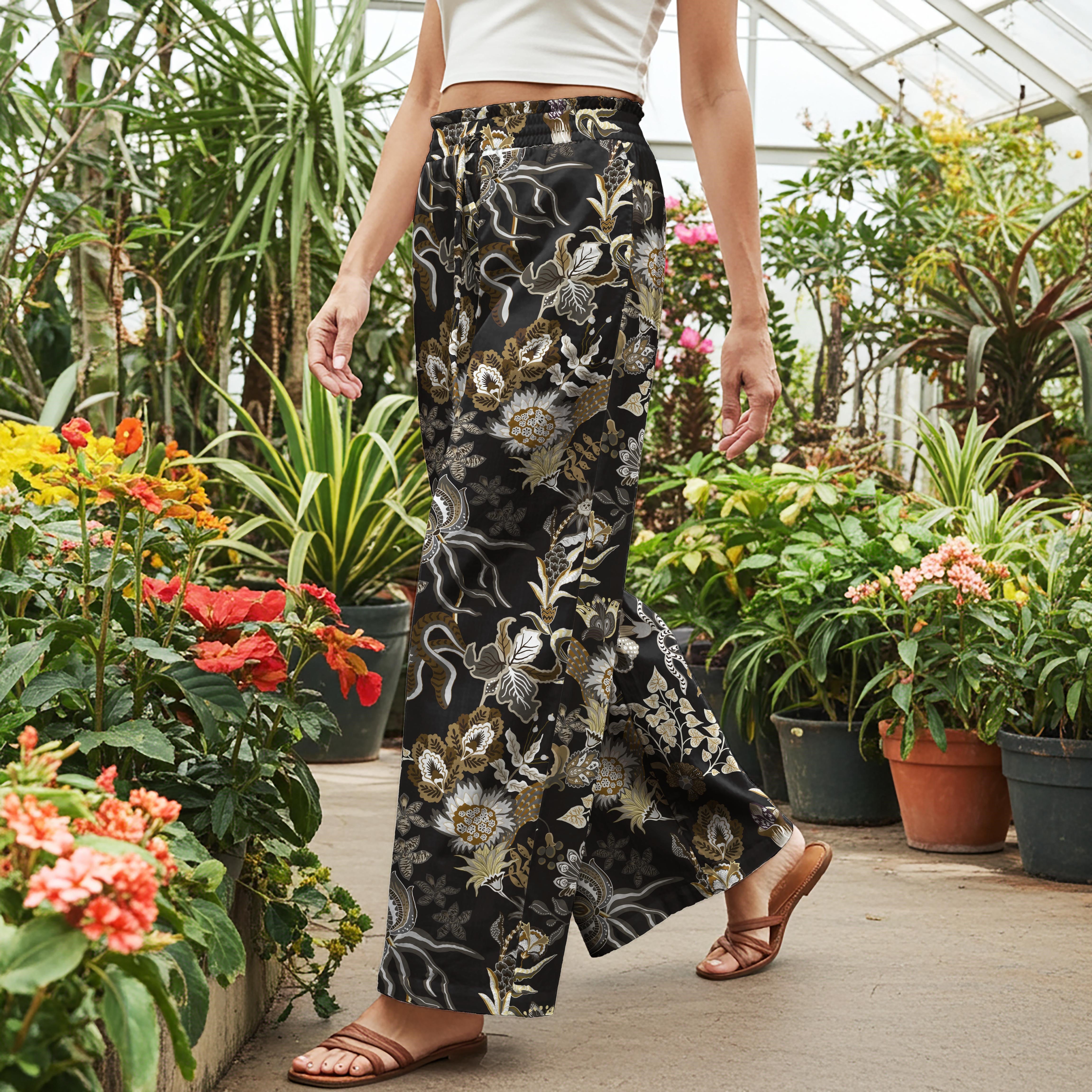 Women Casual Pants Lounge Elastic Waist Drawstring with Pockets 100% Cotton Brown Aloha Tranquil Ink Floral Art
