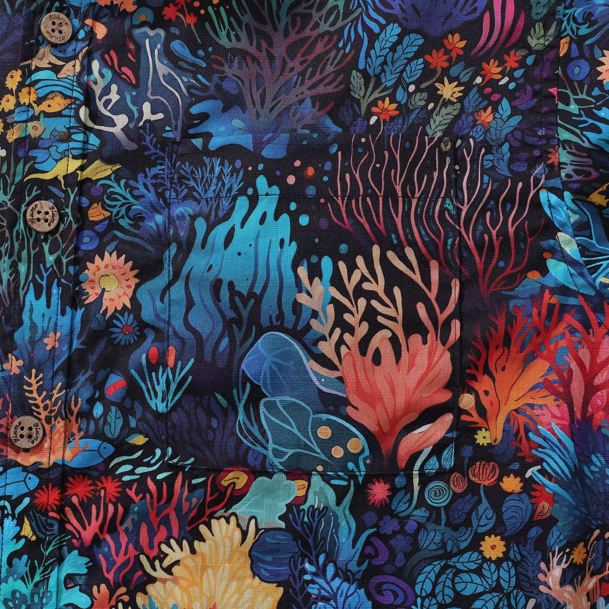 Ce motif est rempli de plantes marines mystérieuses et exotiques qui semblent provenir d'un monde aquatique inexploré, inspirant l'émerveillement. La flore marine colorée au sein du design éclate, chacune mettant en avant sa forme et sa teinte uniques, scintillant d'une lueur subtile. Certaines ressemblent à de douces algues qui se balancent doucement, émettant un parfum subtil ; d'autres sont des fleurs sous-marines bizarres se déployant dans des couleurs éclatantes, attirant la vie marine pour admirer leur beauté. L'ensemble du design est vibrant et plein de vie, comme s'il ouvrait un portail vers un royaume océanique secret. Imprimer ce paysage marin captivant sur une chemise hawaïenne capture l'affection pour l'attrait énigmatique de l'habillement Aloha.