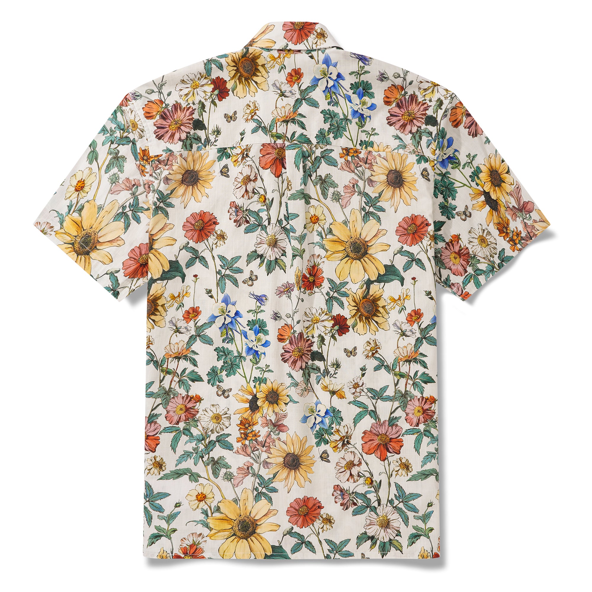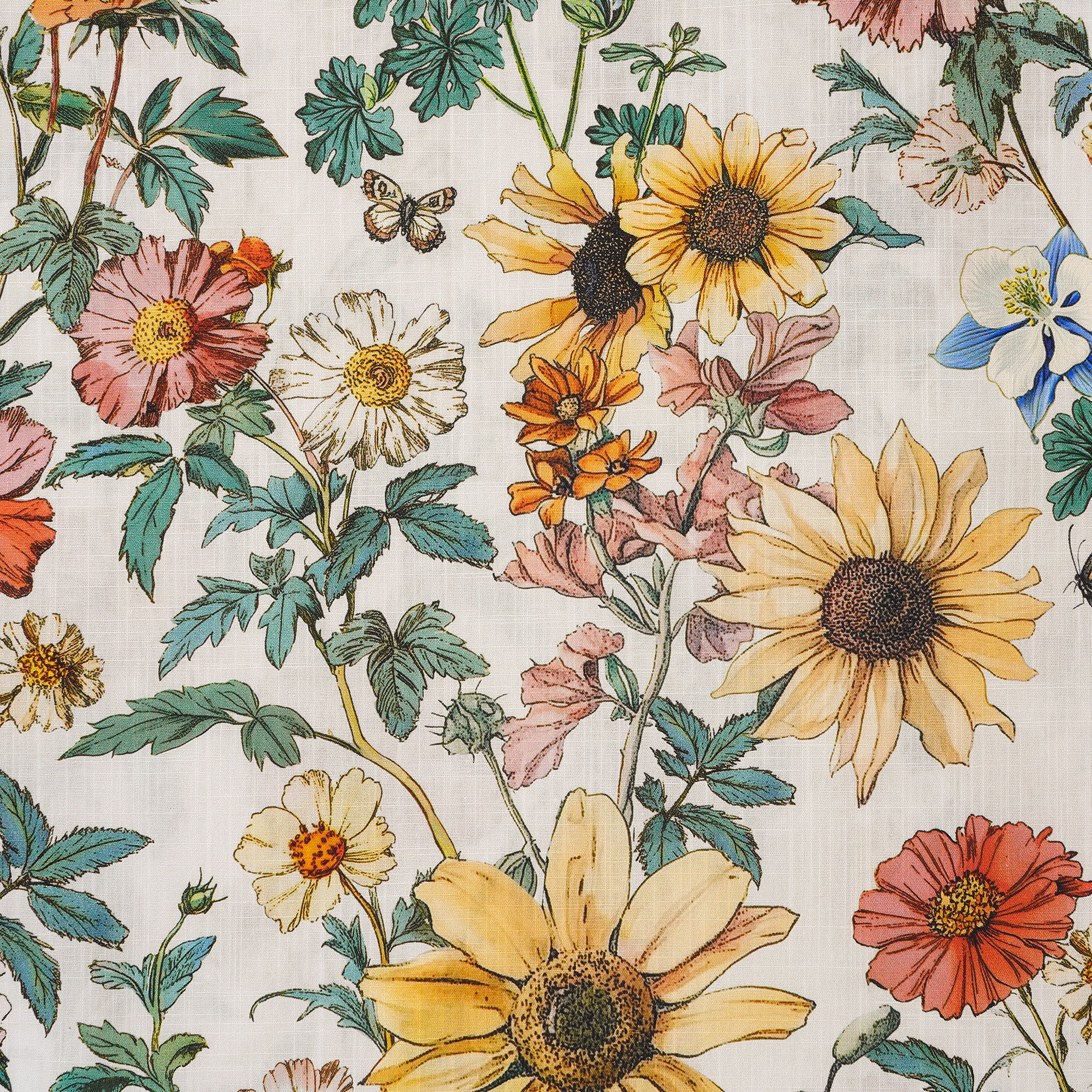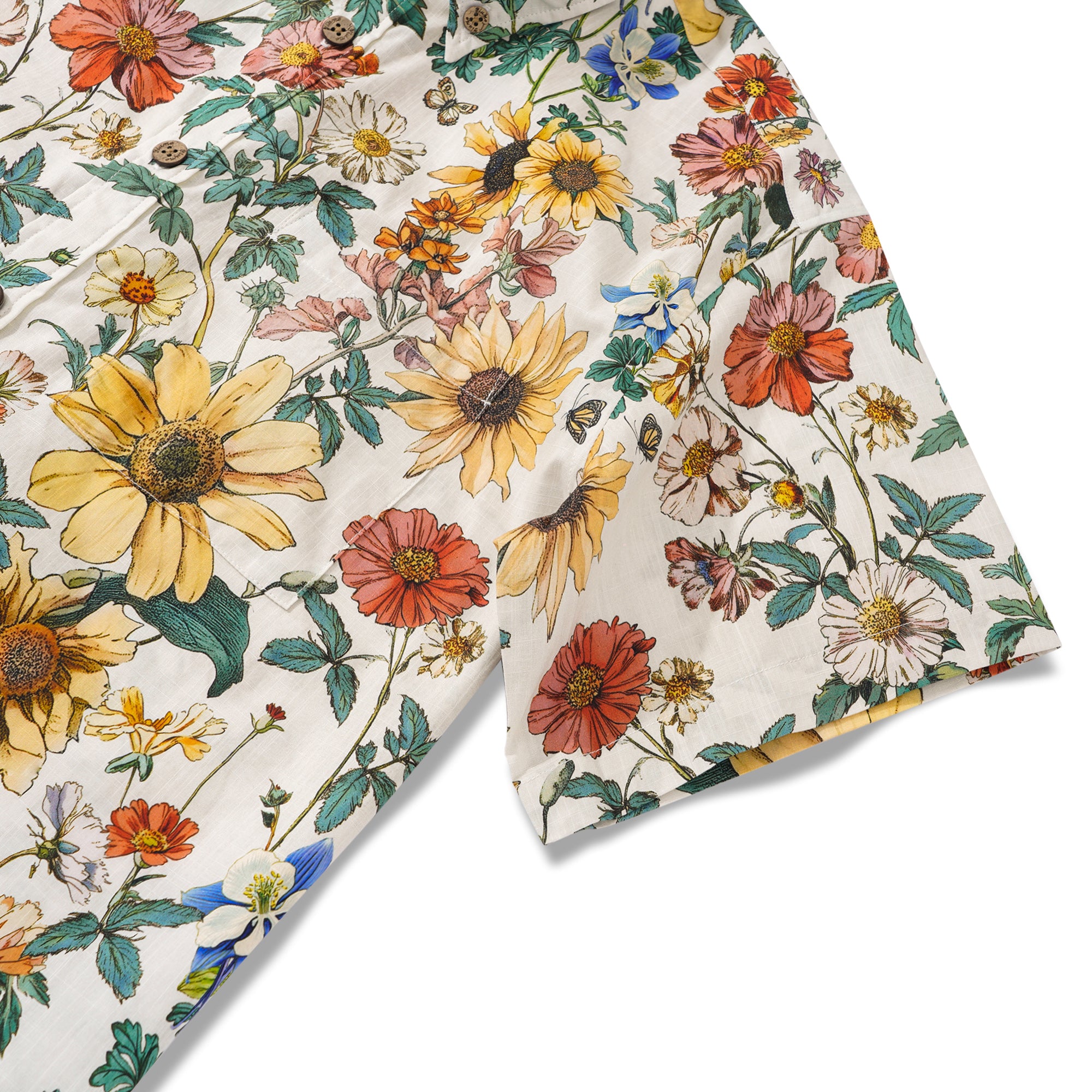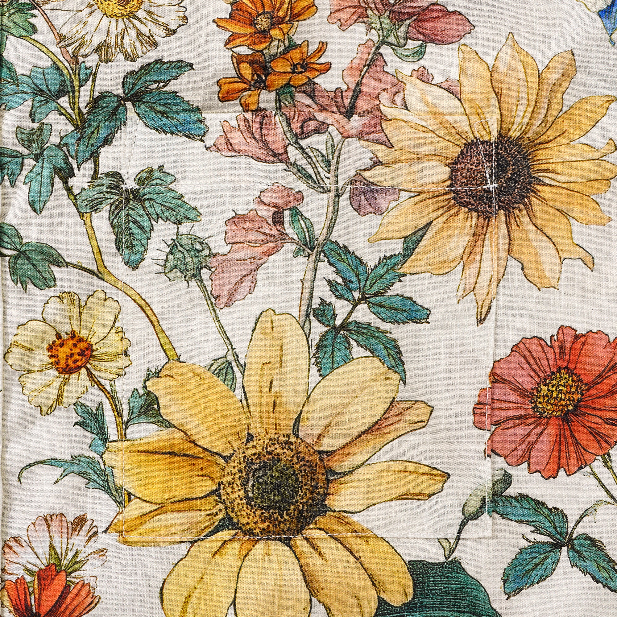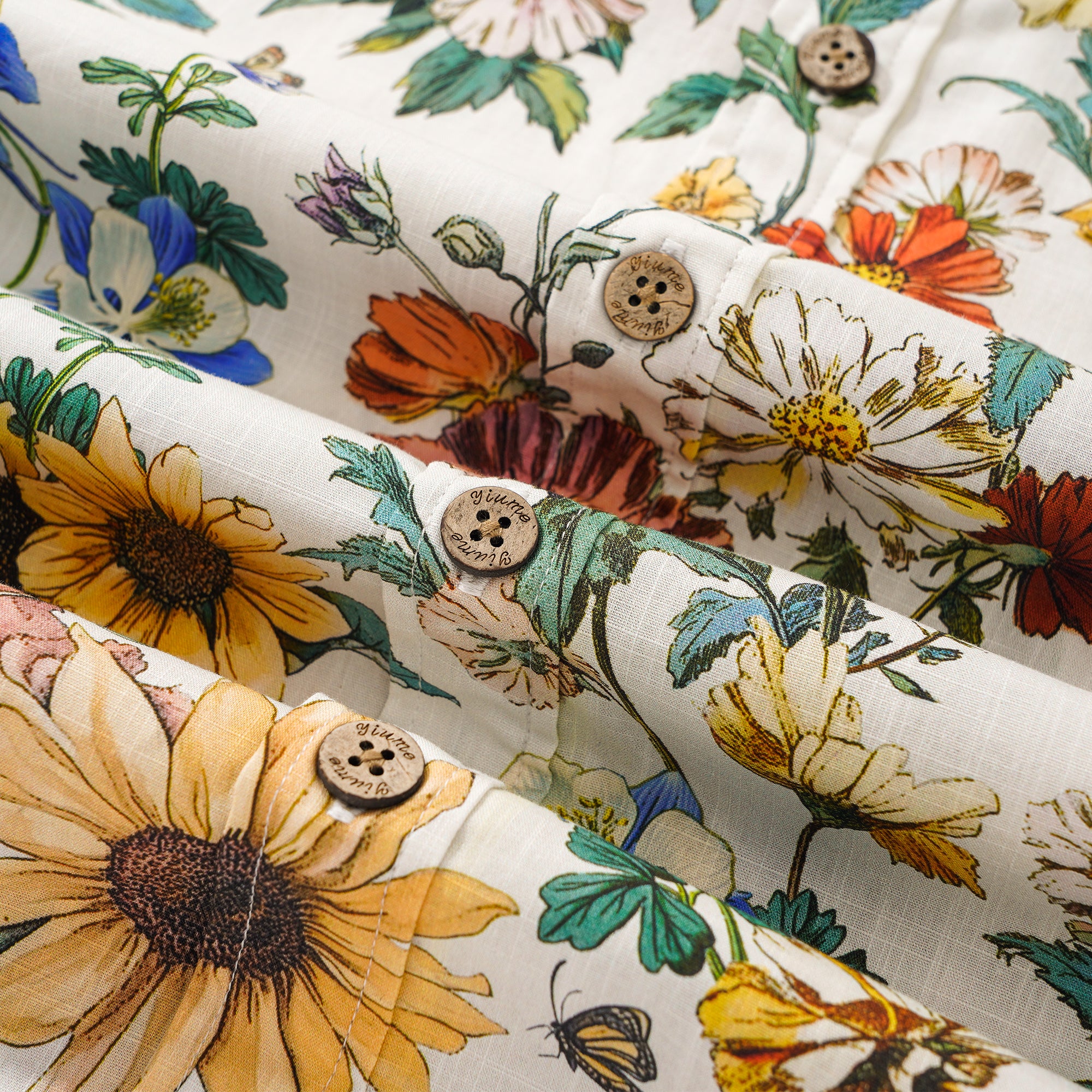 Ce design floral vintage dégage une romance et une élégance intemporelles. Présentant un mélange de tournesols vibrants, de délicates marguerites et d'autres fleurs dans des jaunes chauds et des roses doux en harmonie, les détails peints à la main donnent vie à chaque pétale et feuille. Des papillons virevoltent dans la scène, ajoutant une touche ludique. Parfait pour ajouter une touche d'art rétro à votre chemise hawaïenne, c'est un mélange unique de charme et de sophistication.