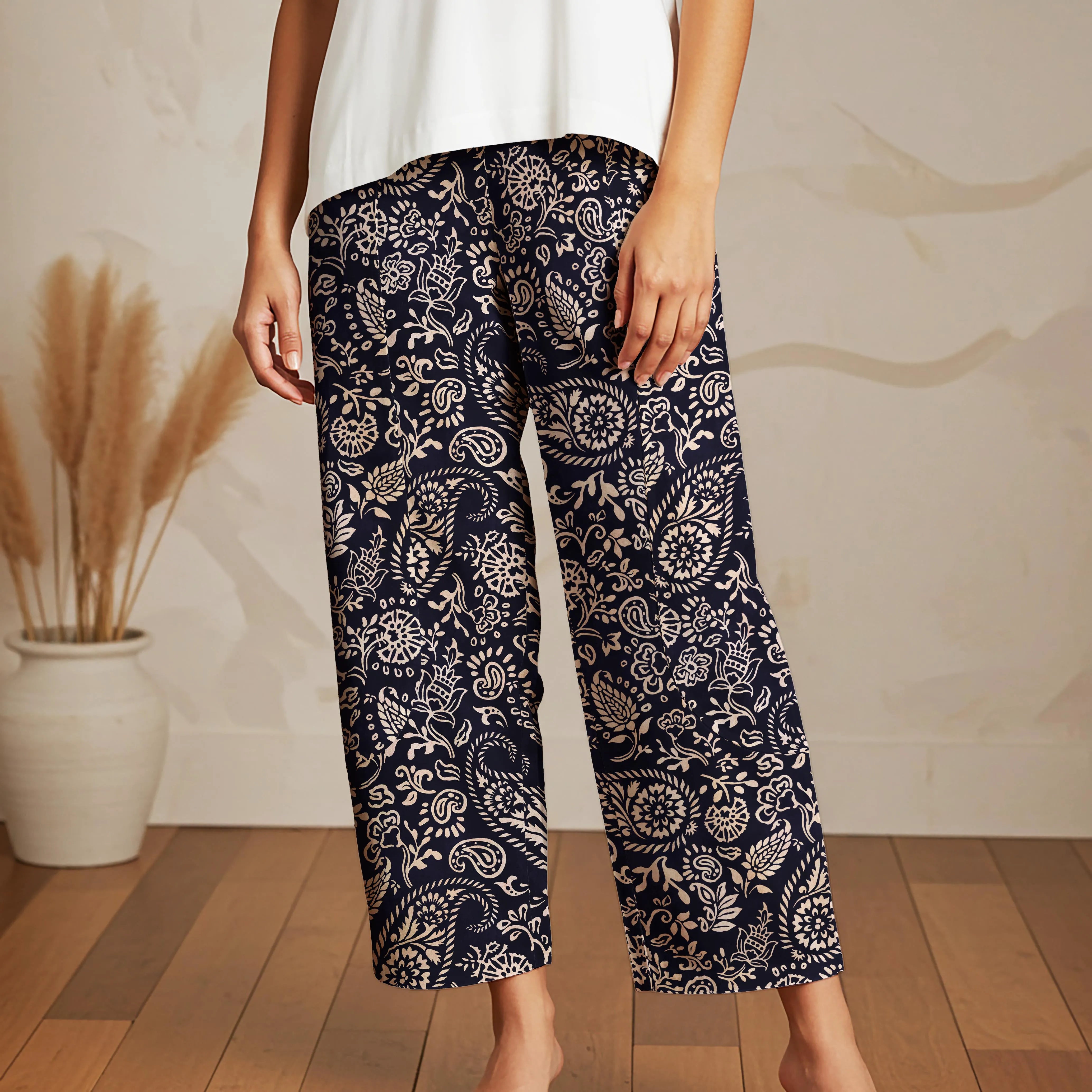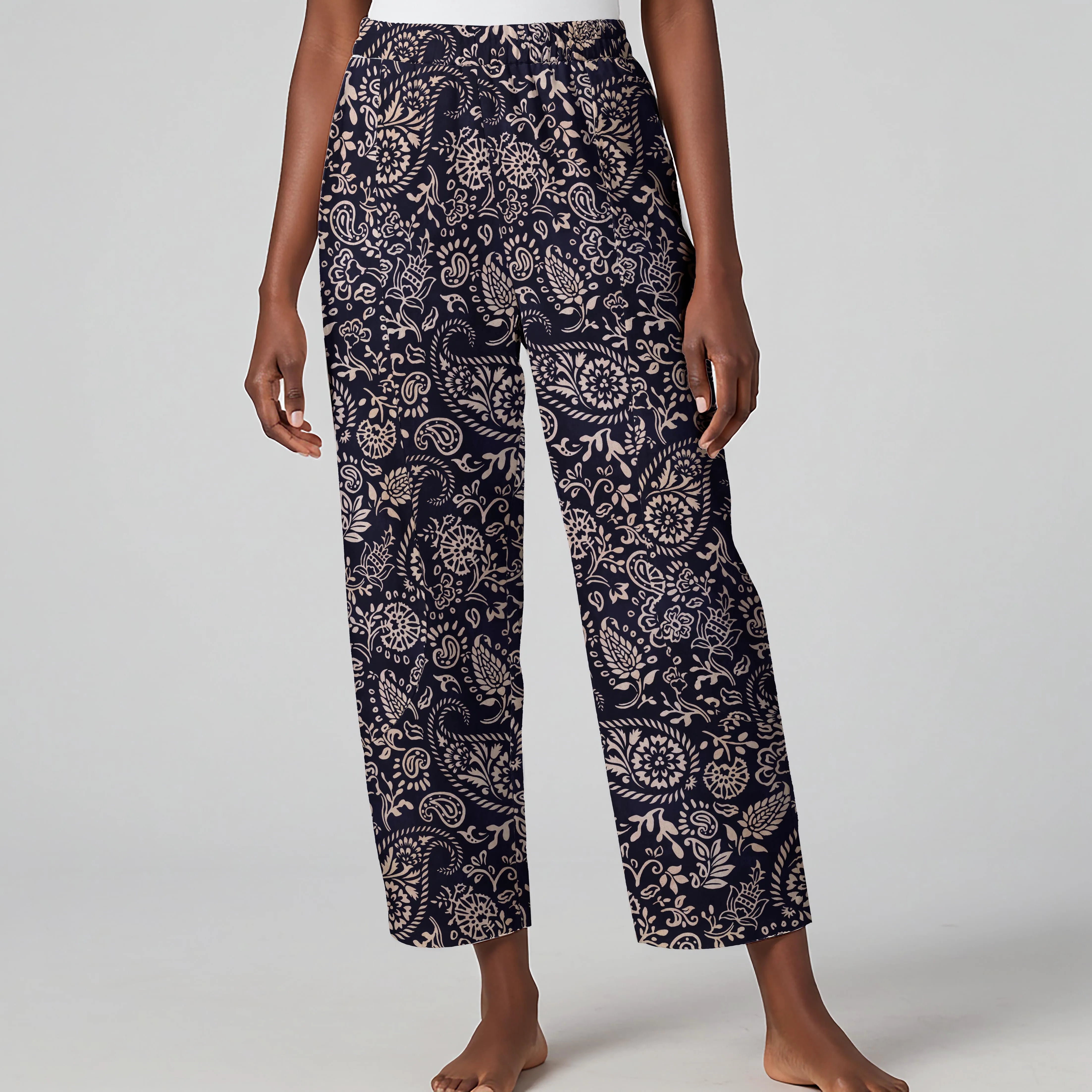 Women Casual Ankle Pants Lounge Elastic Waist with Pockets 93% Lyocell, 7% Linen Black Aloha Elegant Paisley