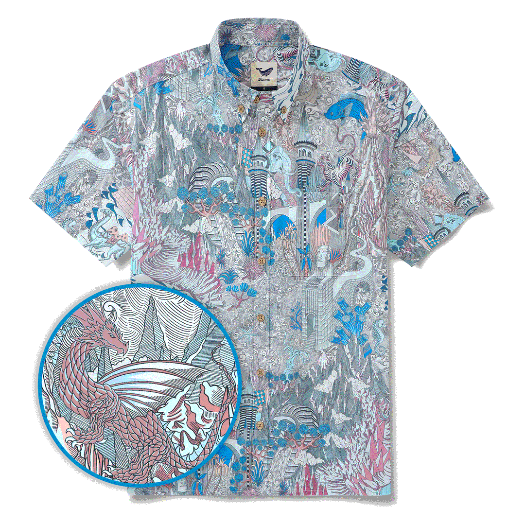 Hokusai inspired Fujiyama Ocean theme blue on white Aloha button down short sleeve shirt was out of its mail box and onto me within an hour! Pictured on me as we visited Christmas Train exhibition Flower Dome Singapore. Shirt is a work of art. Appreciate the spare buttons attached to the laundry instructions tag. Comfortable (although I chose one size too big)