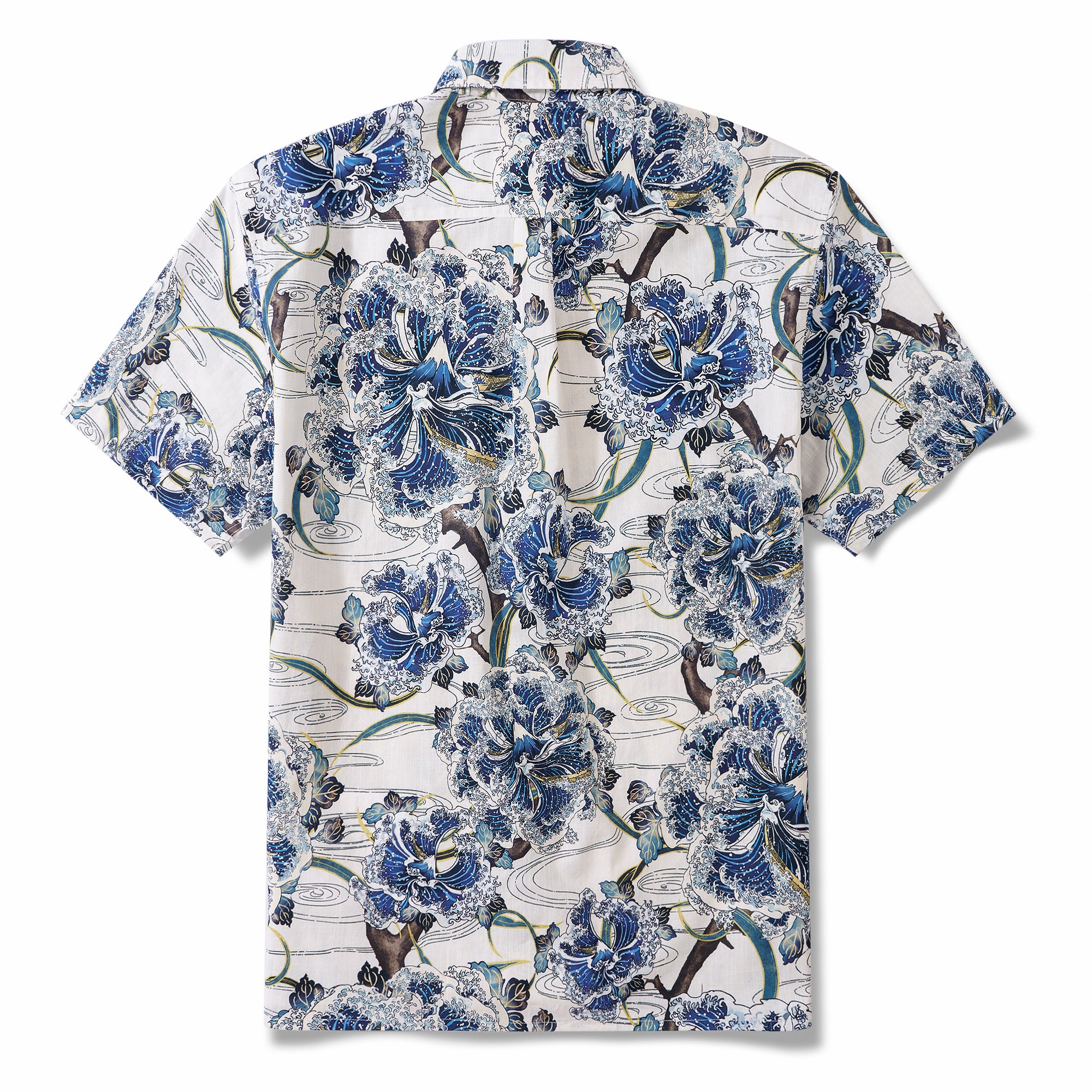 Ocean Waves on Branchs綿100%男性用半袖ボタンネックシャツ白アロハハワイ