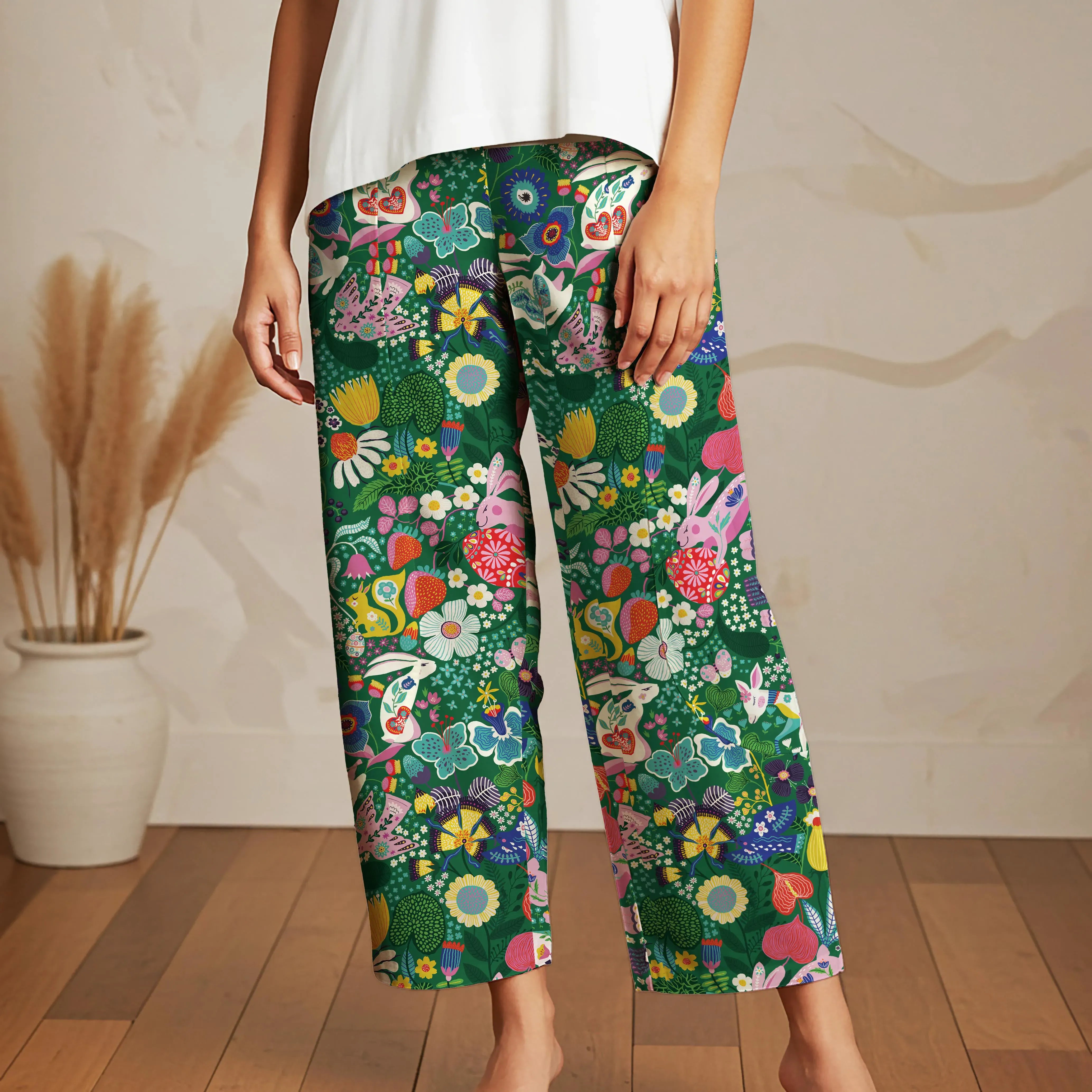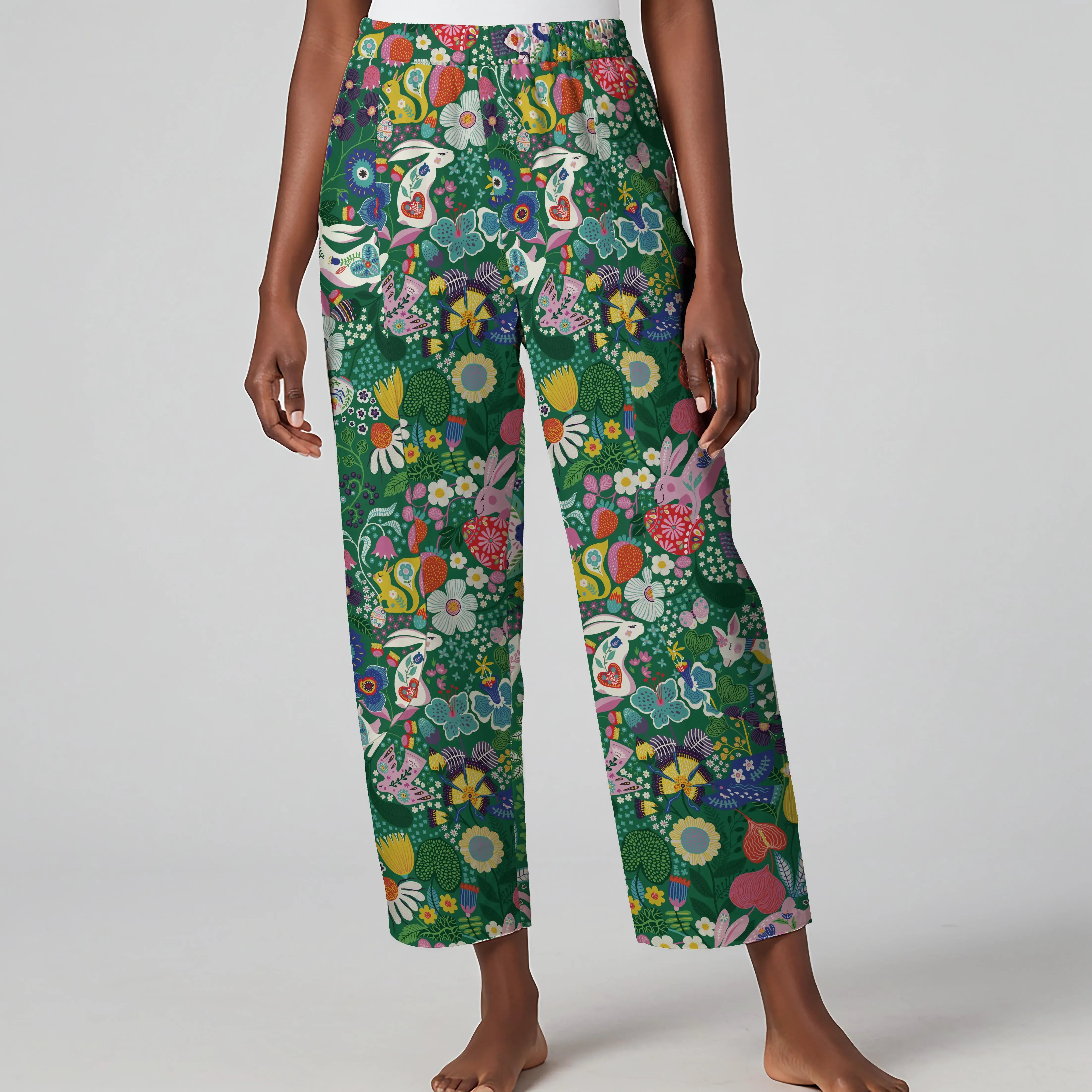 Women Casual Ankle Pants Lounge Elastic Waist with Pockets 93% Lyocell, 7% Linen Green Aloha Countryside Easter Feast