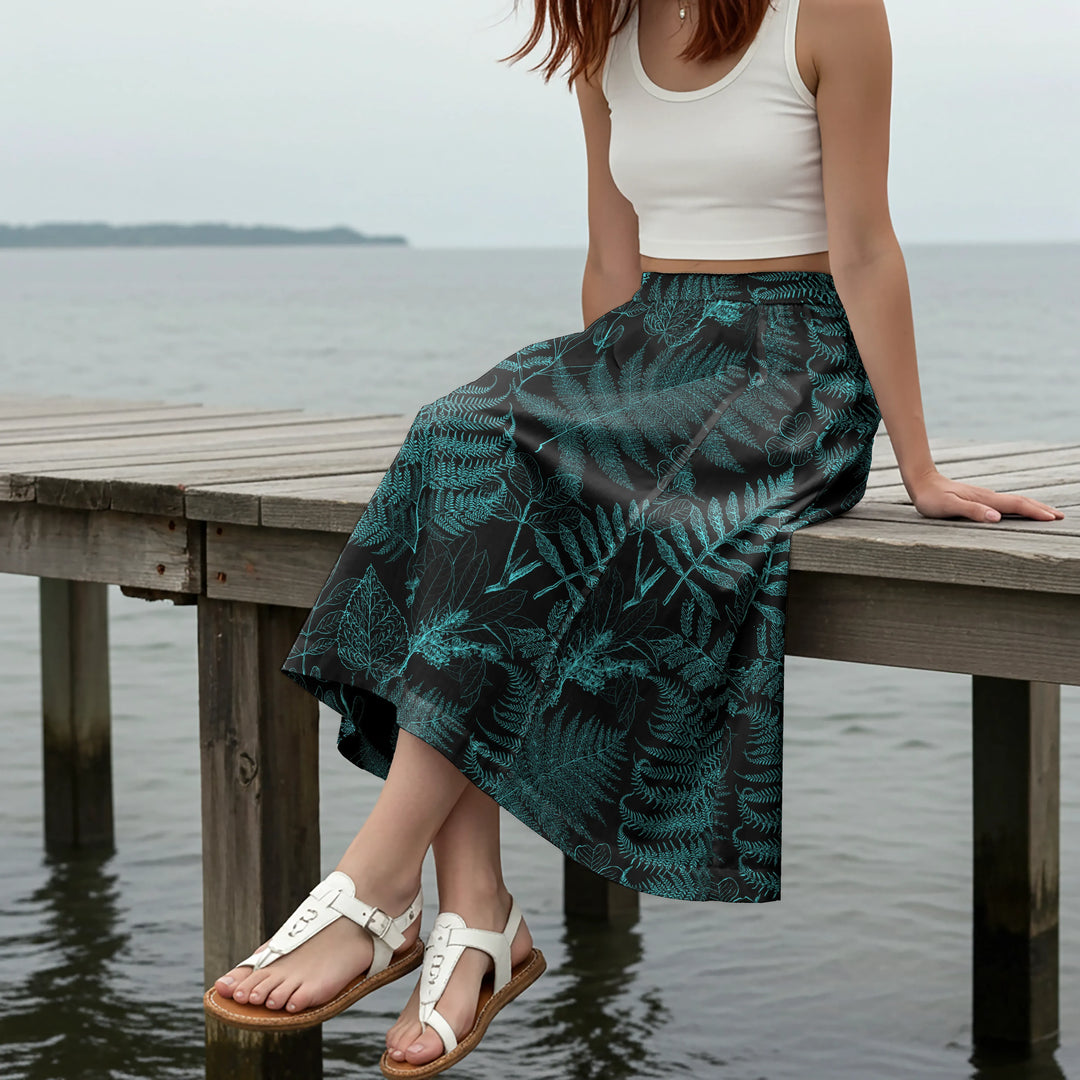 Women Casual Maxi Skirt Long Elastic Waist with Pockets 100% Cotton Blue Aloha Hidden Forest Fern