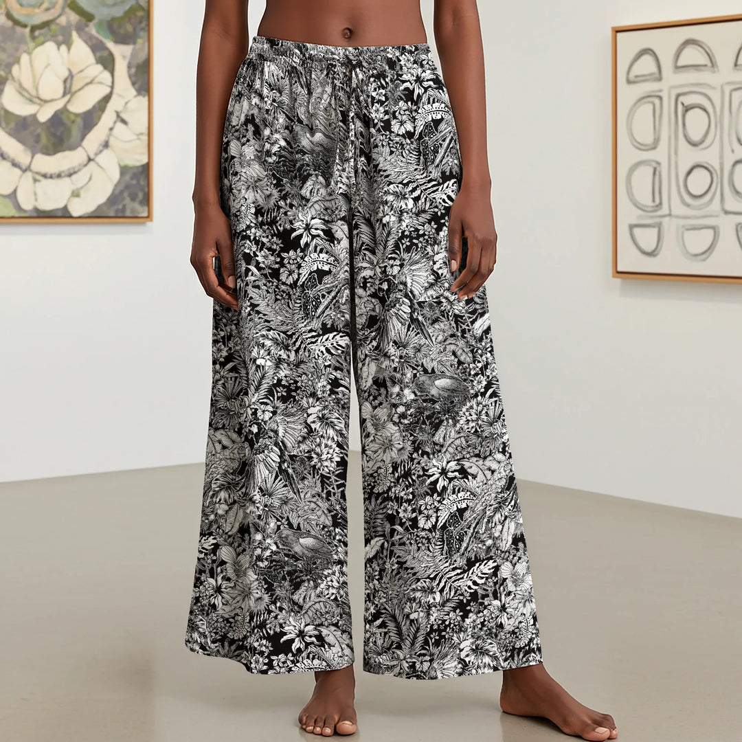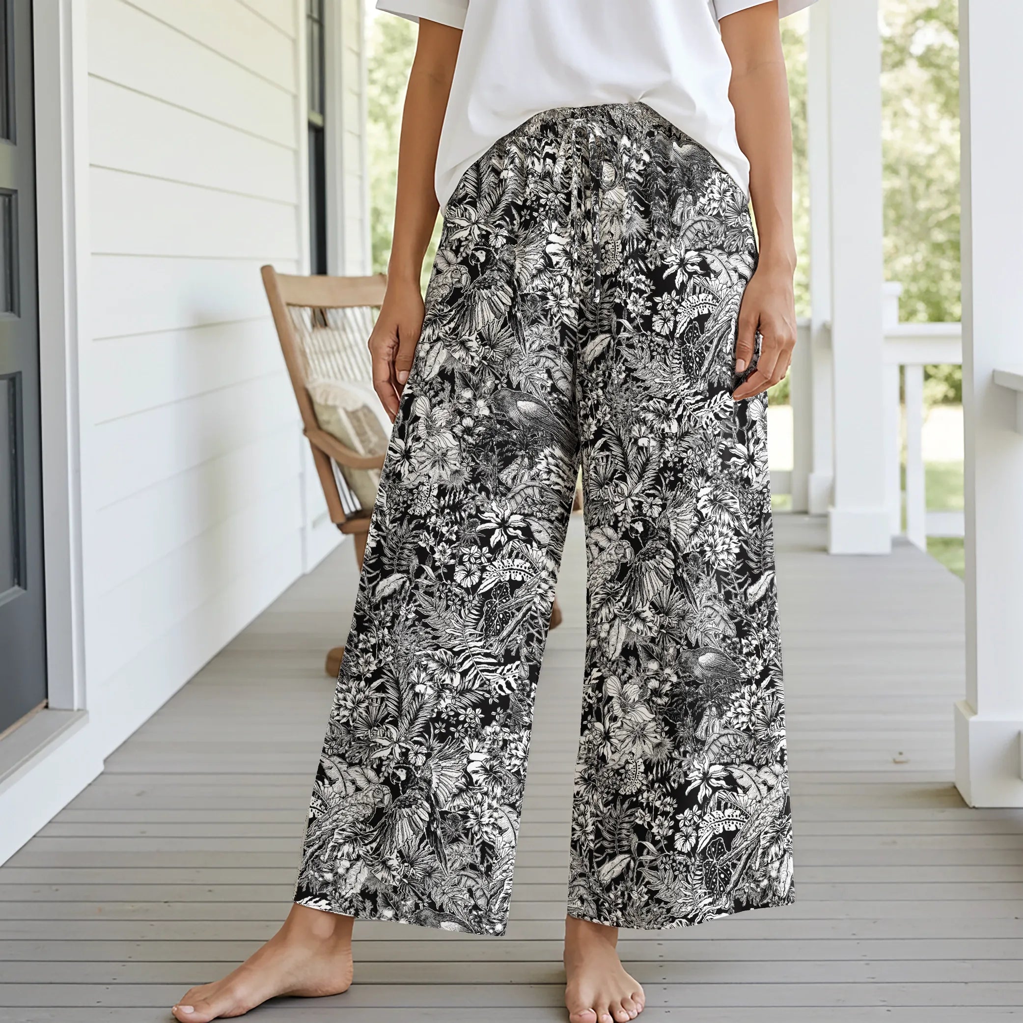 Women Casual Pants Lounge Elastic Waist Drawstring with Pockets 93% Lyocell, 7% Linen White Aloha Monochrome Tropical Jungle Charm
