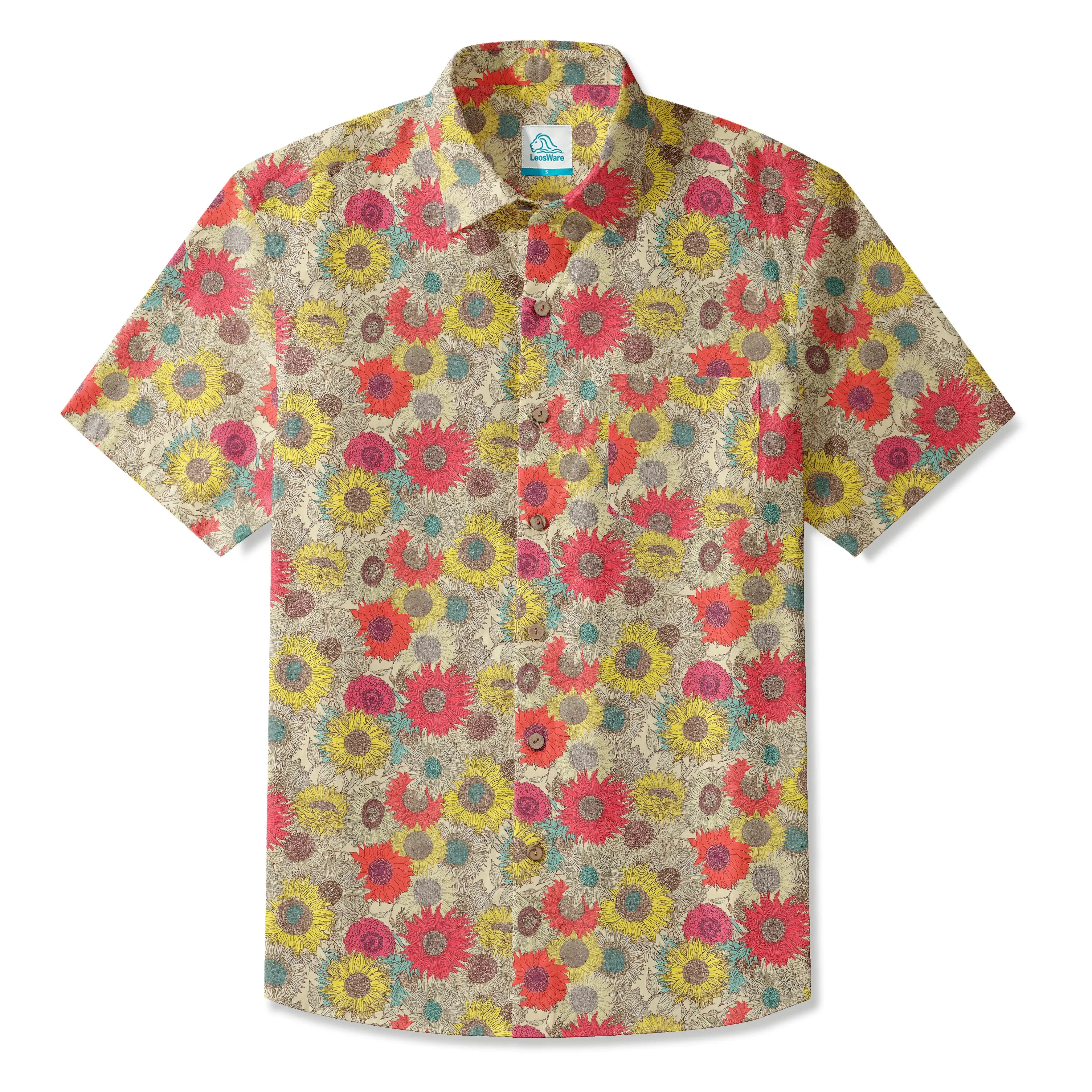 LeosWare® Men's Hawaiian Shirt Short Sleeve Button-up 100% Cotton Beige Aloha Earth Day Sunflower Garden Embroidery Kit