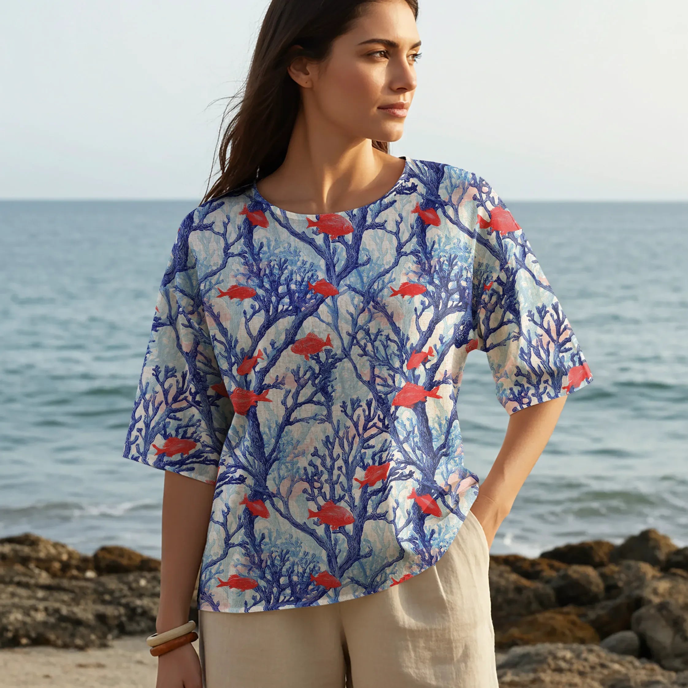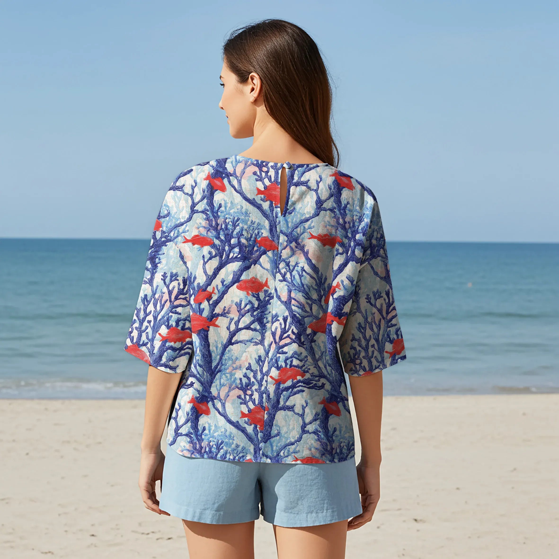 Women Casual Blouse Elbow Sleeve Crew Neck Button-Back 95% Lyocell, 5% Linen Blue Aloha Messenger Of The Earth's Red Fish