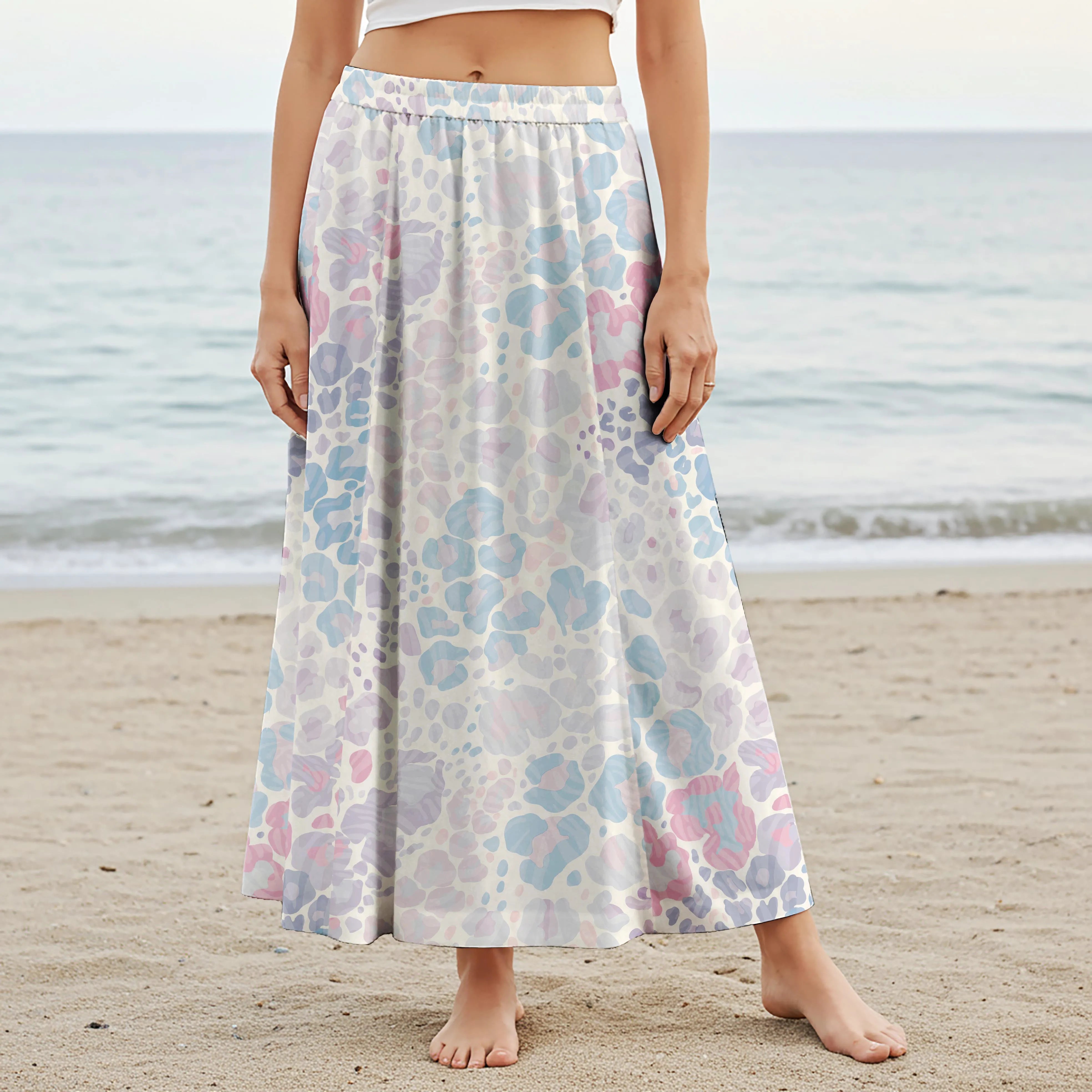 Women Casual Maxi Skirt Long Elastic Waist with Pockets 100% Cotton Beige Aloha Tropical Leopard Fantasy Camo Print