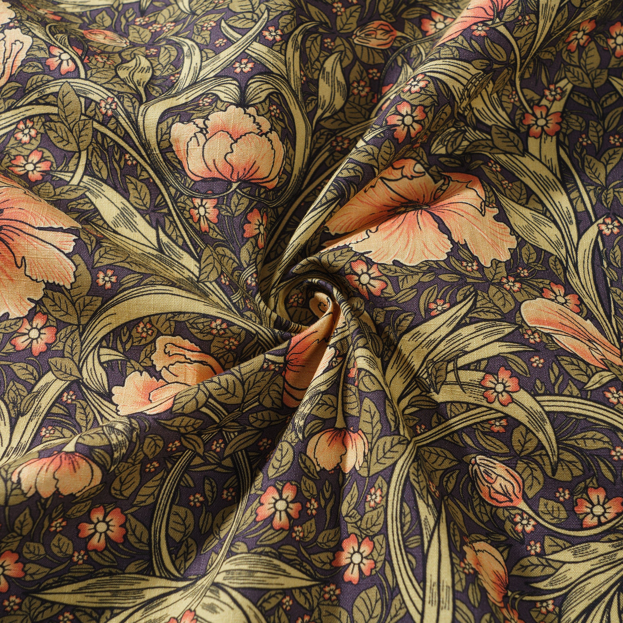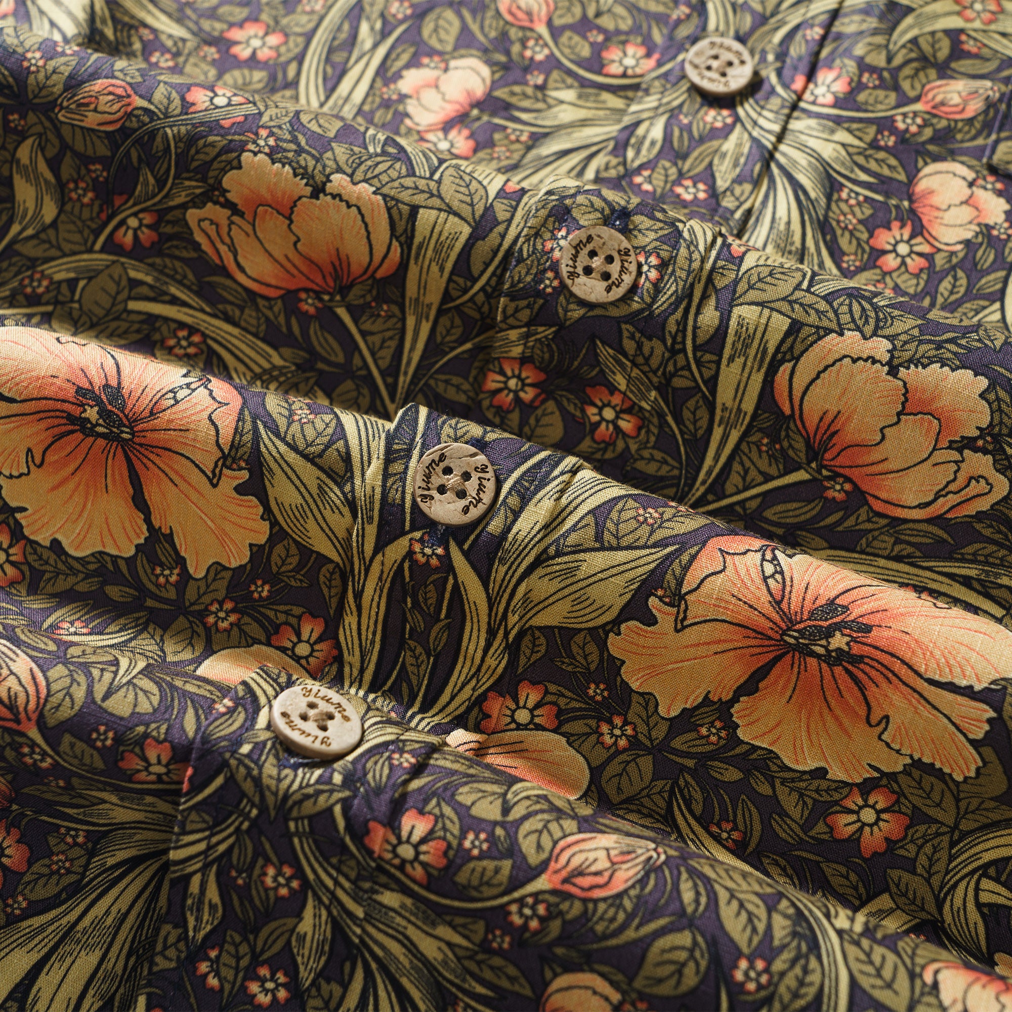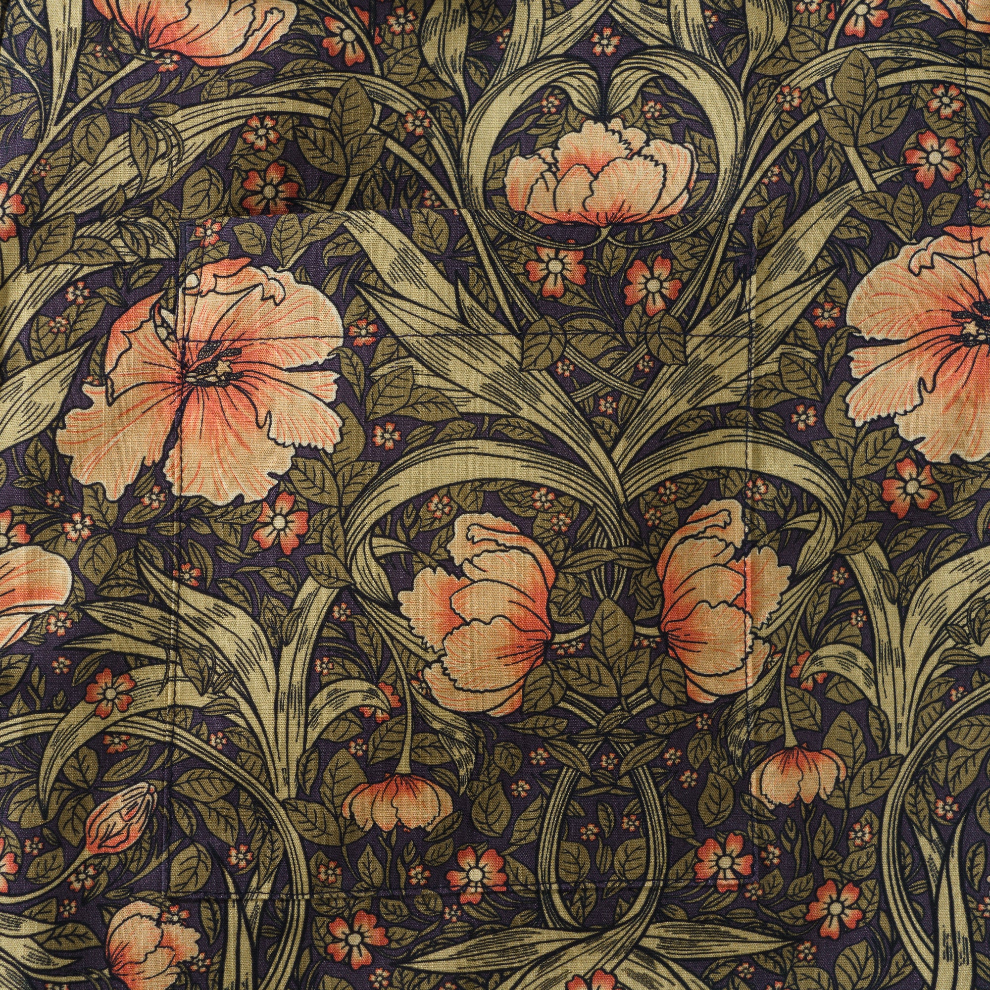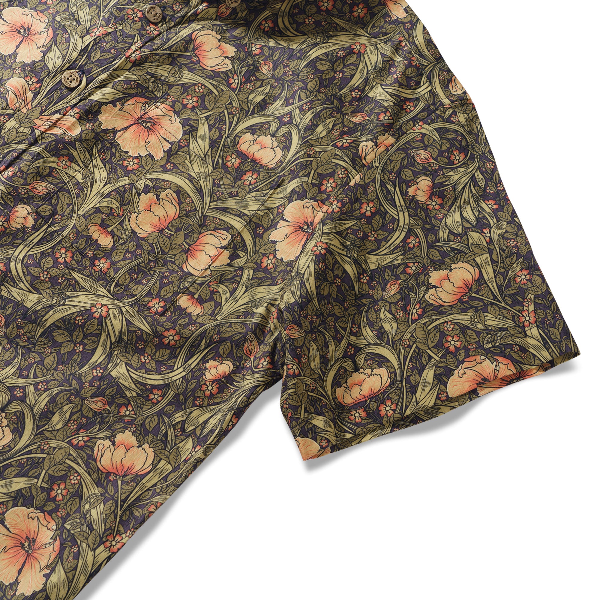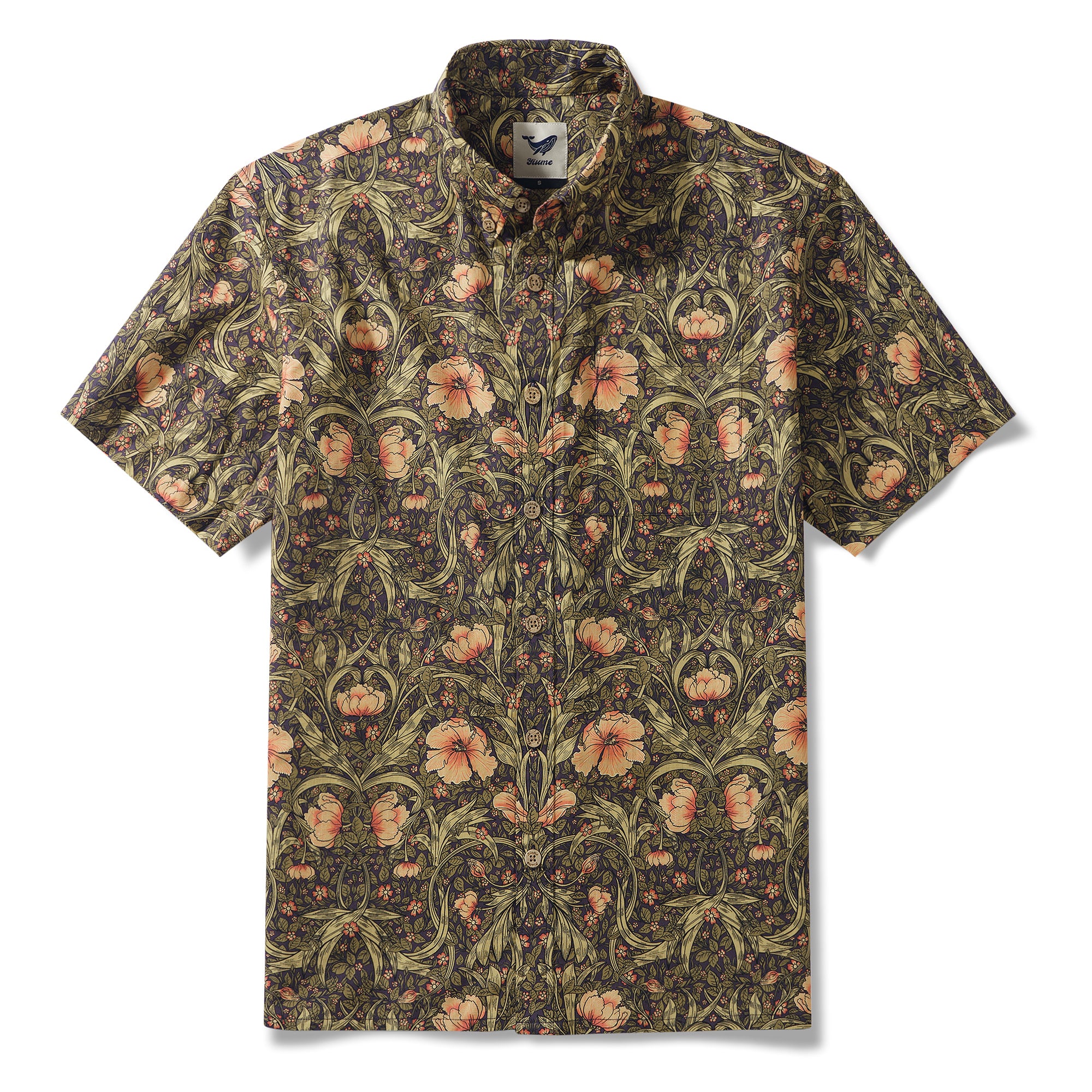 Drawing inspiration from the Morris style, this shirt design intricately weaves together flowers and leaves to create a lush and dynamic natural scene. The vibrant flowers bloom with rich and colorful hues, each petal either unfurling or in bud. The leaves meander and extend, with clear veins, intertwining and complementing the flowers to form an organic whole. The fluid and rhythmic lines delicately outline every contour and detail, as if the vitality of nature is flowing and spreading on the canvas, evoking a fresh, elegant, and vibrant sense. This design perfectly blends the beauty of natural elements with decorative art.