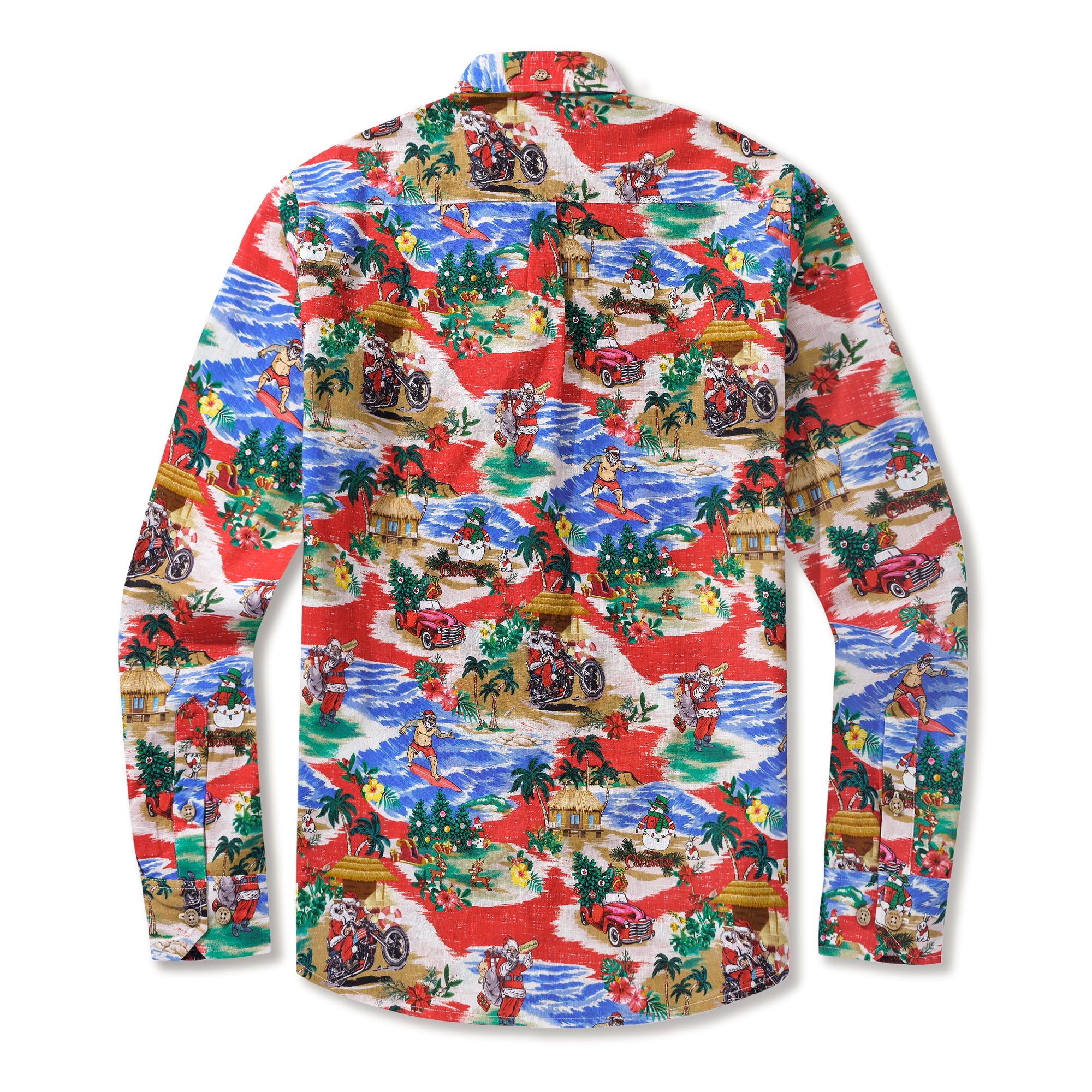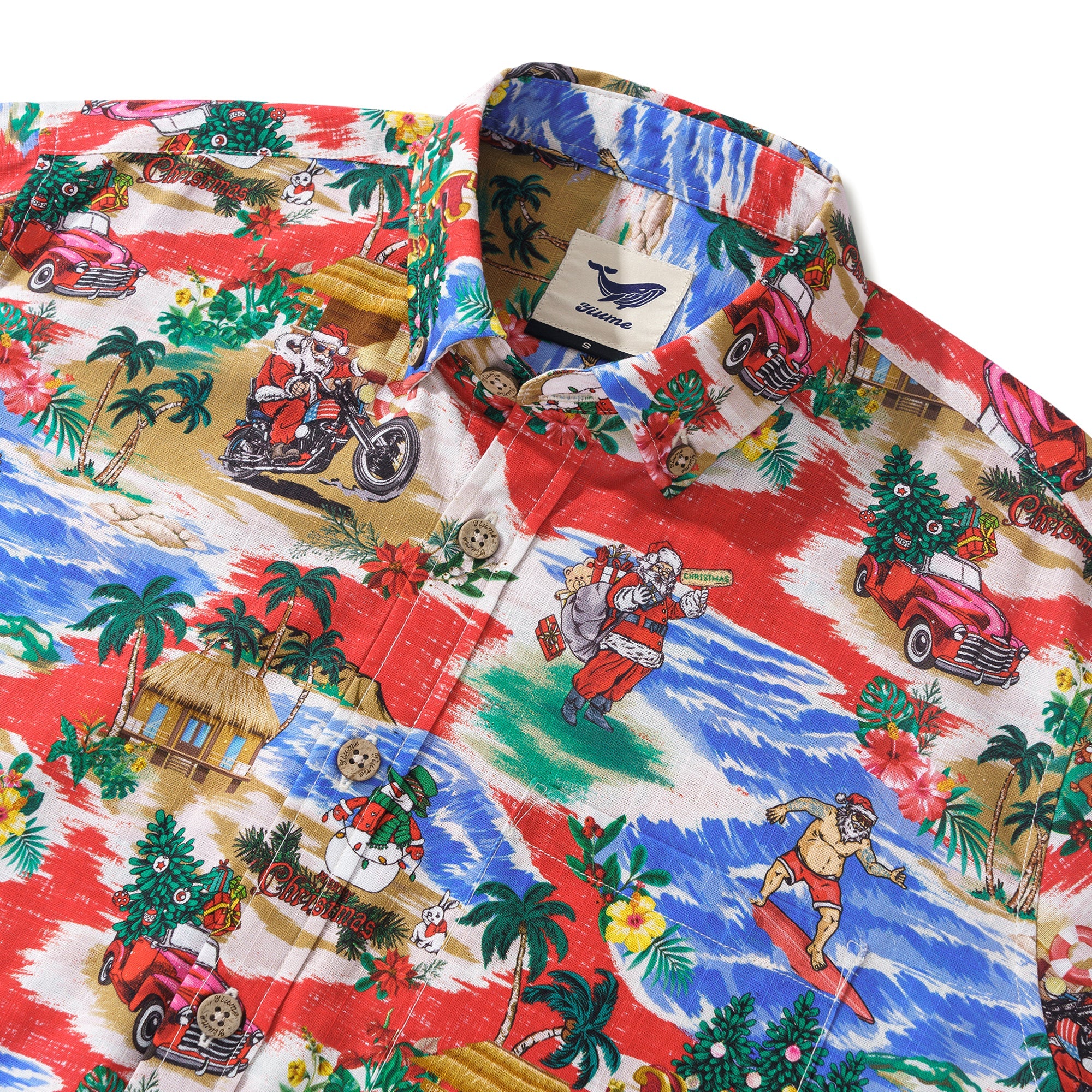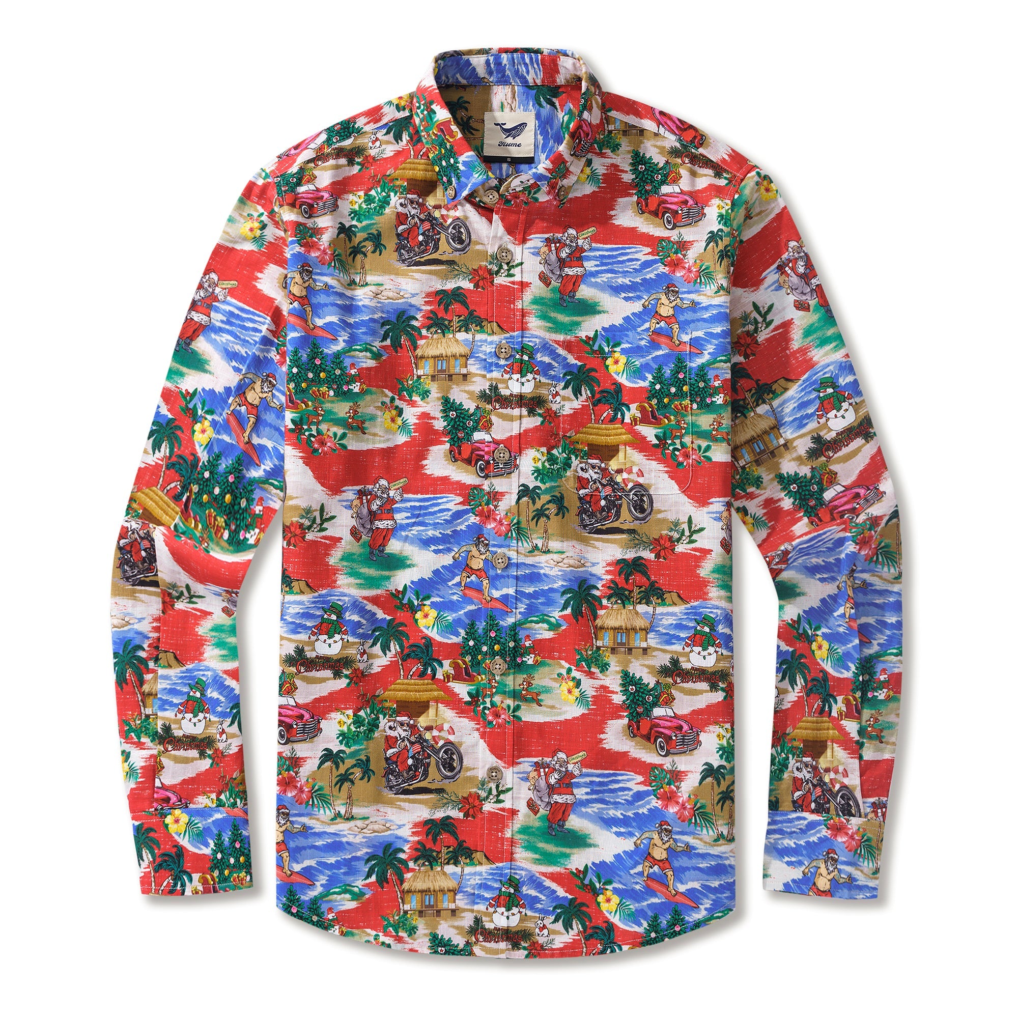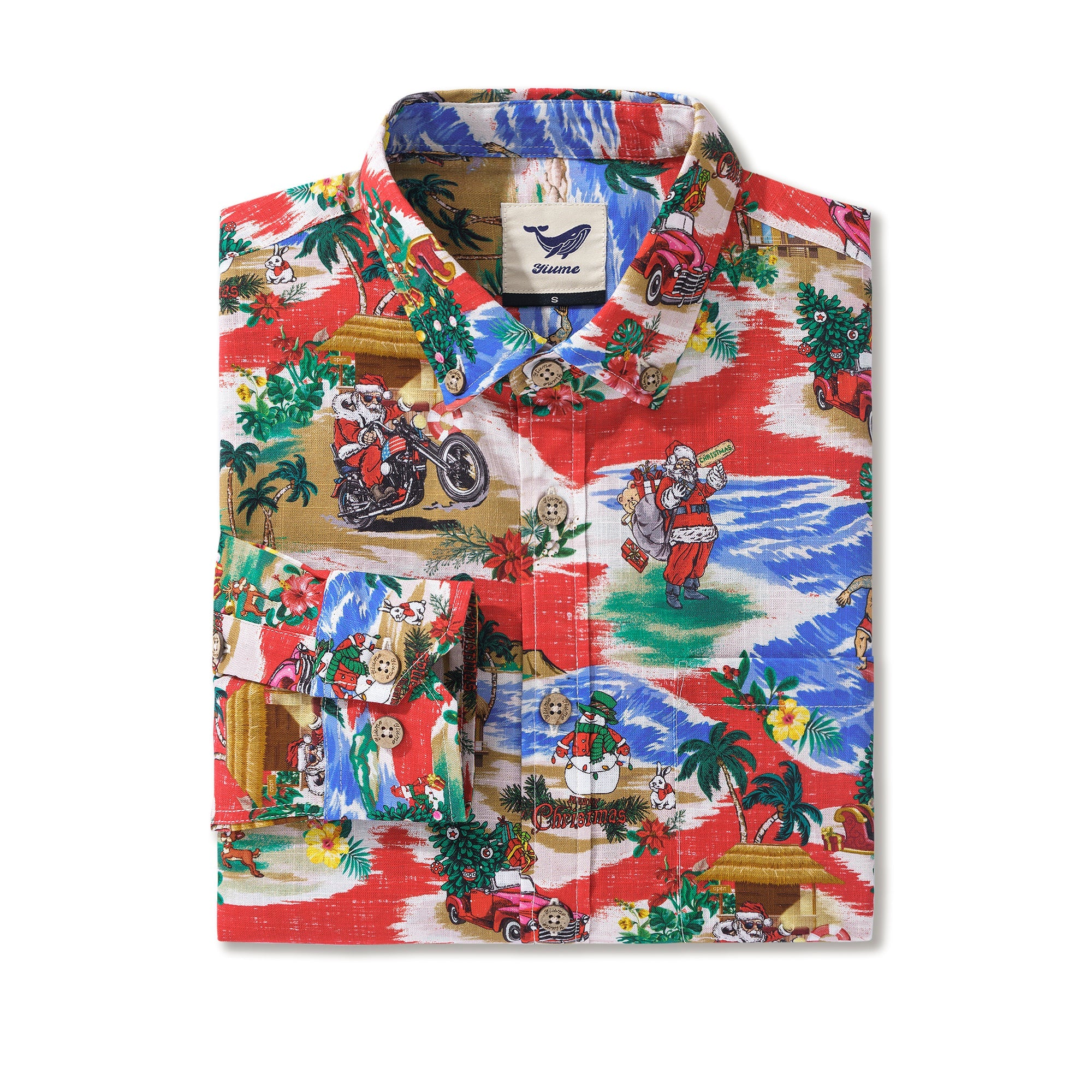 Christmas Long Sleeve Hawaiian Shirt For Men Santa Claus on a Harley 100% Cotton Button-down Aloha Shirt