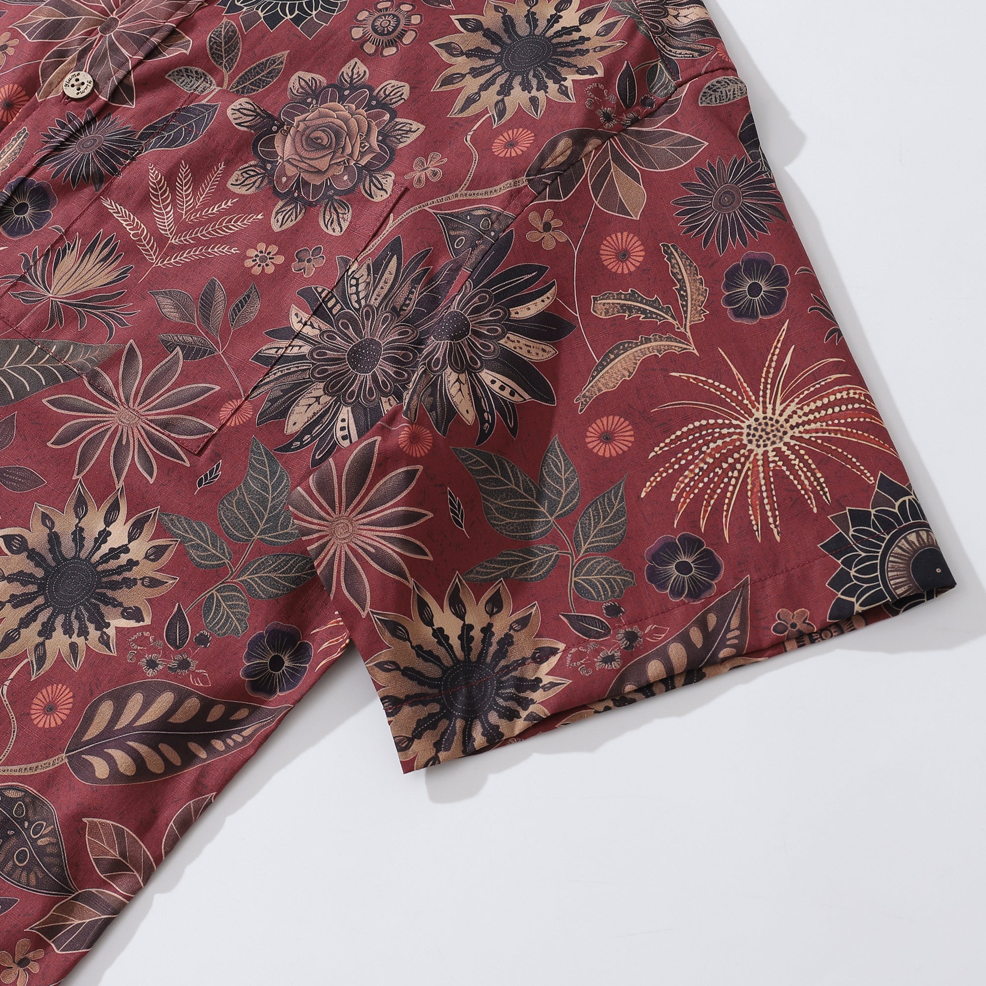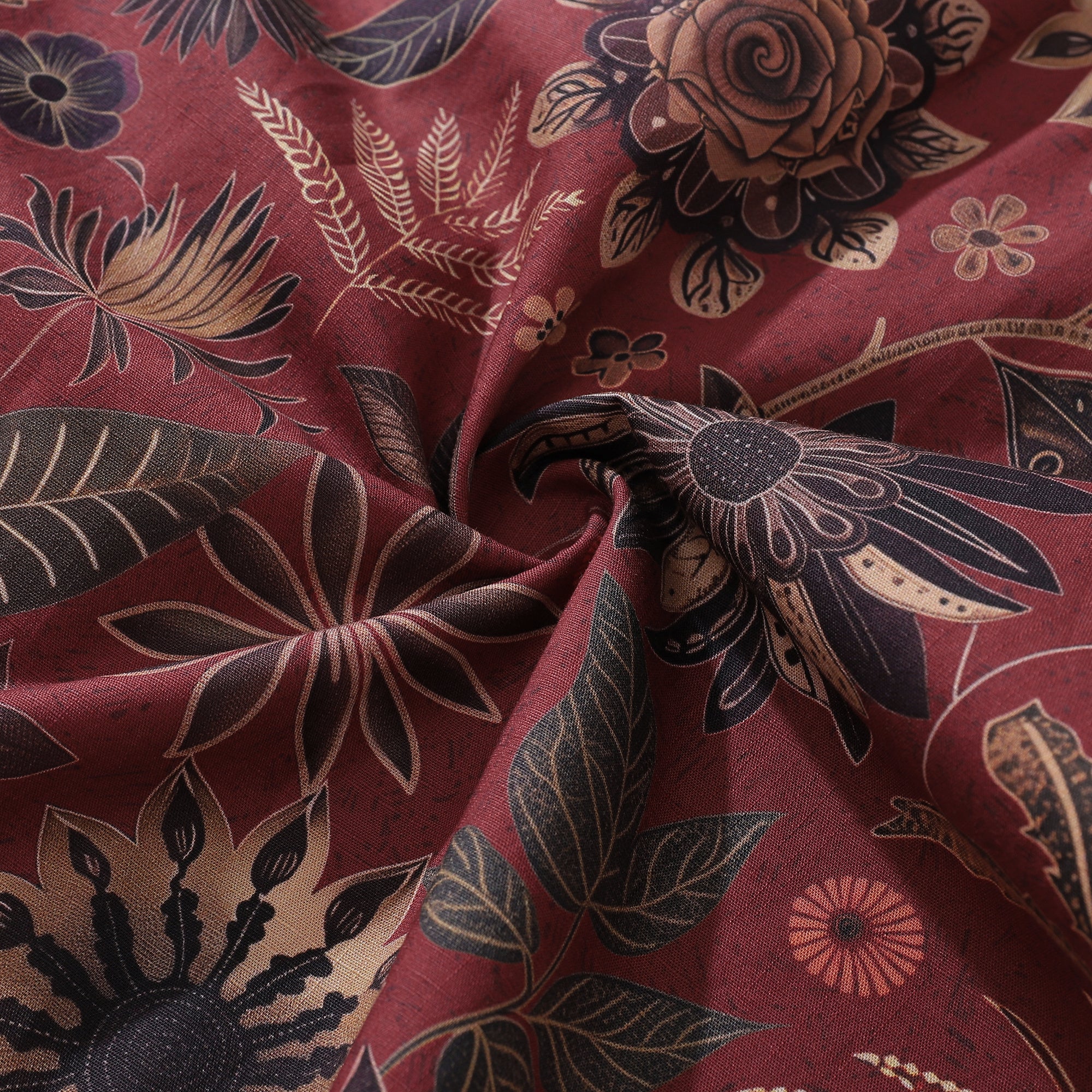 On the deep wine-red background, flowers bloom in varying depths, like a galaxy of stars in a garden. Whether it's a leisurely afternoon or an evening banquet, this print shirt, both classical and modern, is suitable. Let's together indulge in the secrets of this garden.