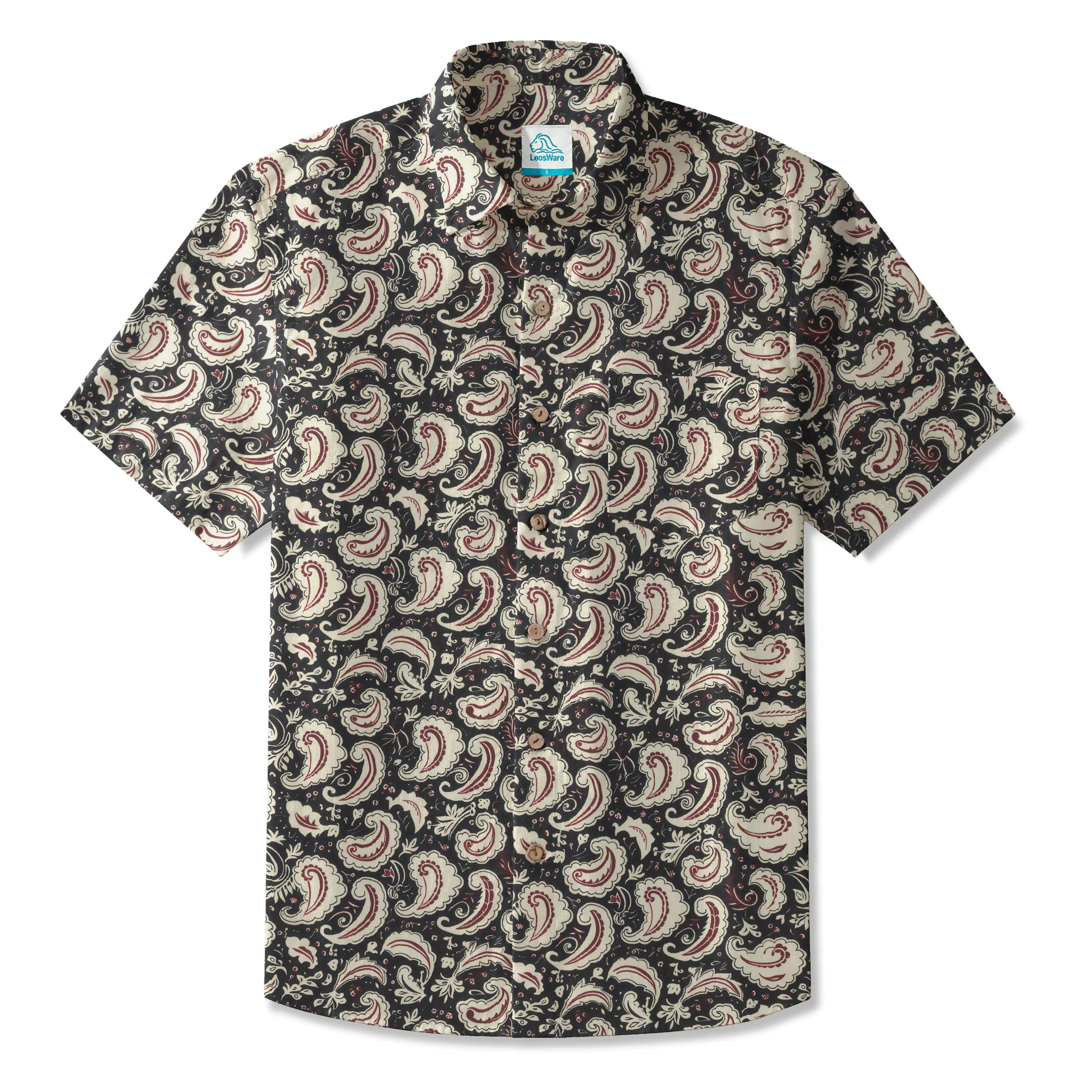 LeosWare® Men's Hawaiian Shirt Short Sleeve Button-up 100% Cotton Black Aloha Classic Paisley Elegance