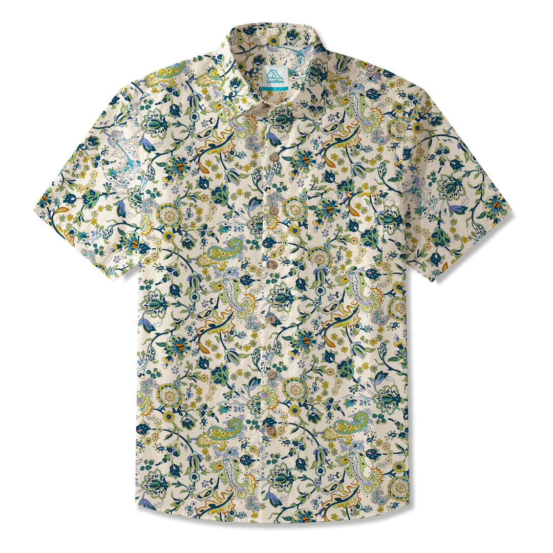 Inspired by vintage paisley prints and exotic florals, our shirt weaves a tapestry of blue, green, and gold hues for a captivating artistic narrative. Each swirl and floral detail is a masterpiece of retro craftsmanship. Embrace a walking tribute to vintage artistry.