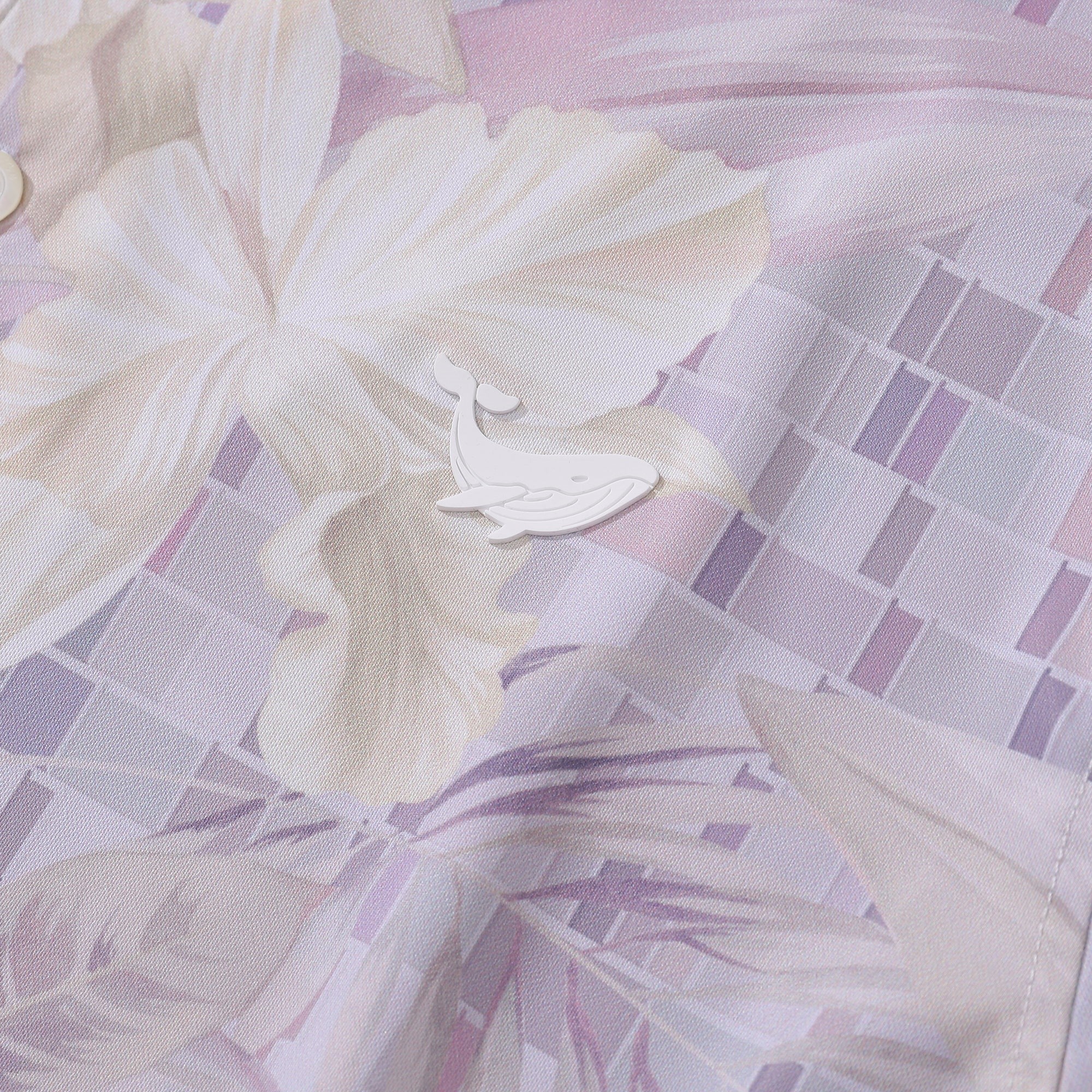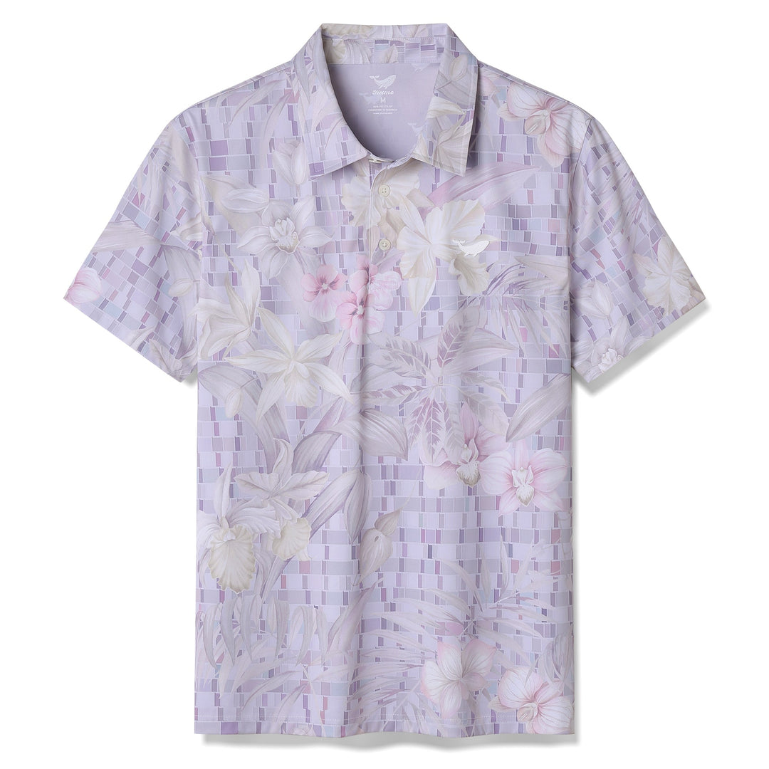 Based on geometric patterns, hand-drawn orchids and palm leaves are randomly scattered throughout, creating the illusion of being in a Hawaiian tropical rainforest. Rich colors ranging from soft pink to vibrant green make the entire polo shirt look both casual and sophisticated.