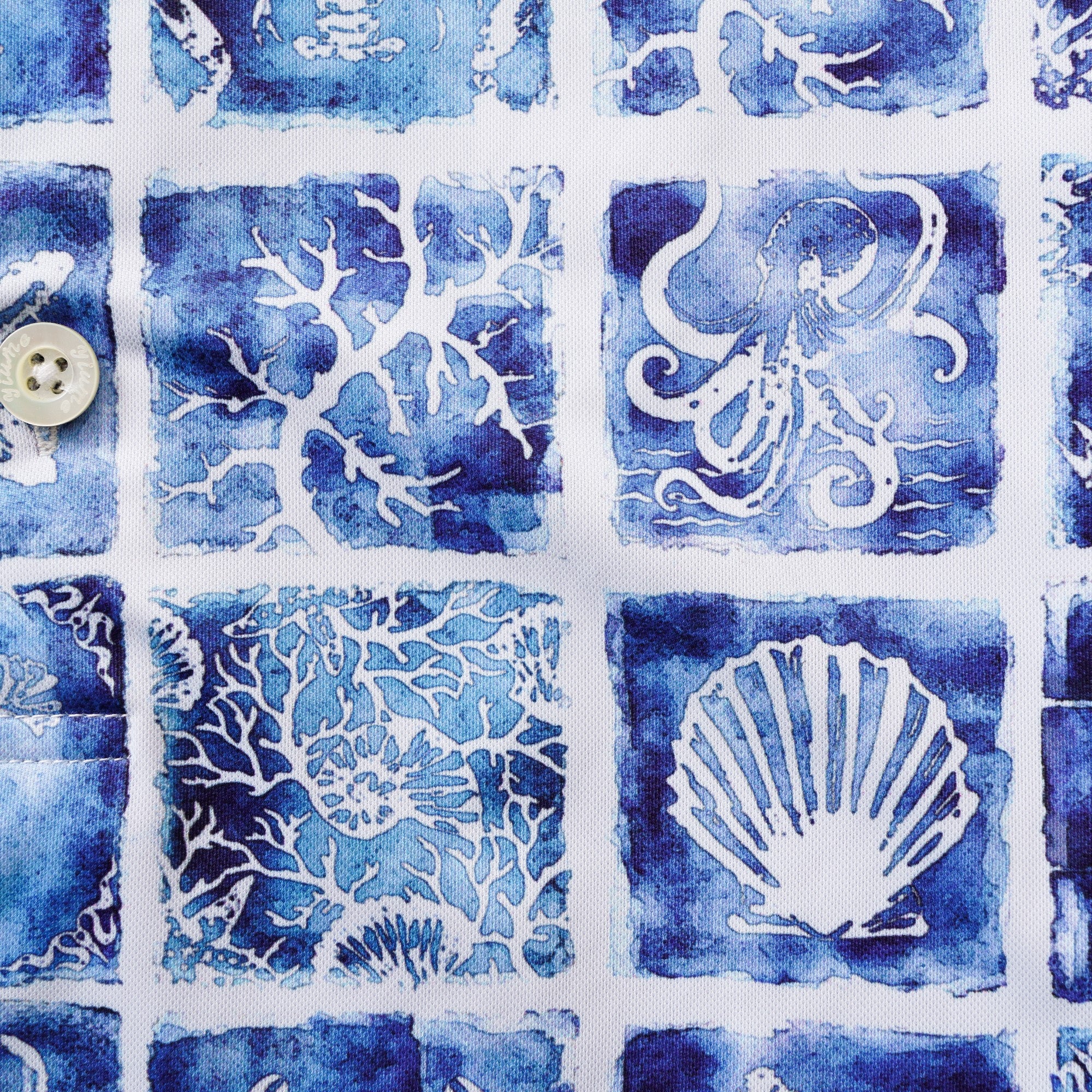 This design captures the essence of the sea with a series of square patterns, each featuring marine life artfully framed in watercolor-like blocks—like unique oceanic symbols. The orderly arrangement creates a bold, coastal vibe. Perfect for casual outings or summer getaways, this polo shirt effortlessly expresses a love for nature and a free-spirited lifestyle.