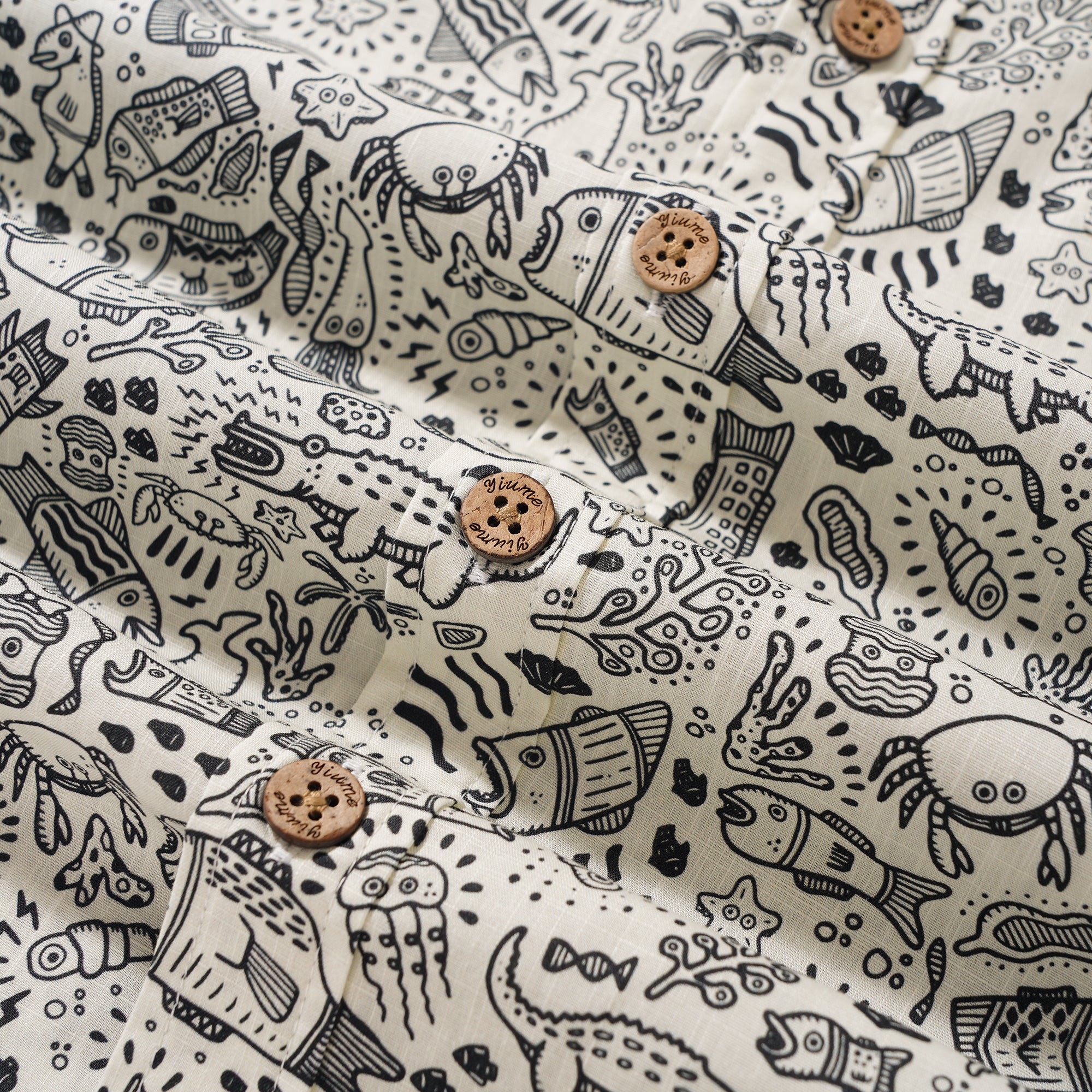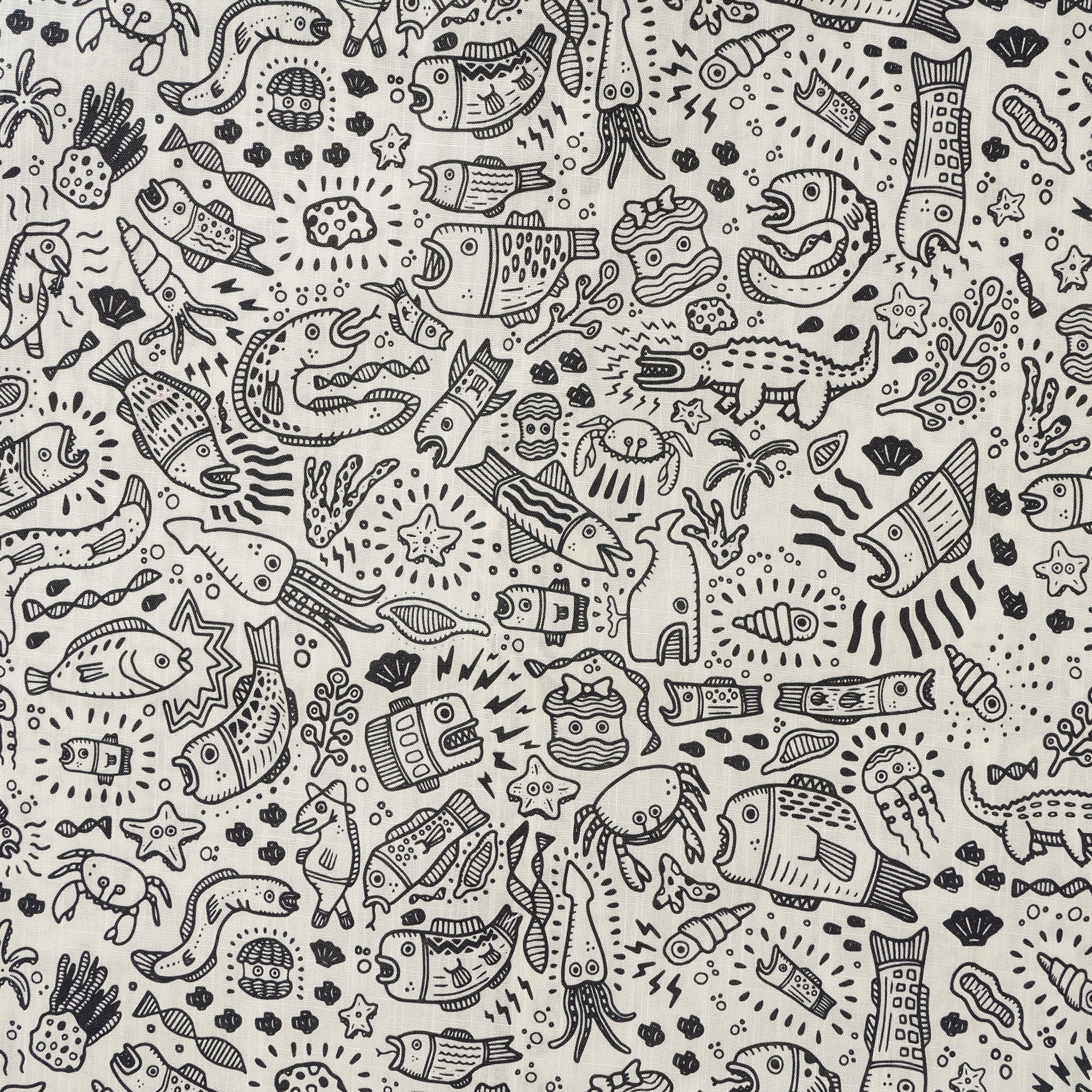 Embrace the whimsical world of the ocean with our hand-drawn pattern. Featuring a charming mix of underwater creatures like crabs, fish, and eels, this design captures the playfulness of the sea. Inspired by the artist's childhood in the Philippines, each doodle-like flourish adds a touch of animation to your look.