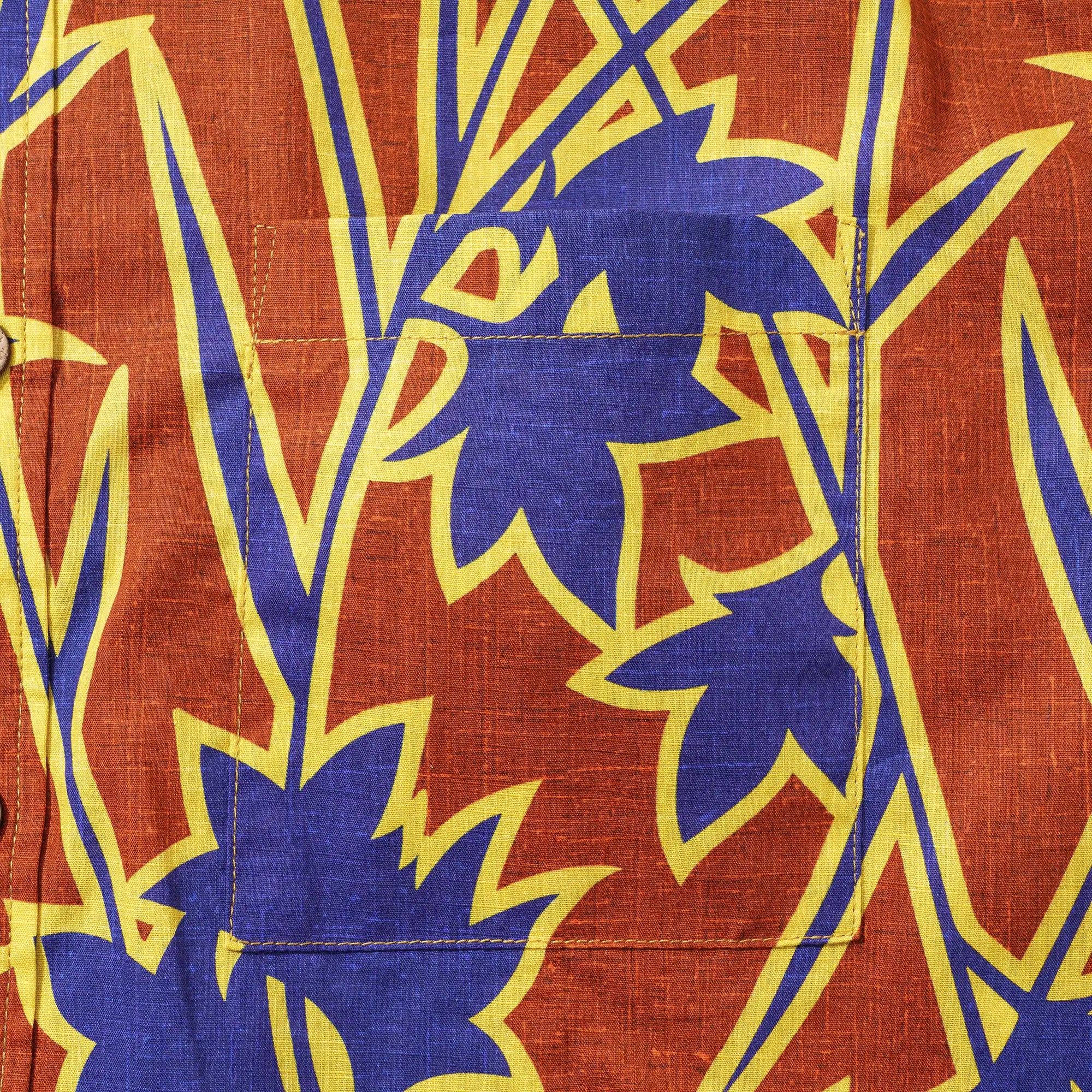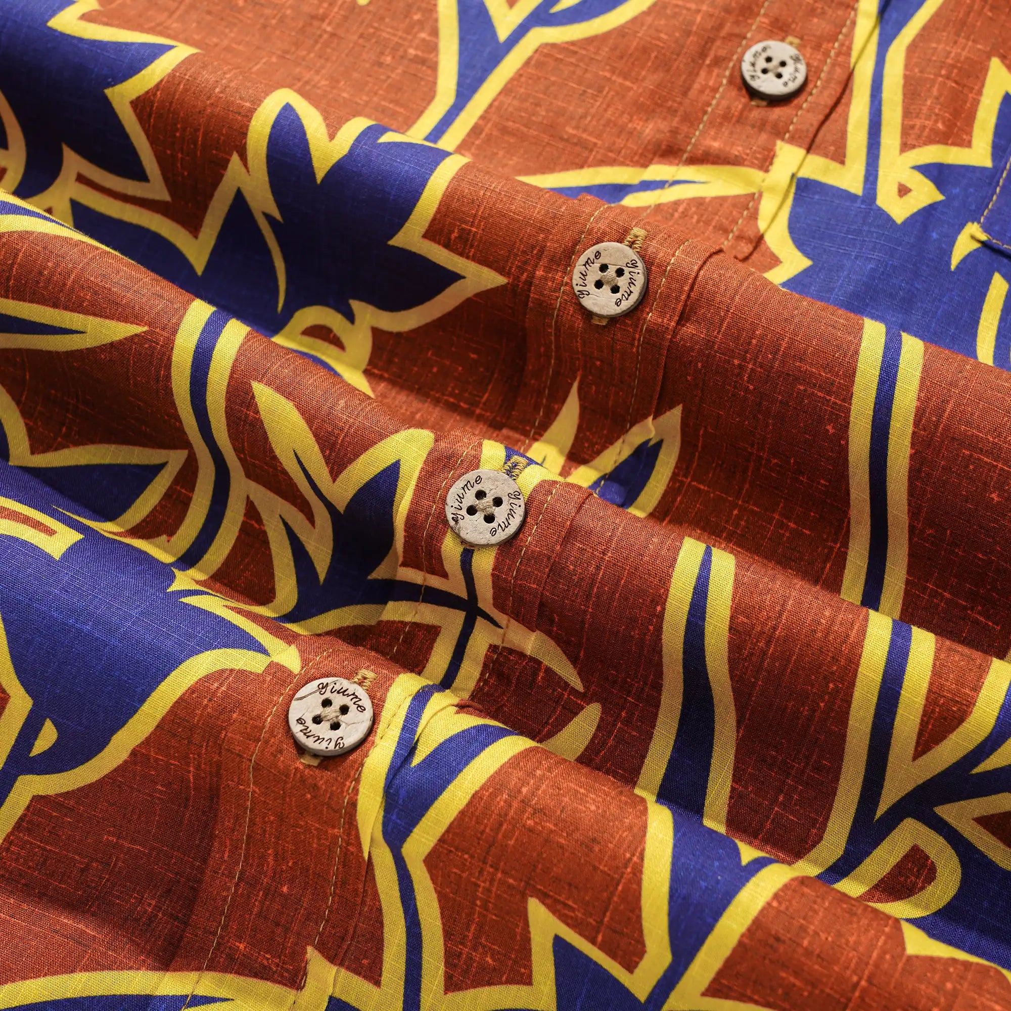 This warm brown shirt features blue flowers and golden outlines, creating a vintage yet vibrant feel. The stylized floral and vine patterns evoke classic botanical illustrations. The rich navy, shimmering gold, and warm brown colors offer a striking contrast, blending classic elegance with modern visual impact. Perfect for those who appreciate a mix of traditional charm and fresh design.