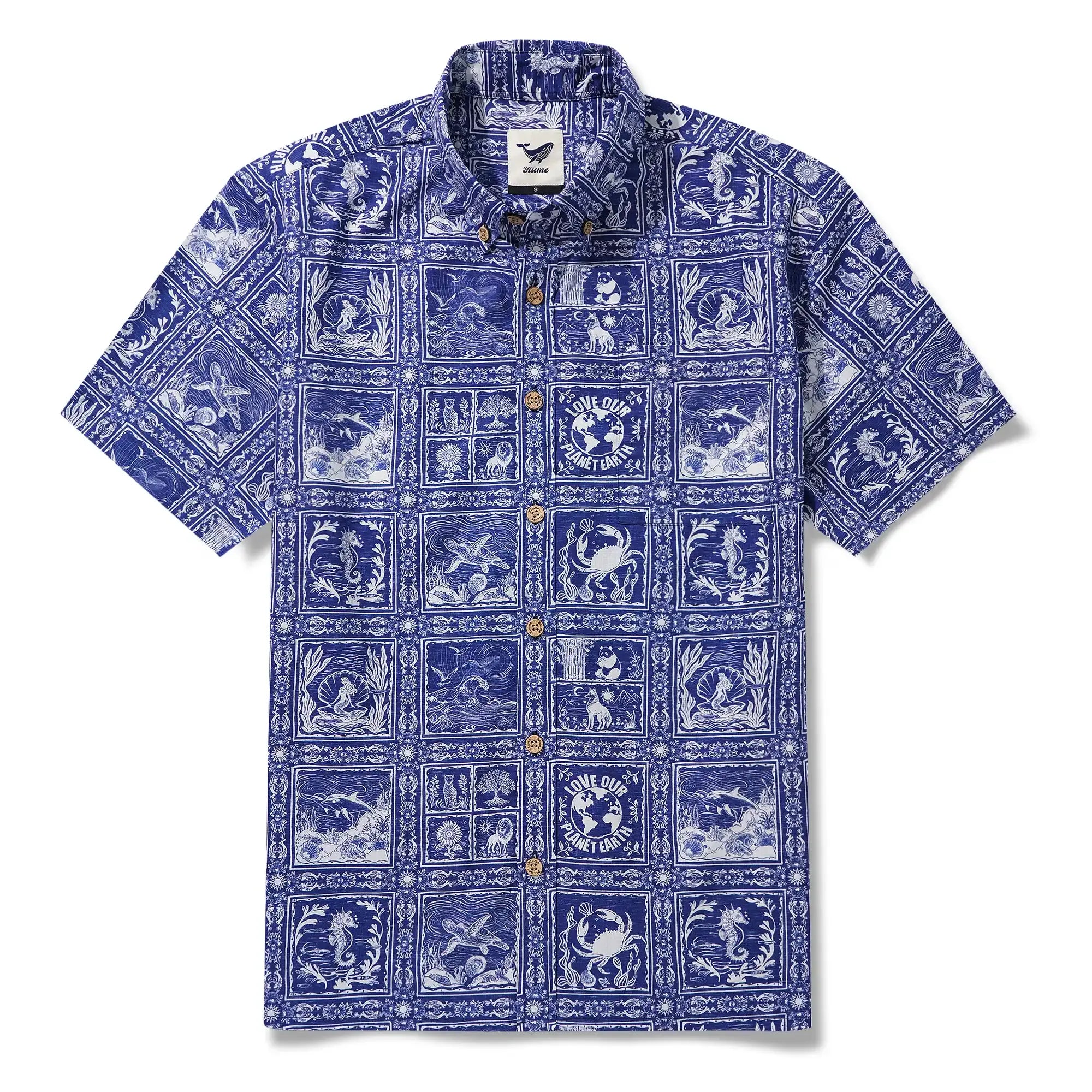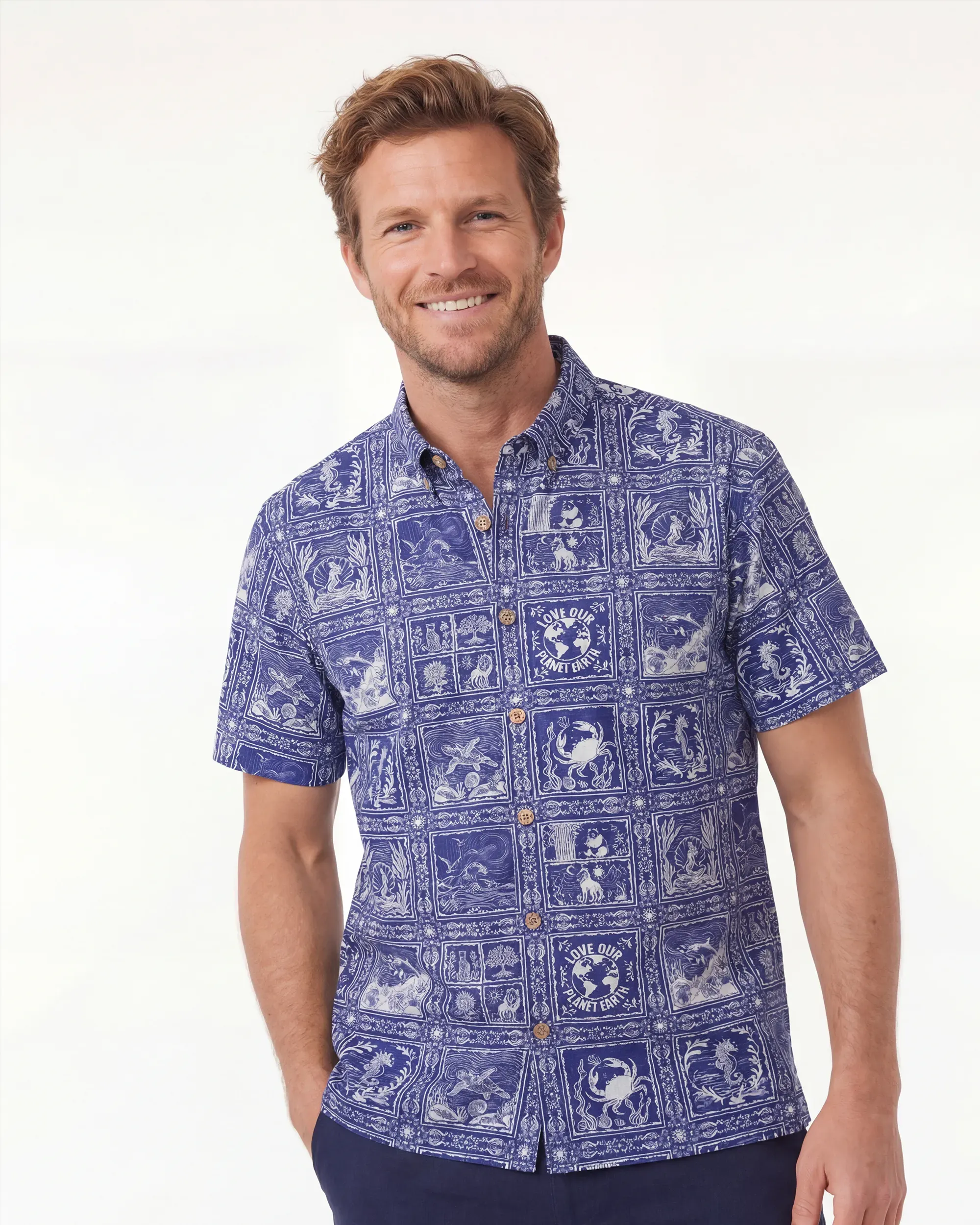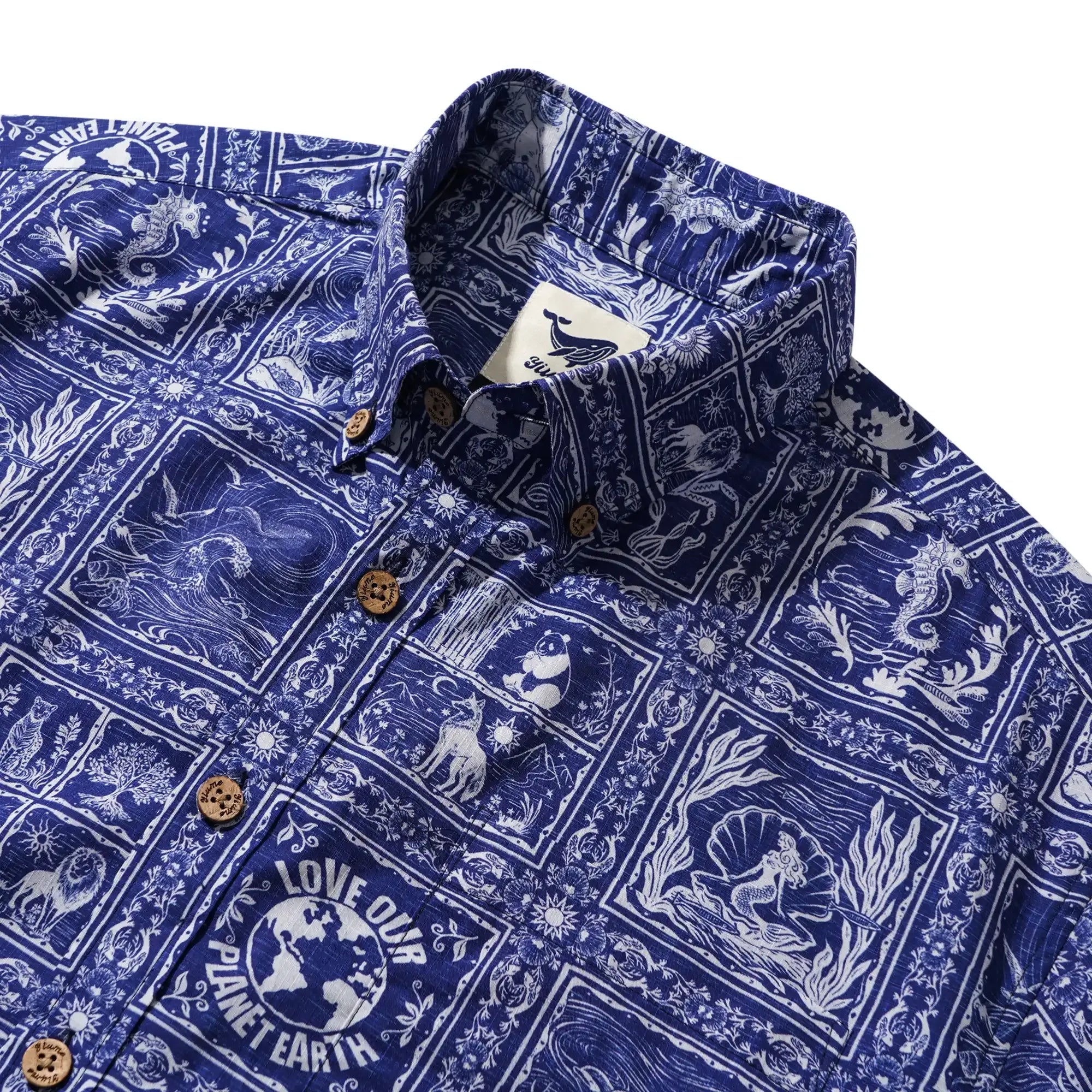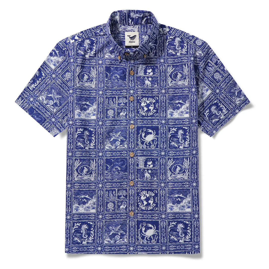 Men's Hawaiian Shirt Short Sleeve Button-down 100% Cotton Blue Aloha Endangered Animal Collage